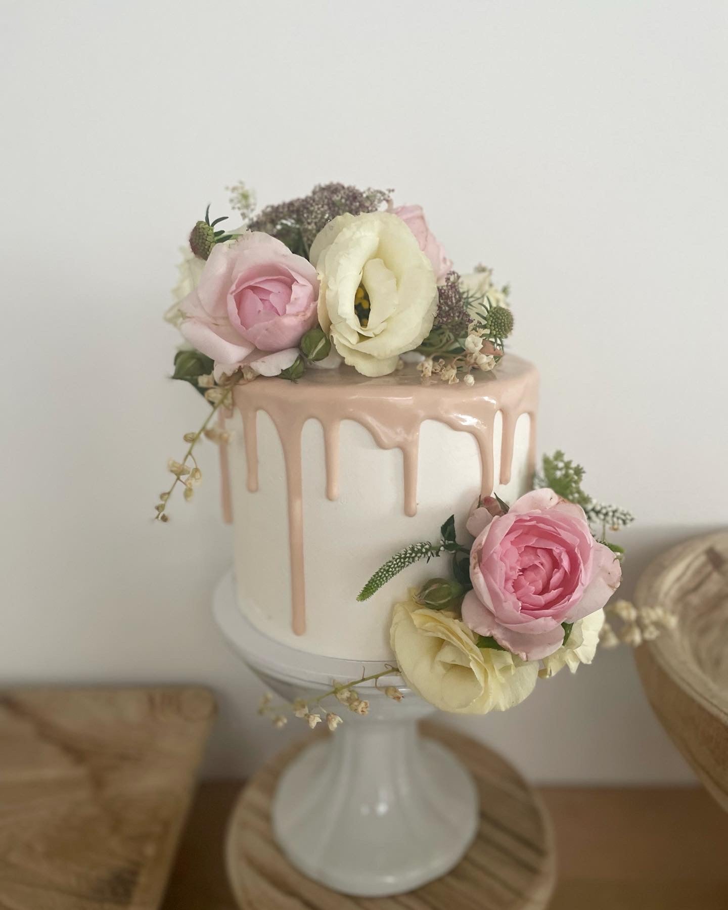Filled Sponge cake with your choice of coloured Buttercream Icing, Drizzle and finished with Fresh Flowers. (flowers may differ in different seasons, photos are just a example of design)