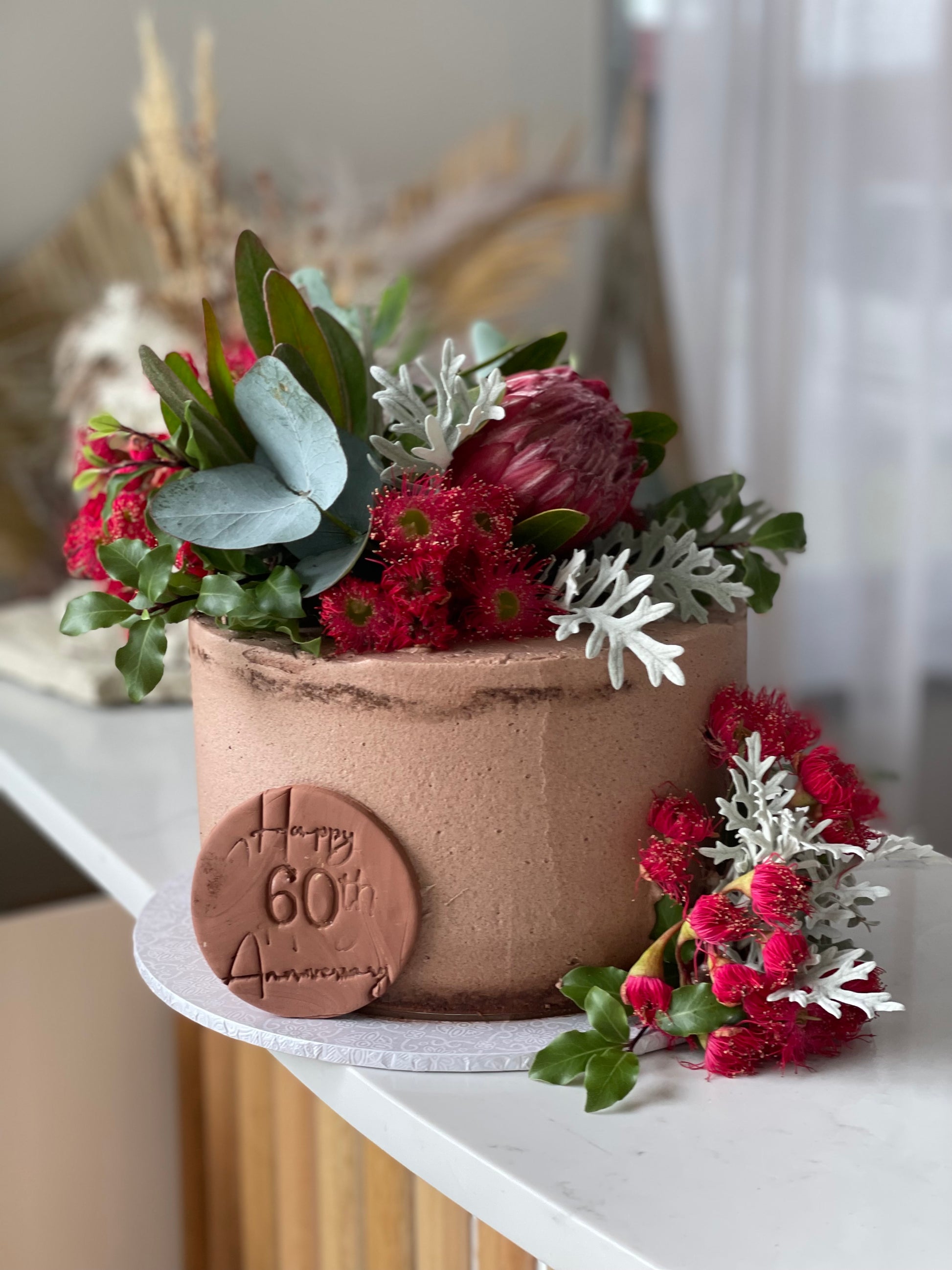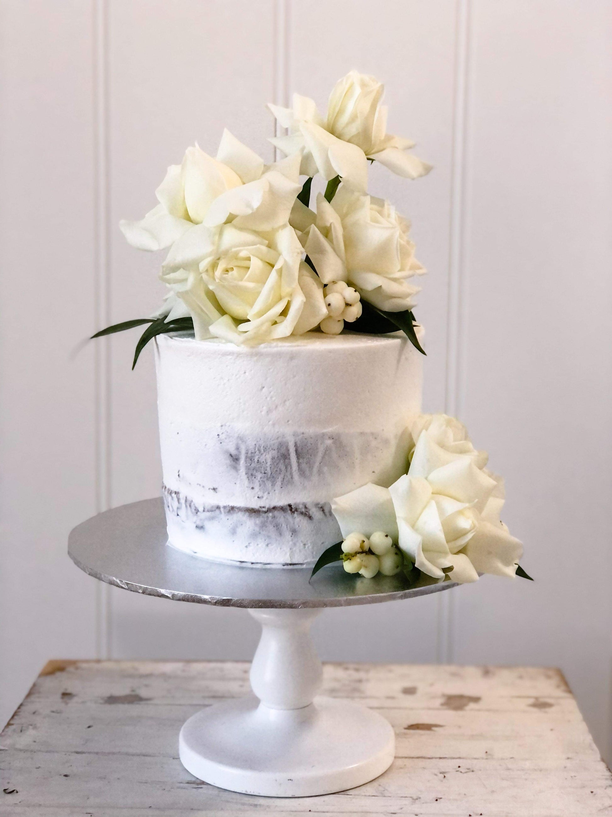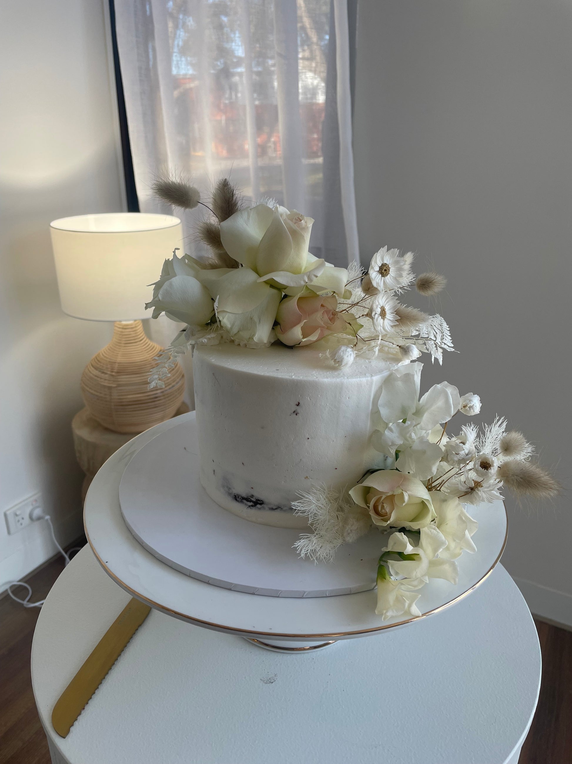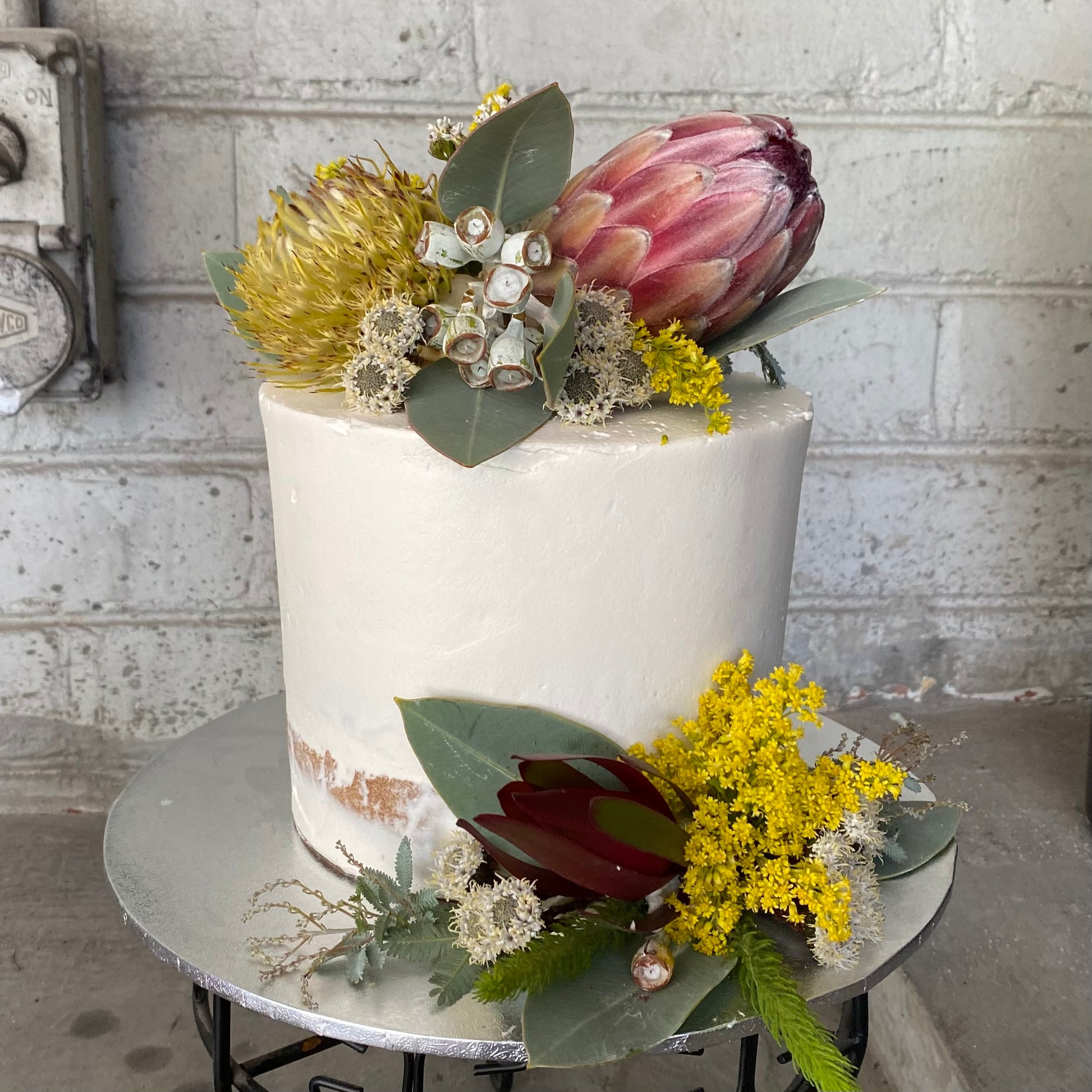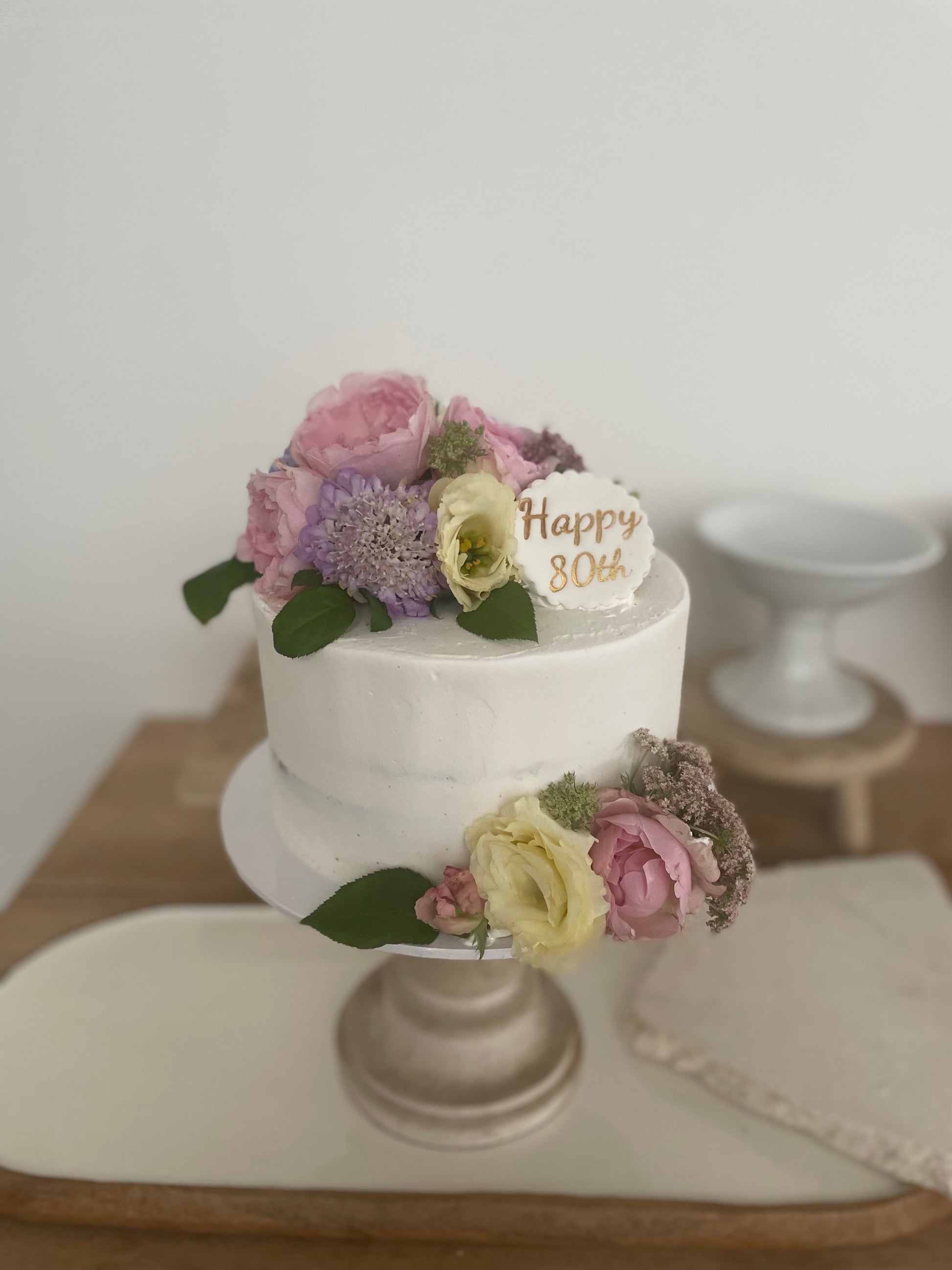 Filled sponge cake with a beautiful, rustic semi-naked buttercream finish, topped with fresh flowers. (flowers may differ in different seasons, photos are just a example of design)