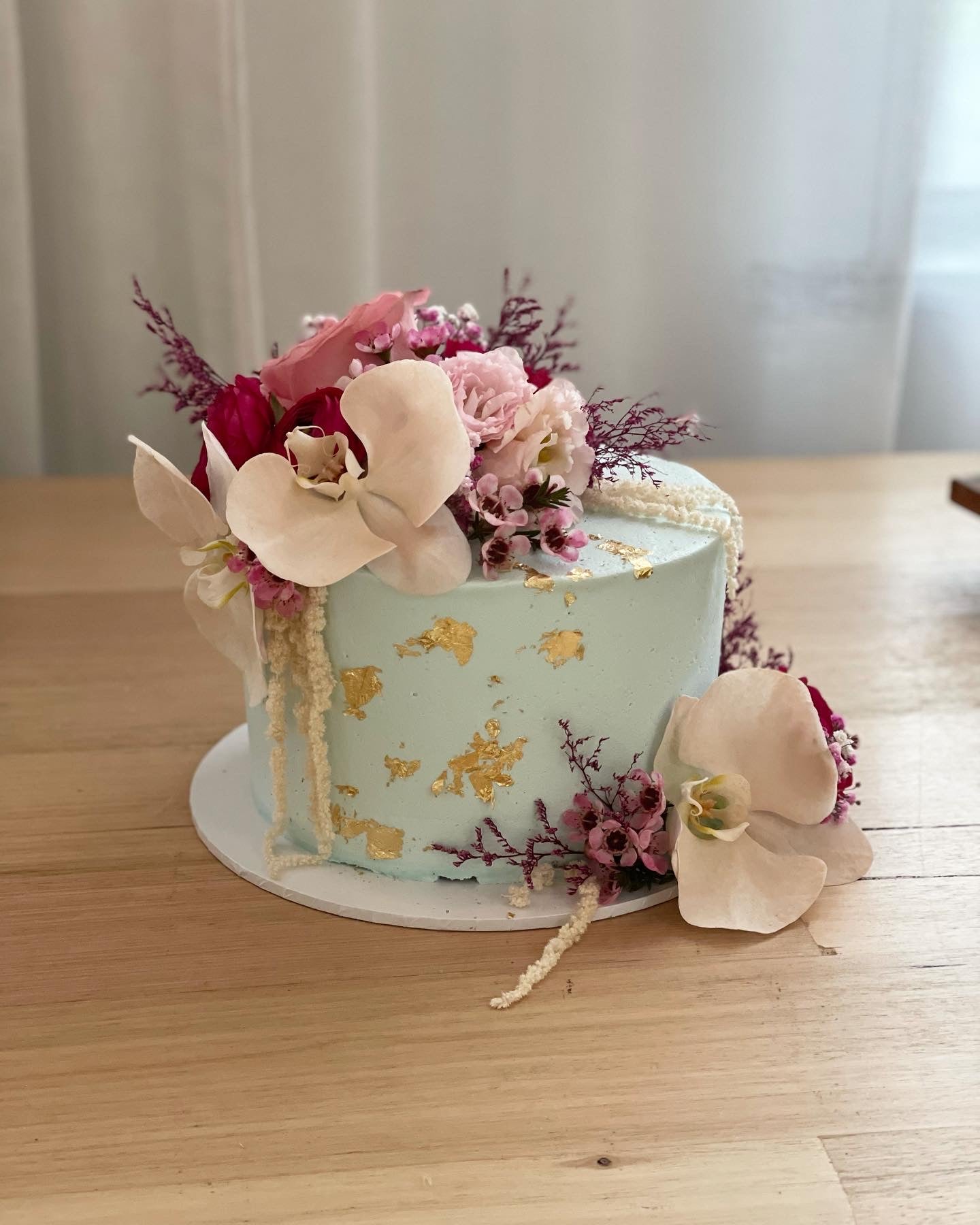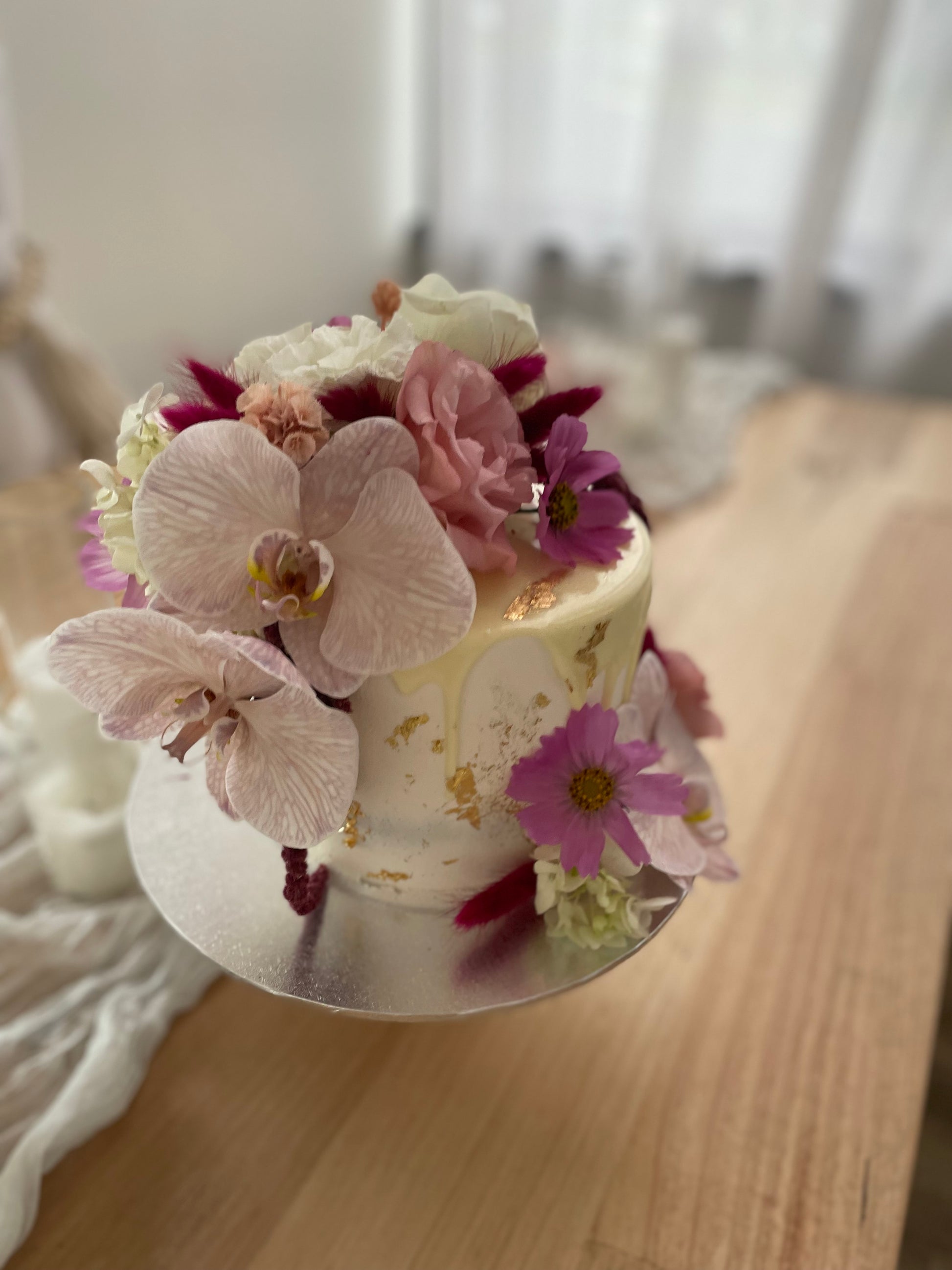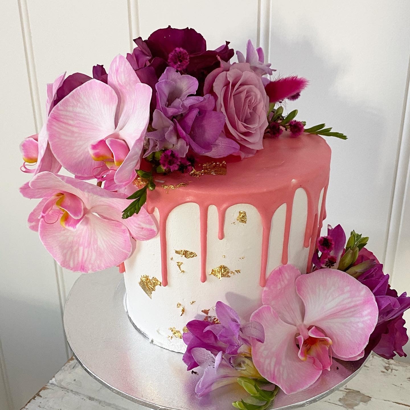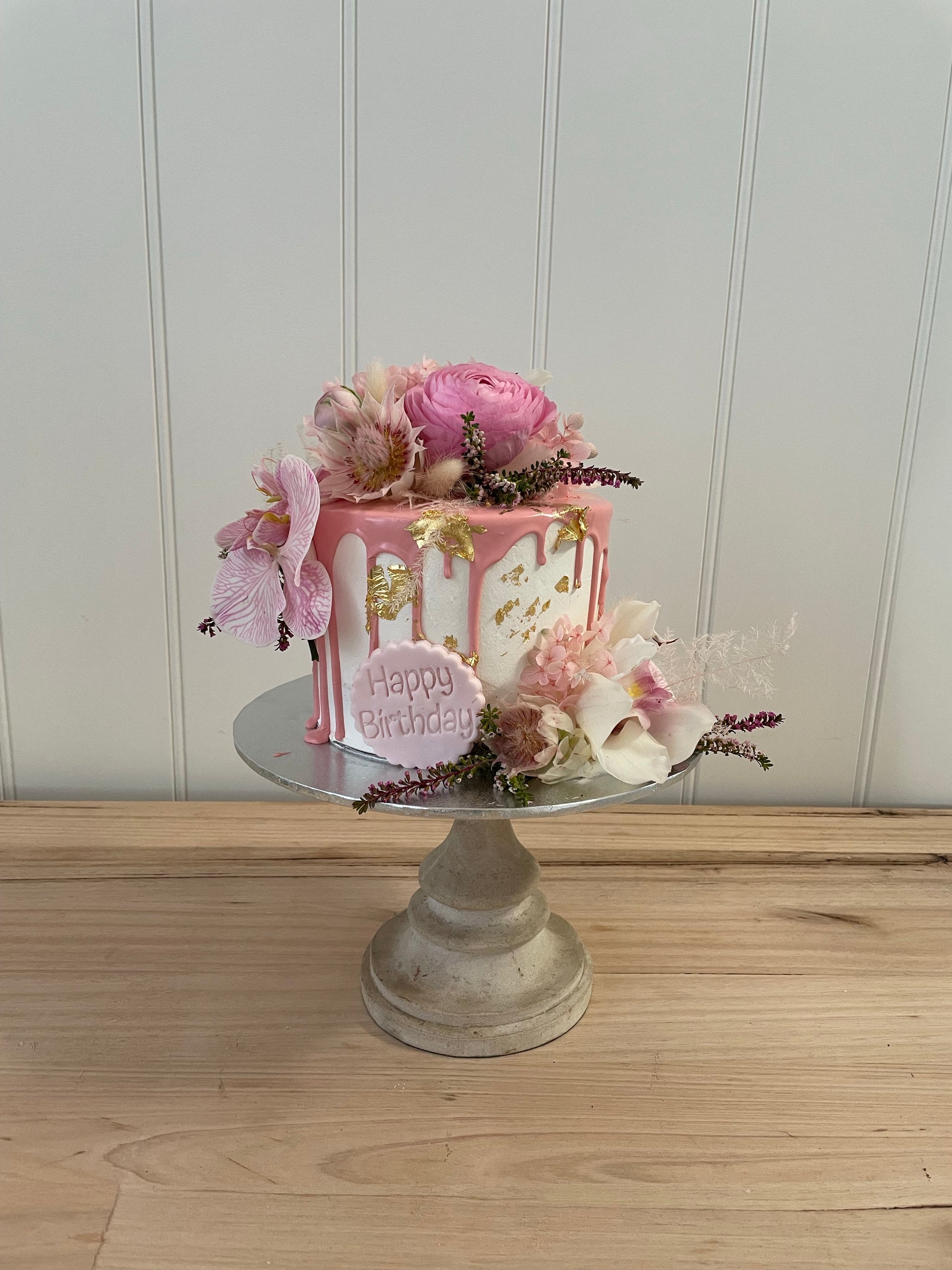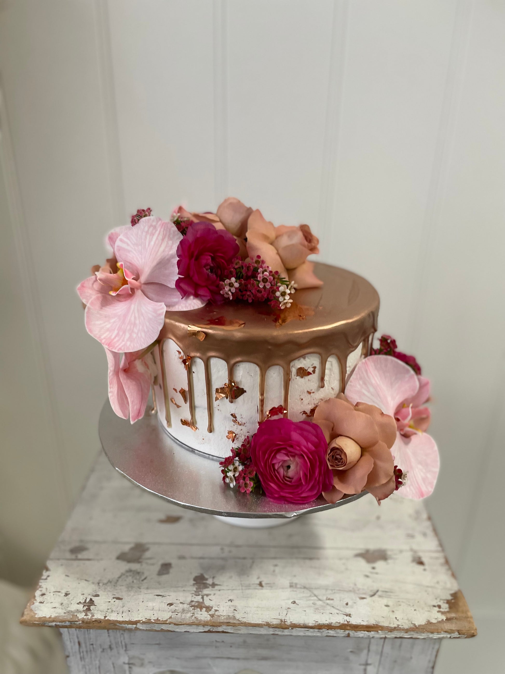 Filled Sponge cake with your choice of coloured Buttercream Icing, Drizzle gold foil and finished with Fresh Flowers. (flowers may differ in different seasons, photos are just a example of design)