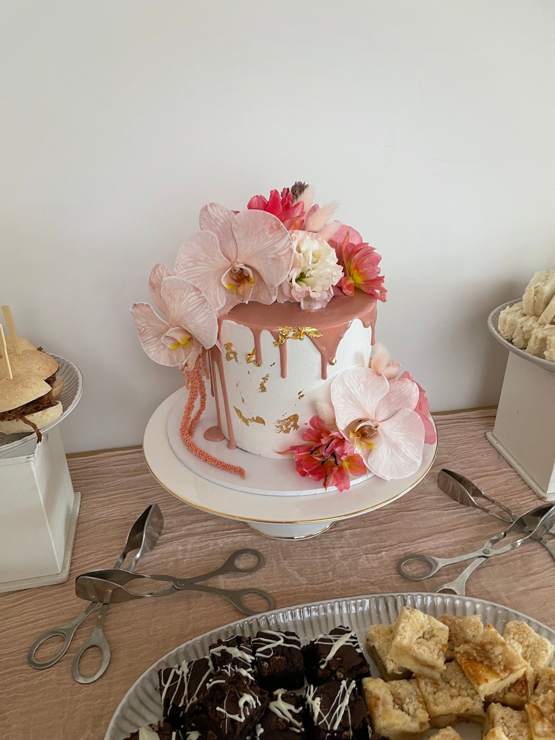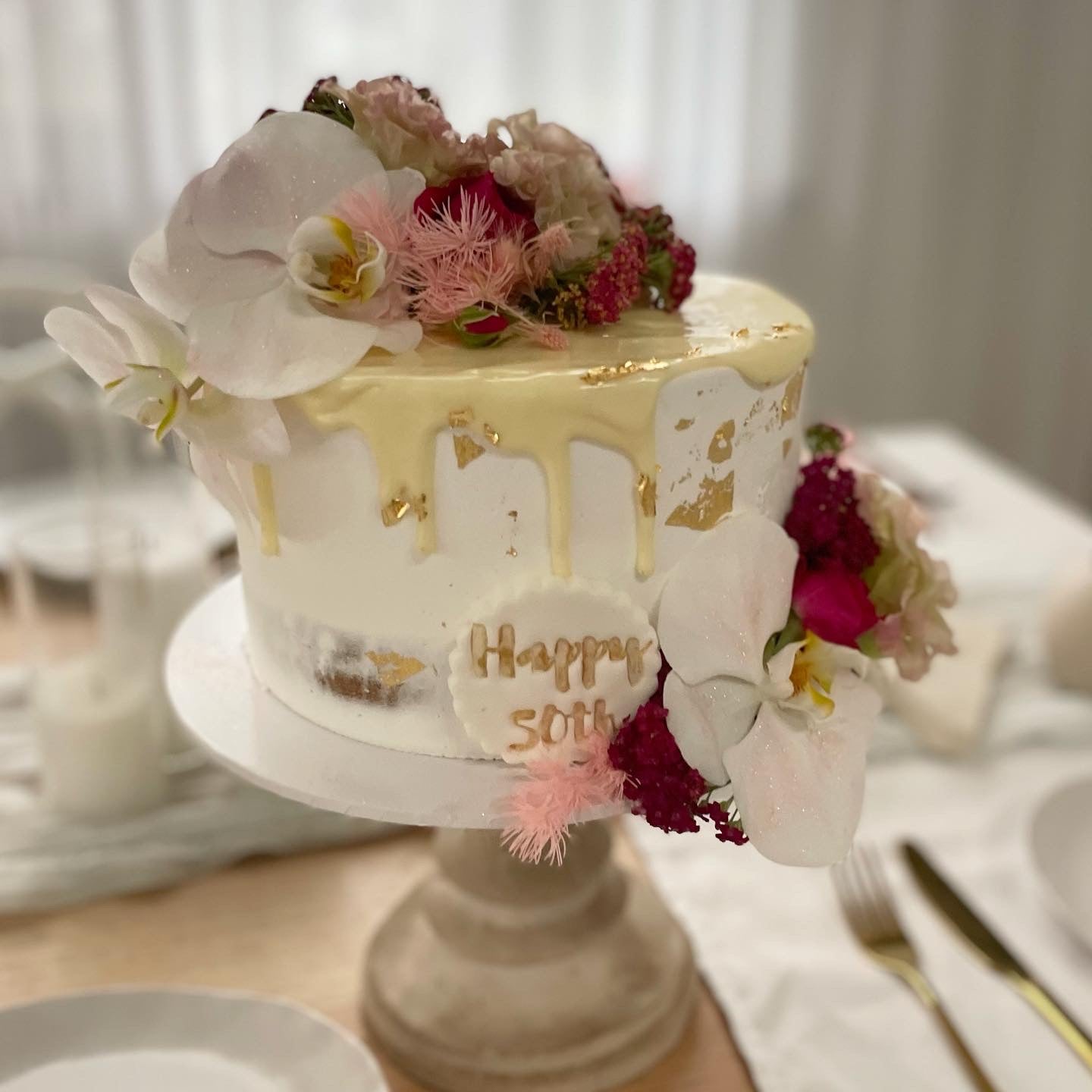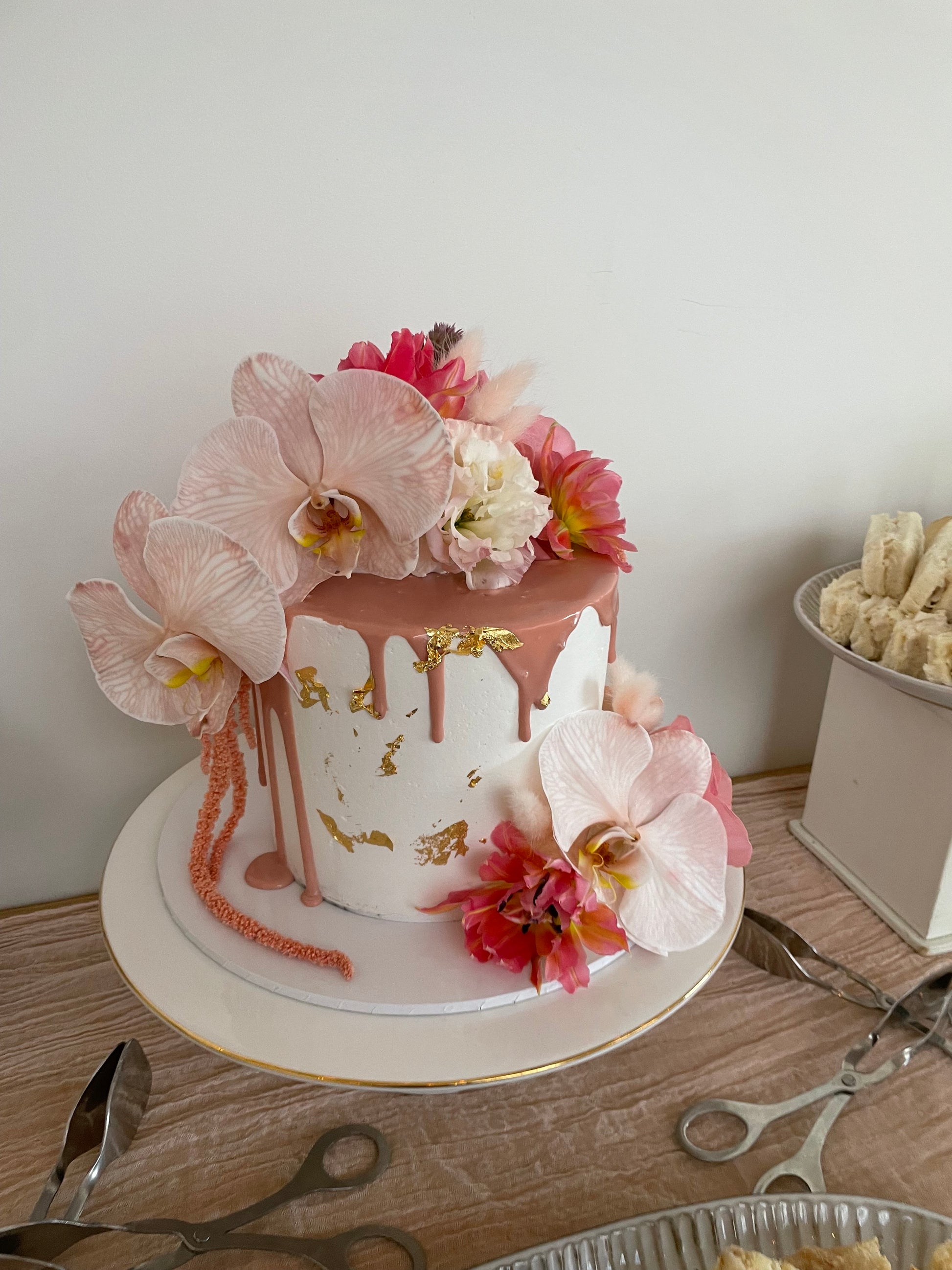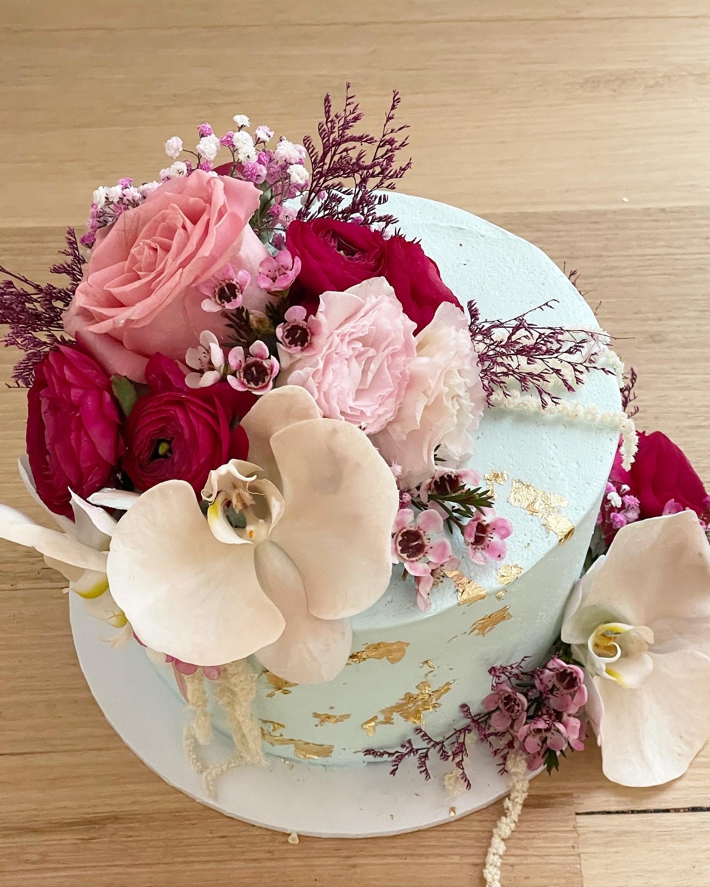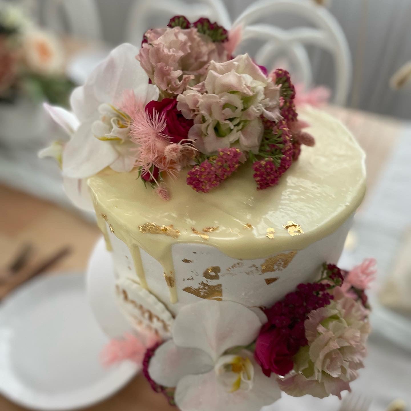 Filled Sponge cake with your choice of coloured Buttercream Icing, Drizzle gold foil and finished with Fresh Flowers. (flowers may differ in different seasons, photos are just a example of design)