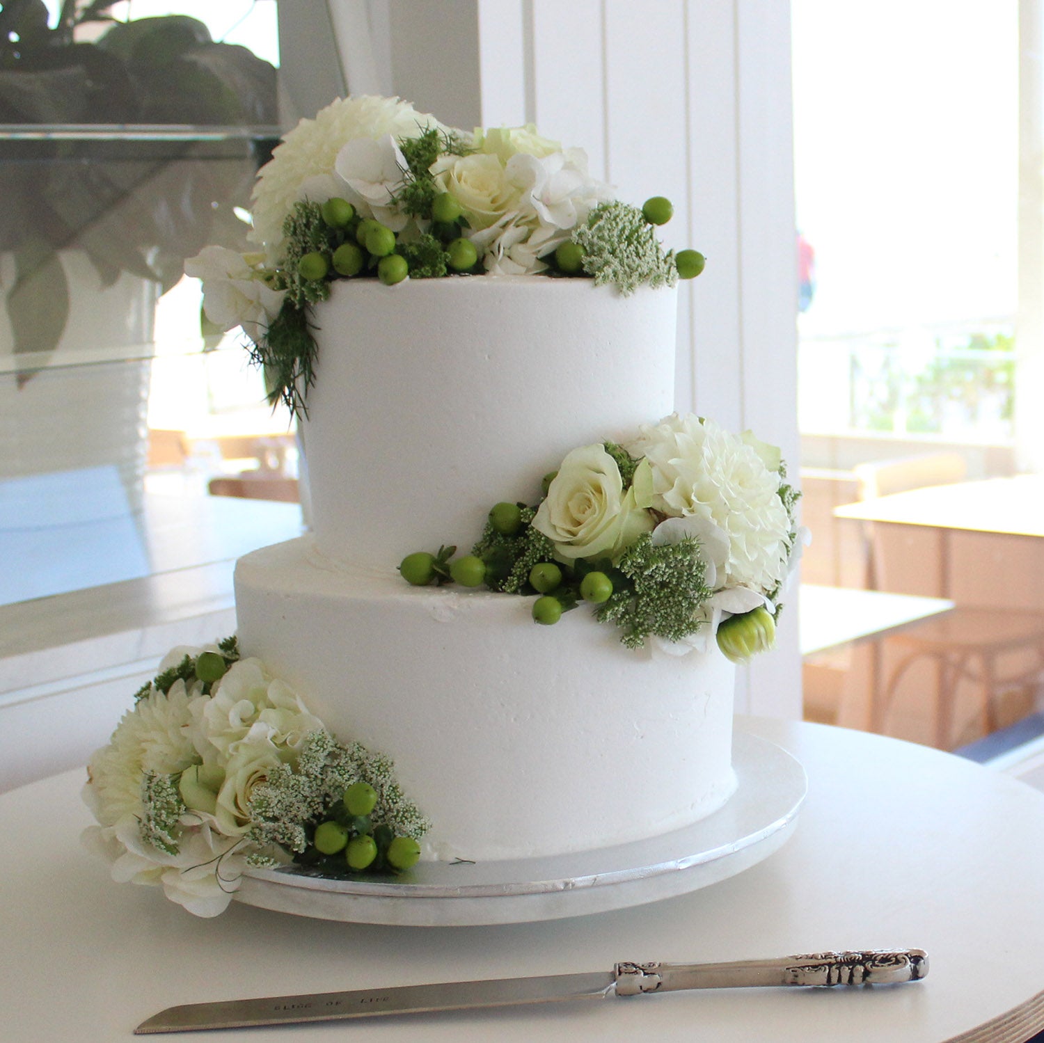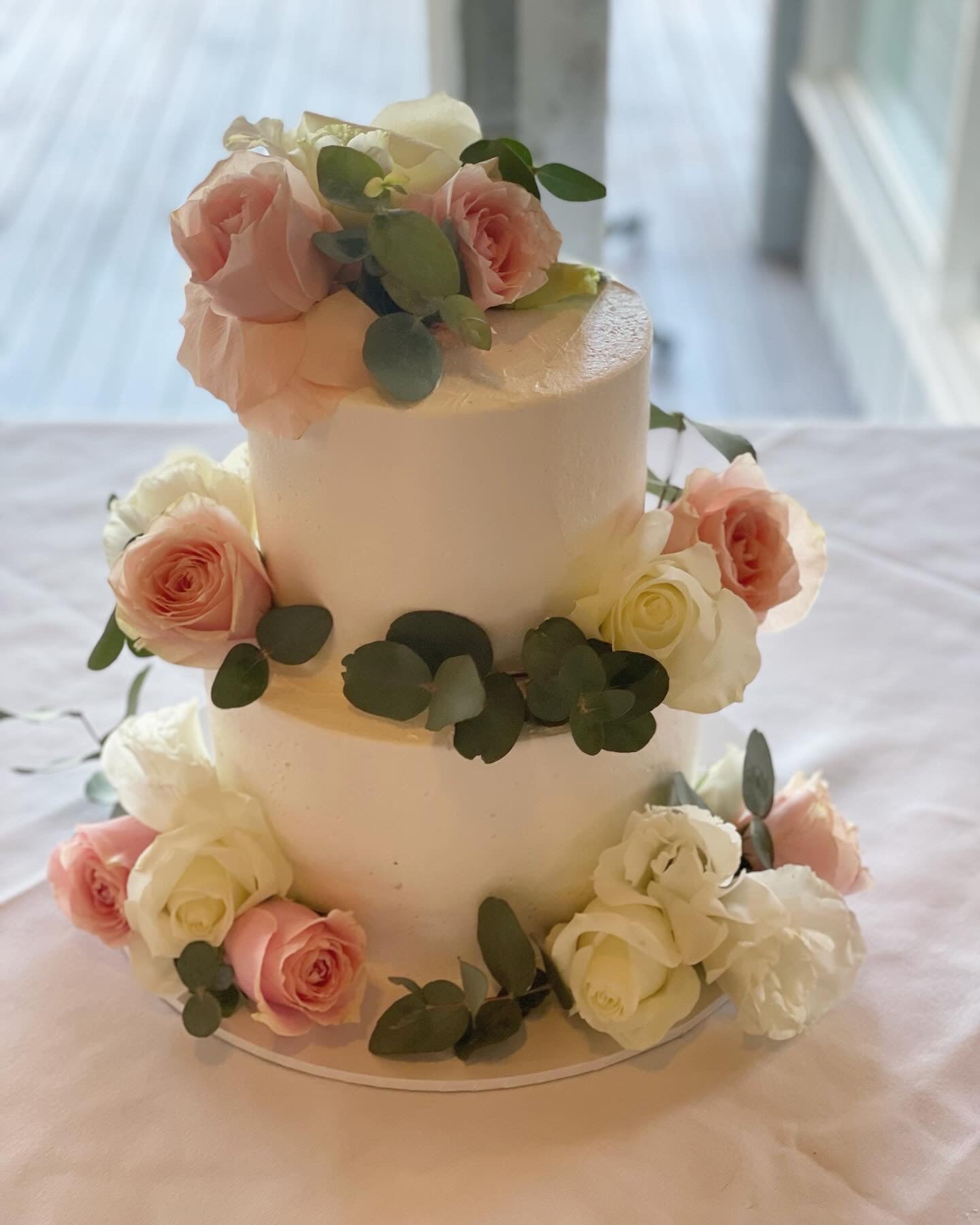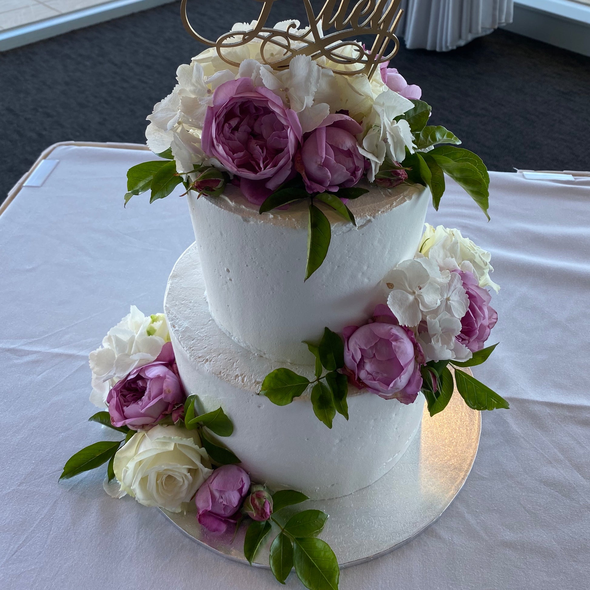 2 tier with buttercream icing and Scatted fresh Seasonal flowers.