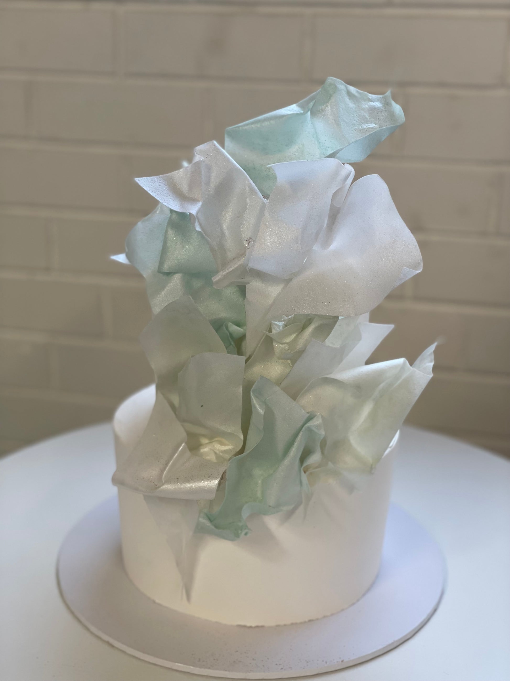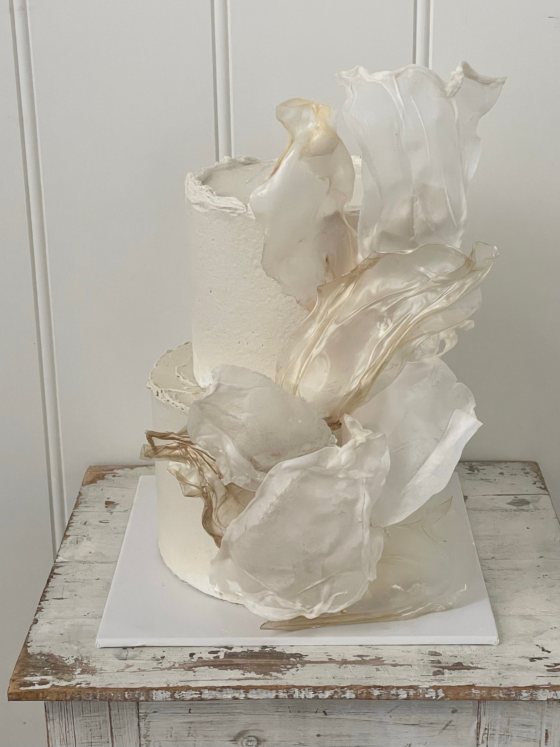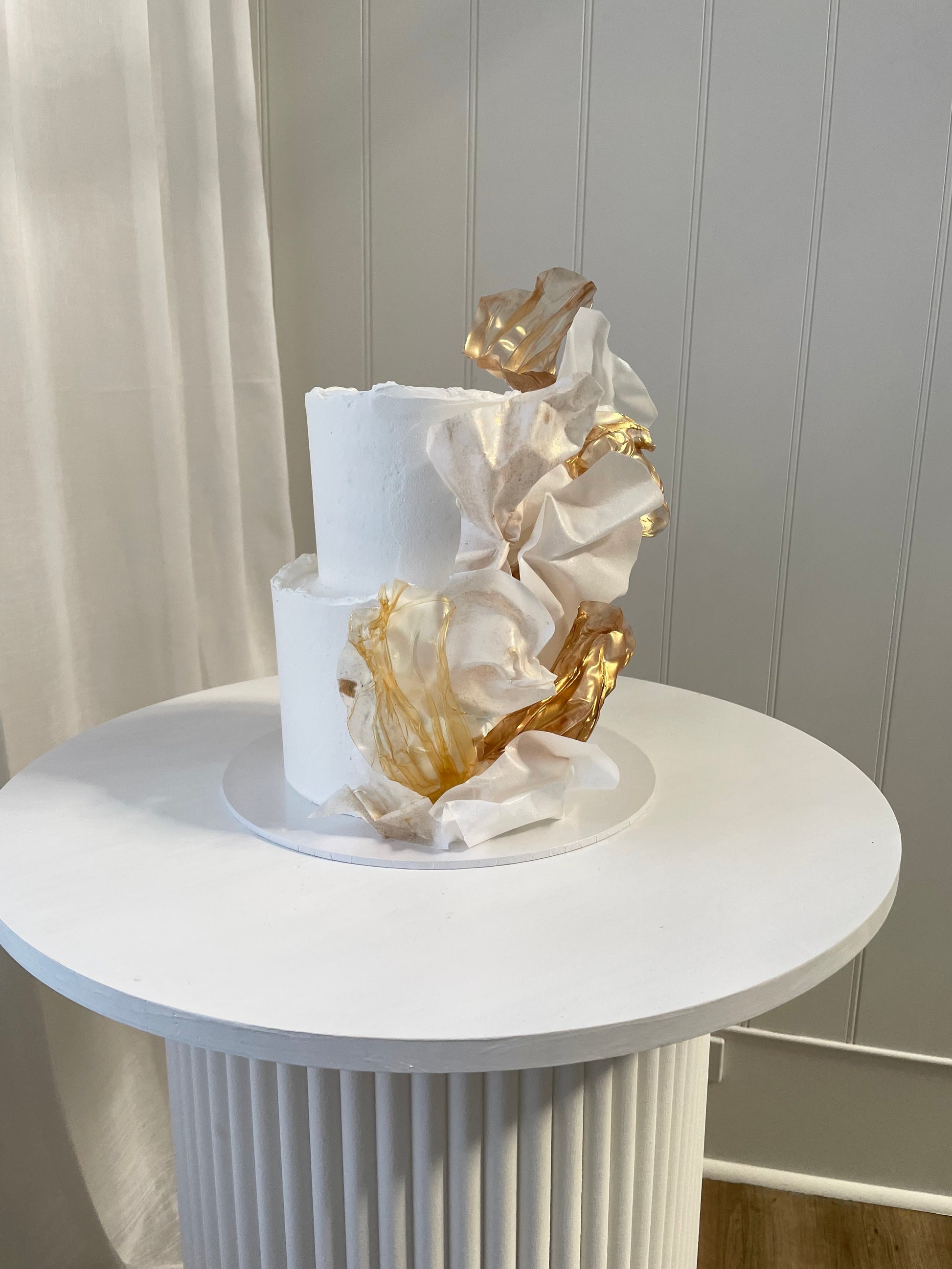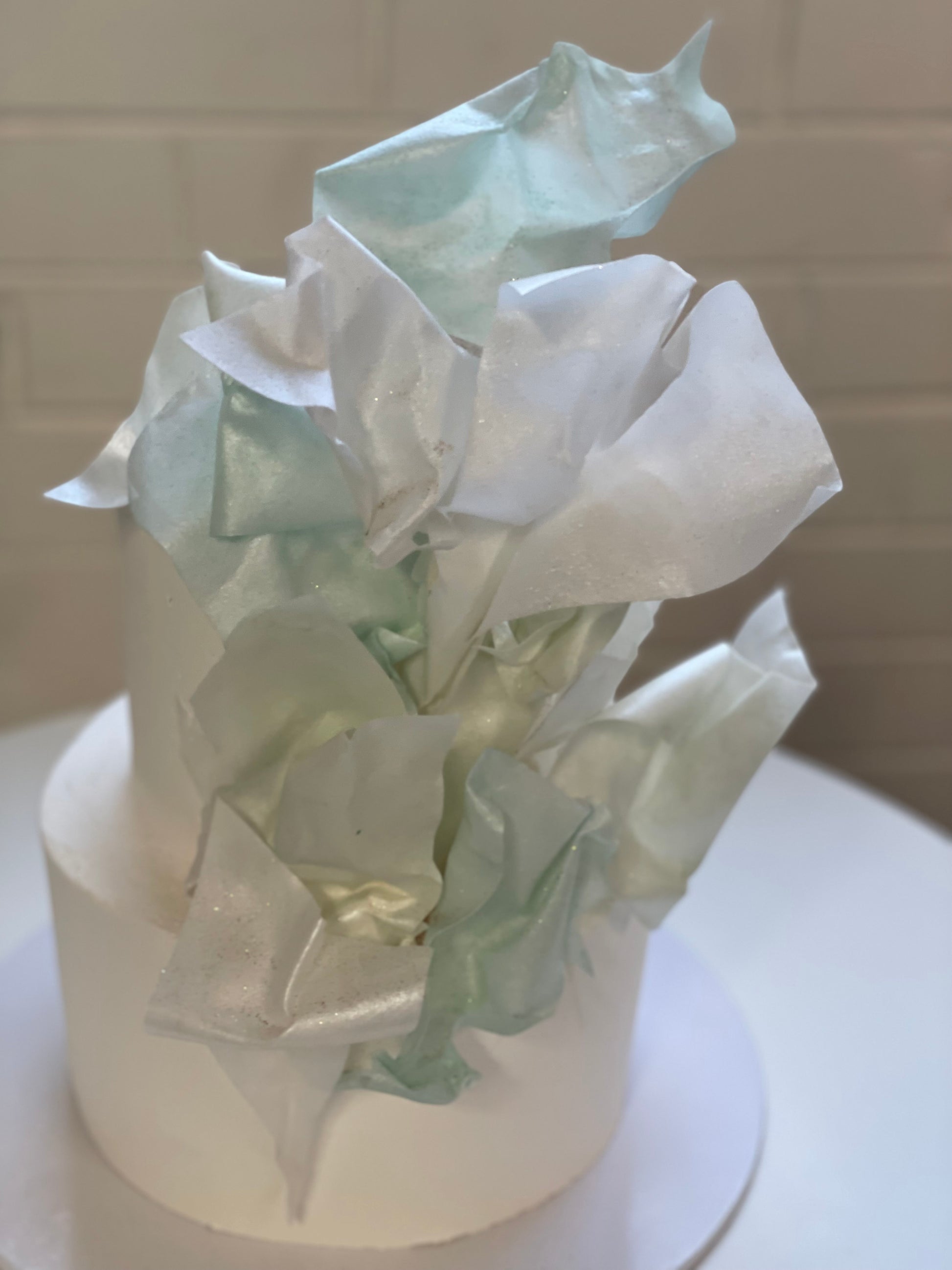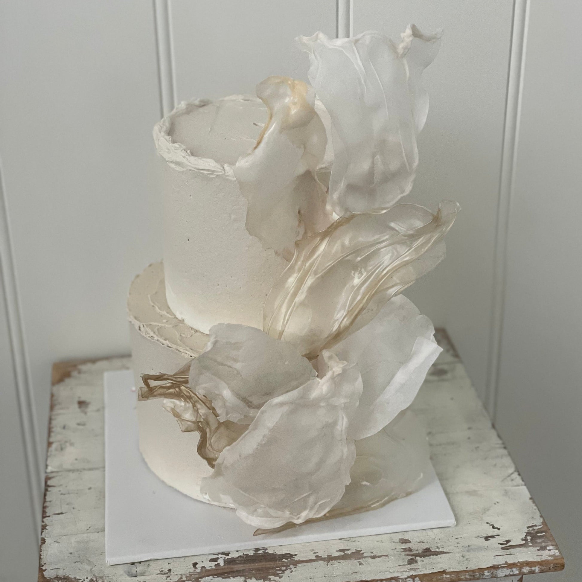 2 tier with buttercream icing and soft flowing rice paper sails