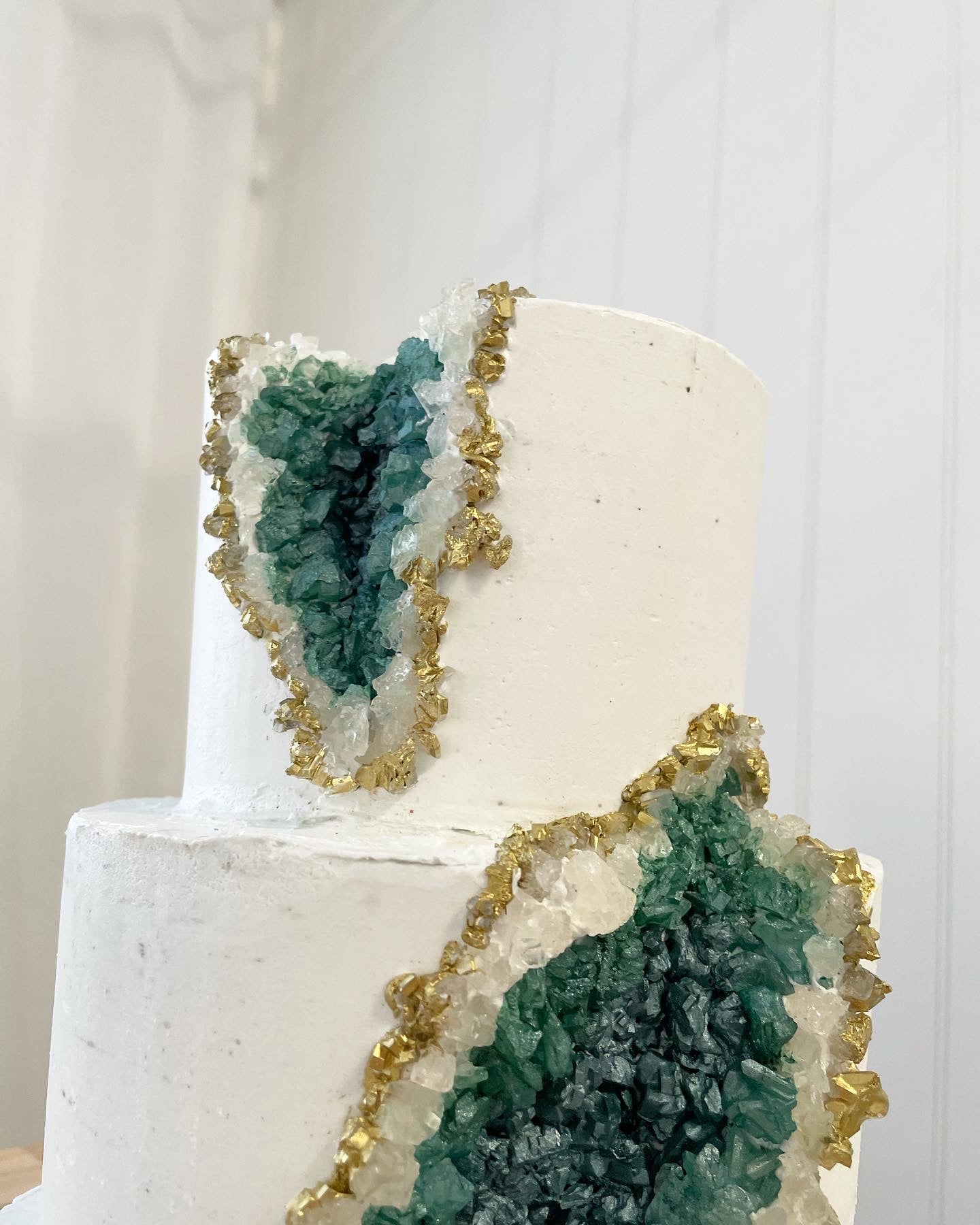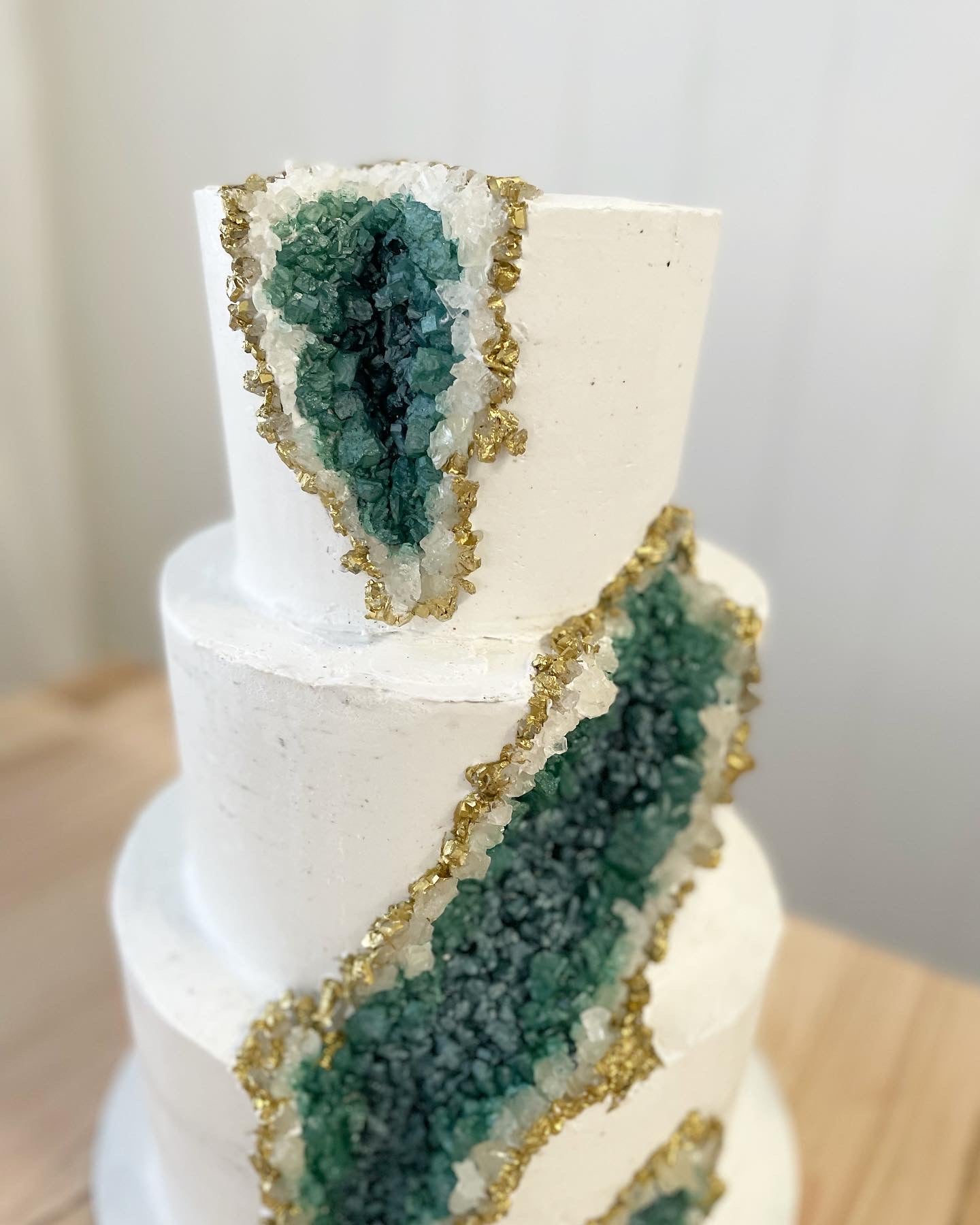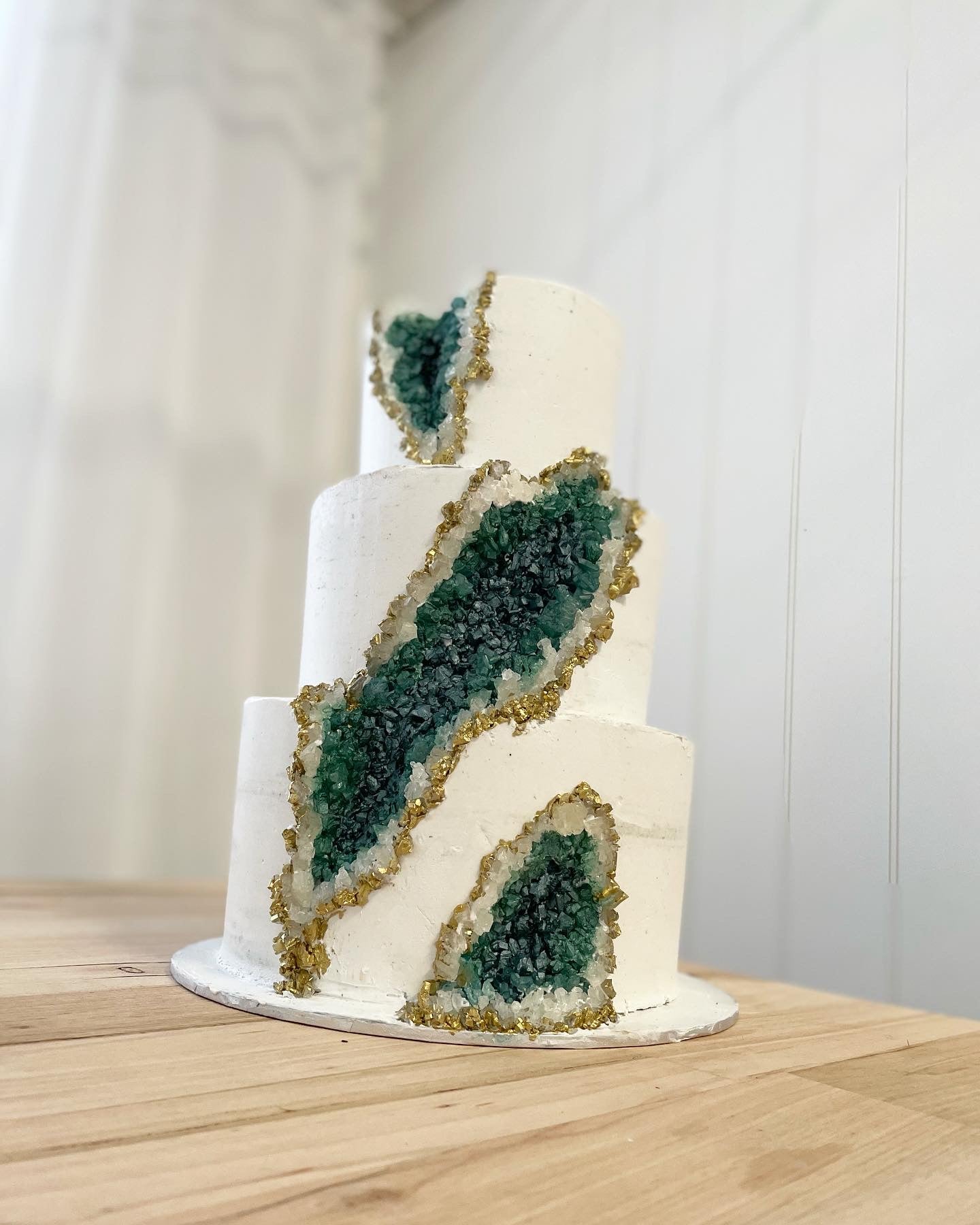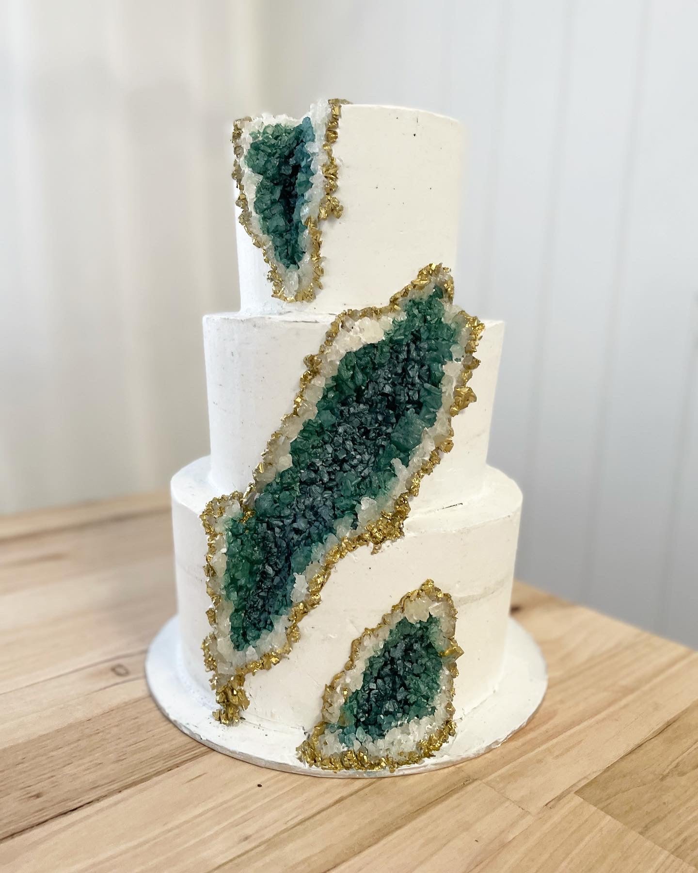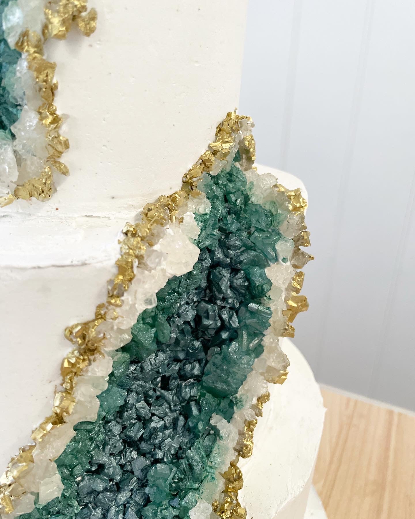 Filled Sponge cake with your choice of coloured Buttercream Icing. Finished with sugar crystals of your colour choice, and metallic edging.