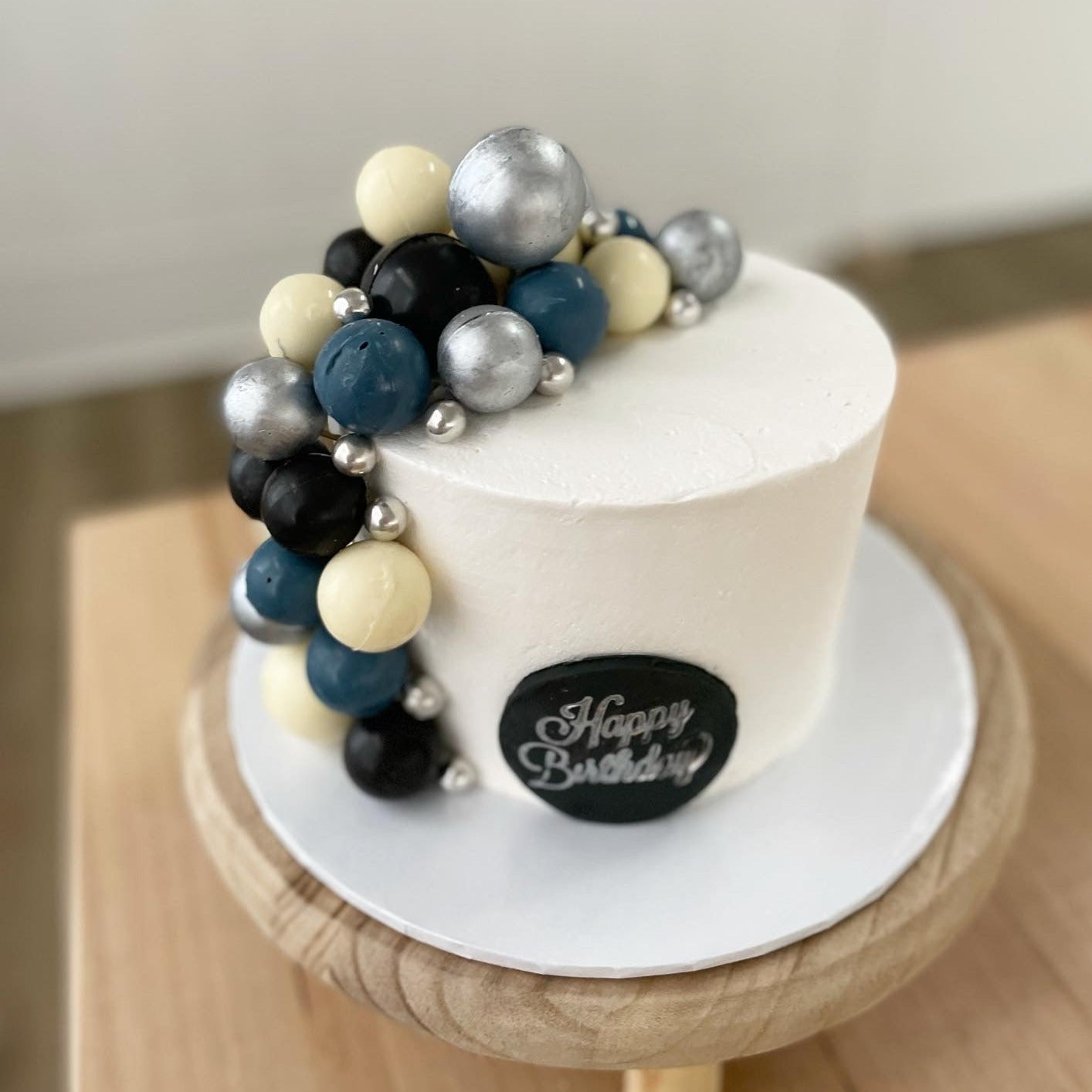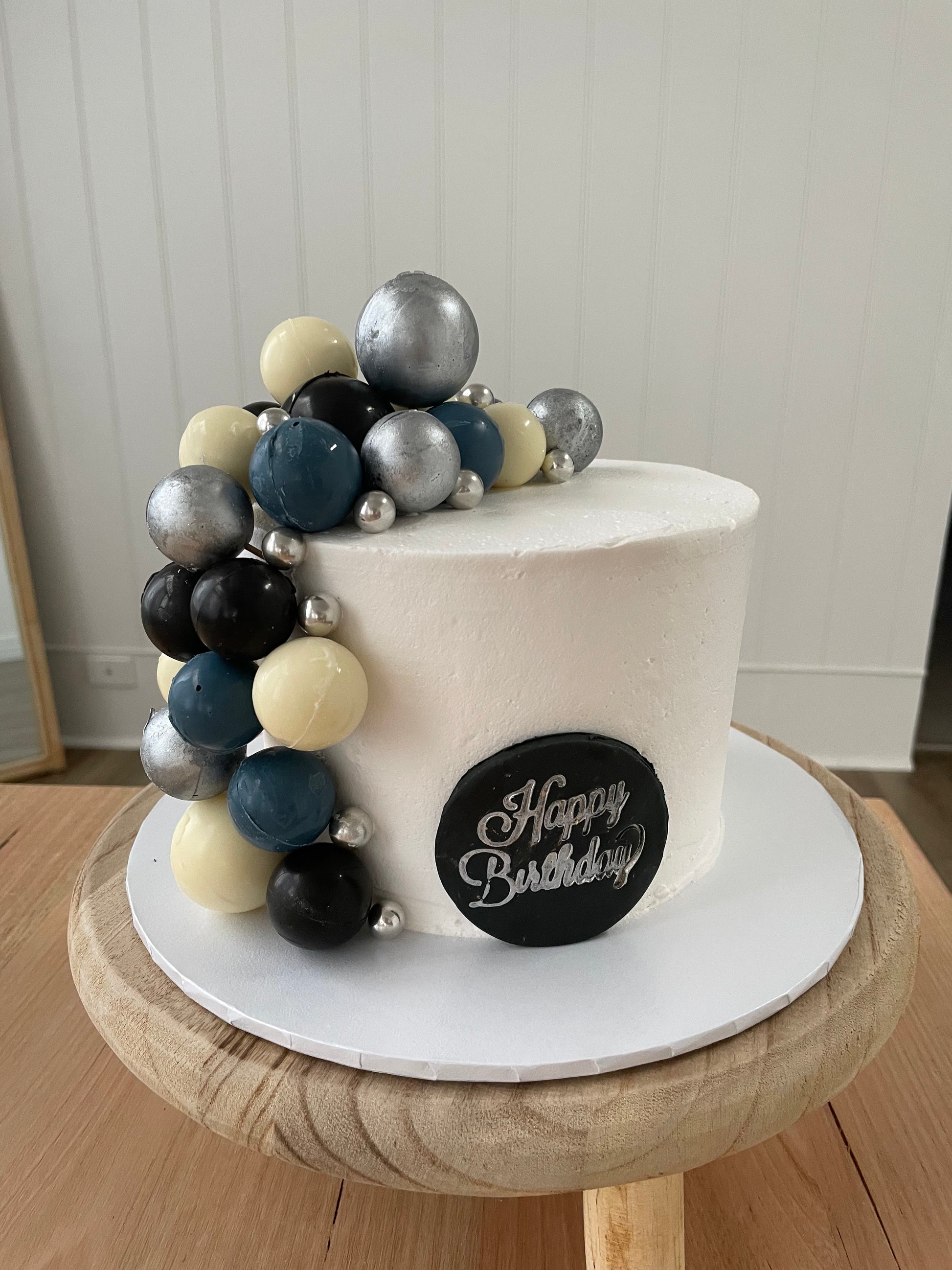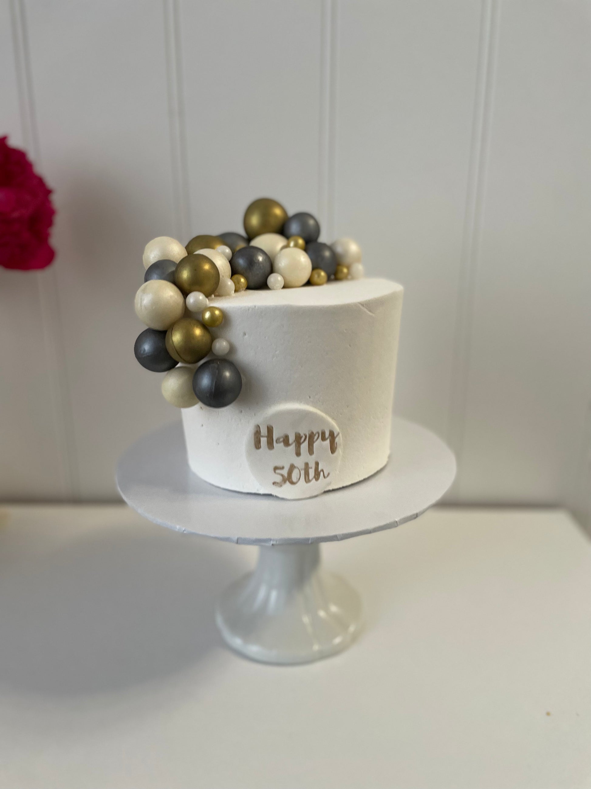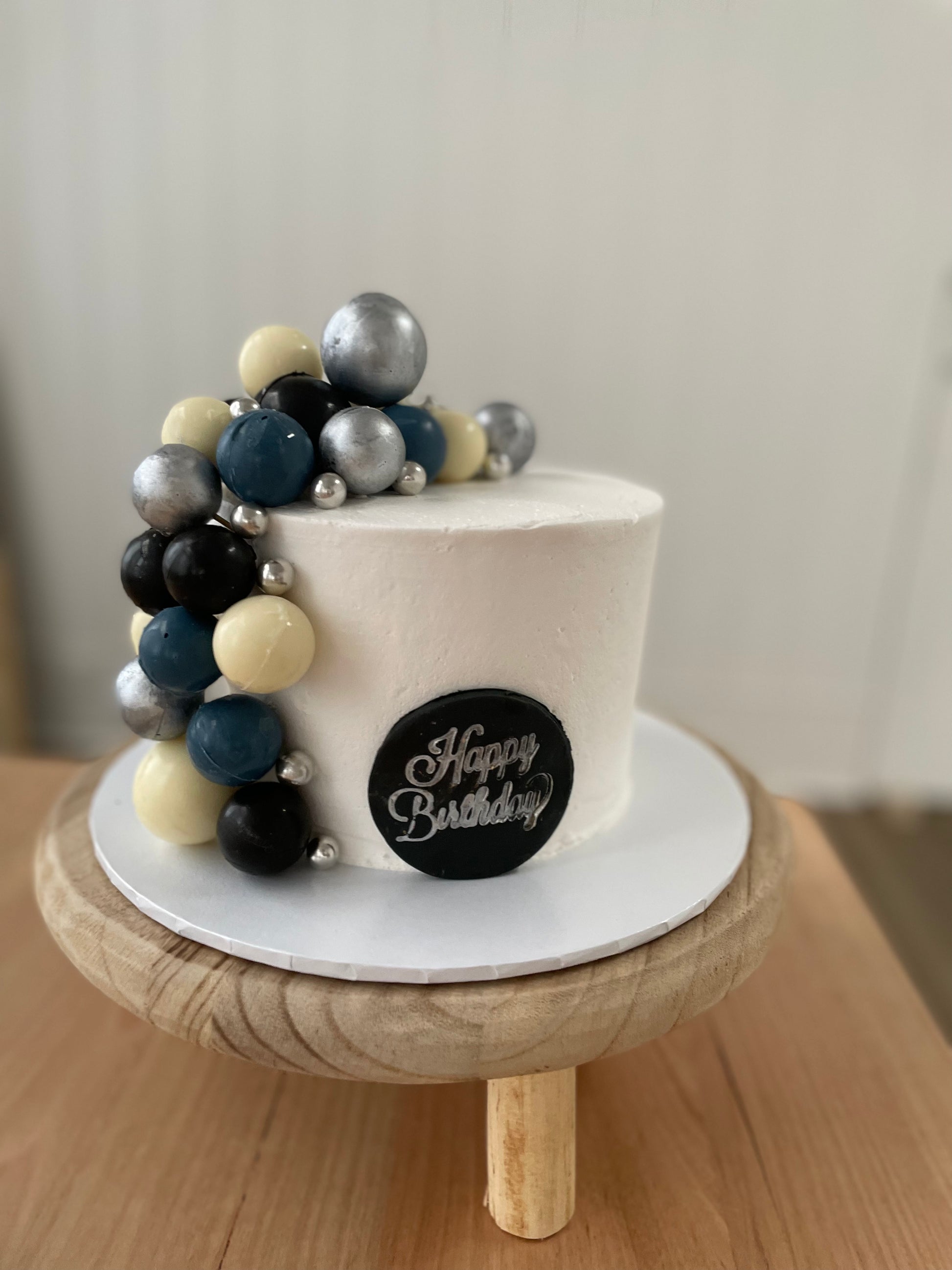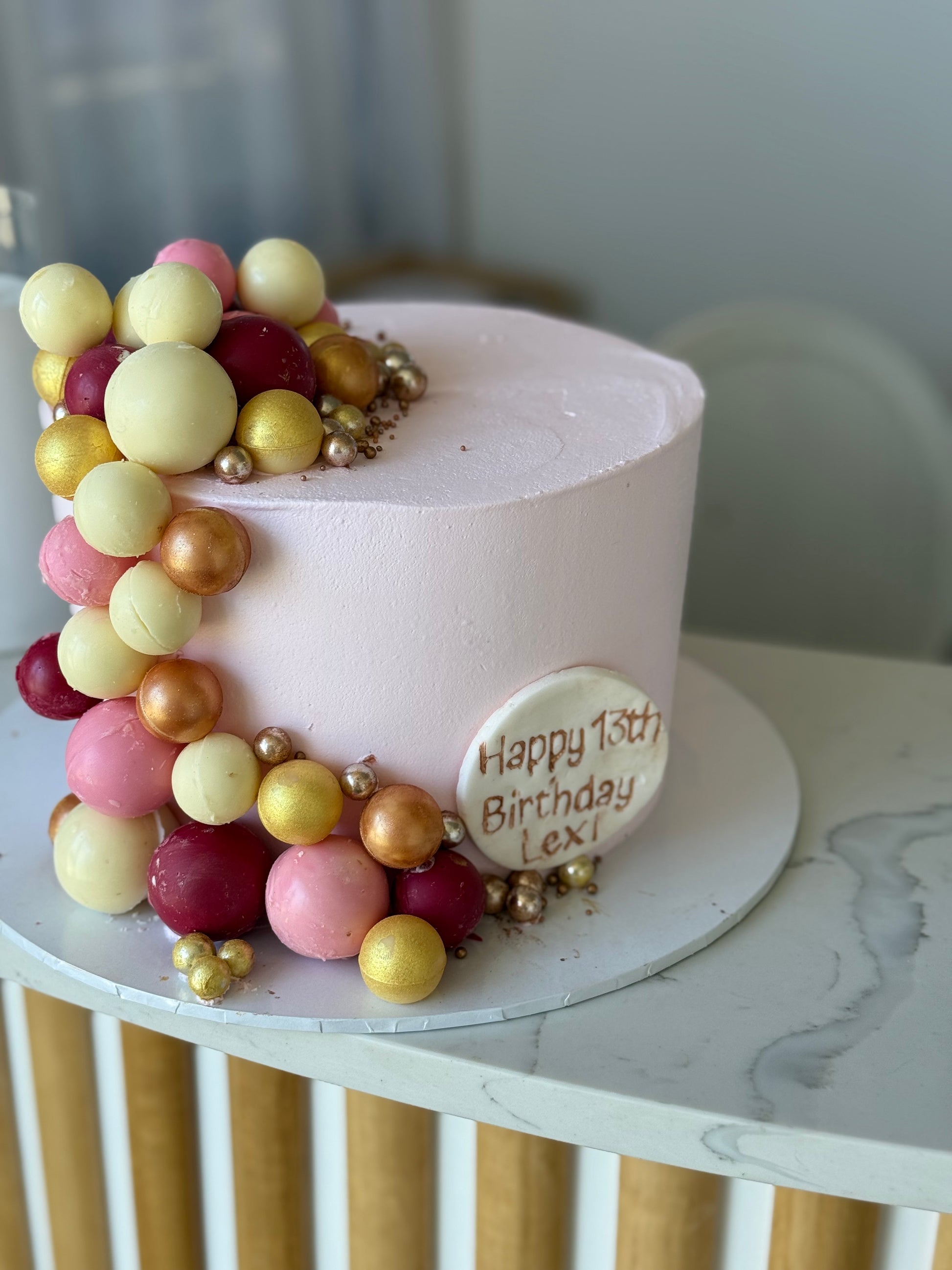 Filled sponge cake with smooth buttercream icing. Finished with balloon garland in either single or double garland. Your choice of colours.