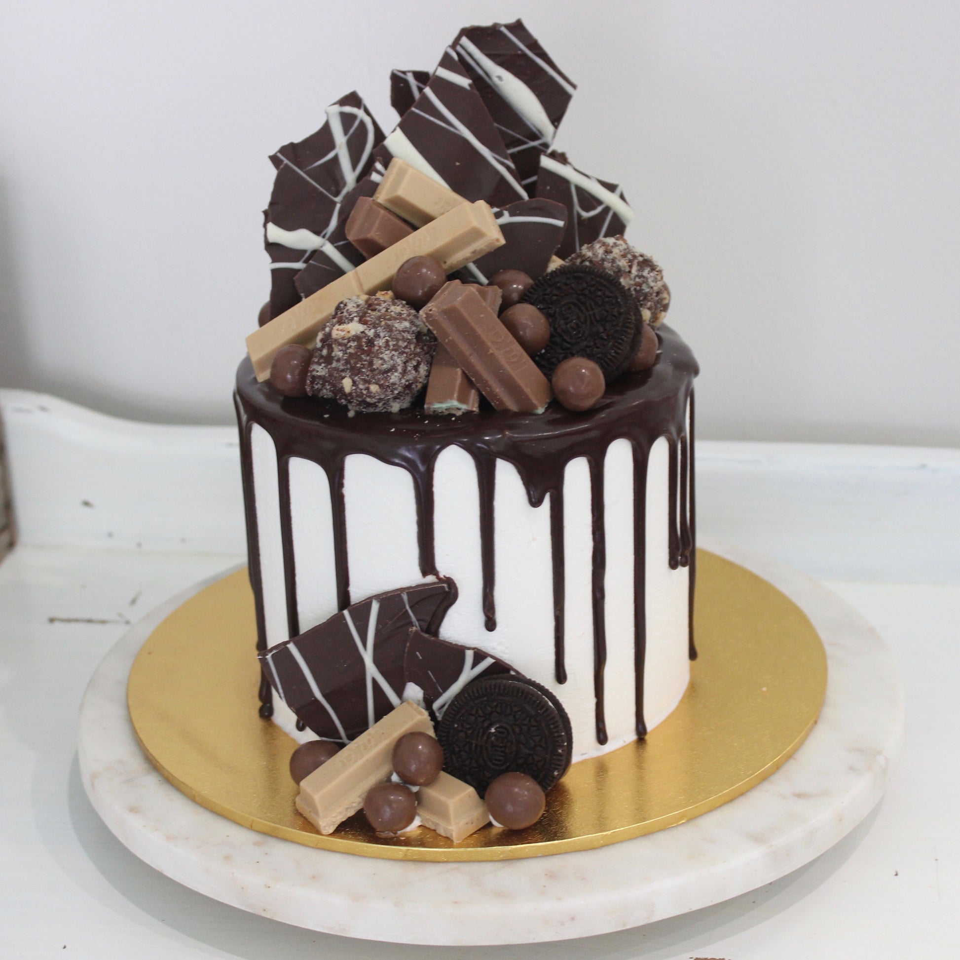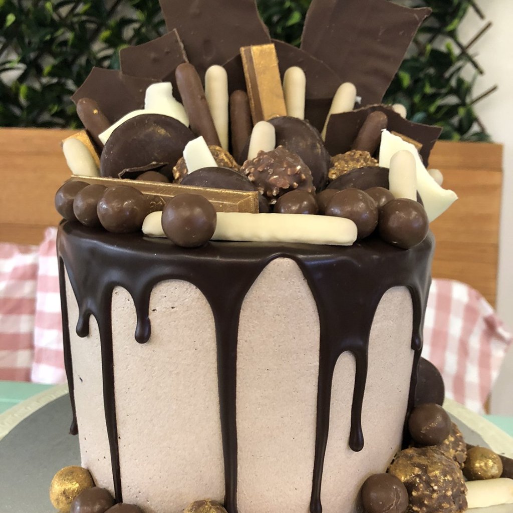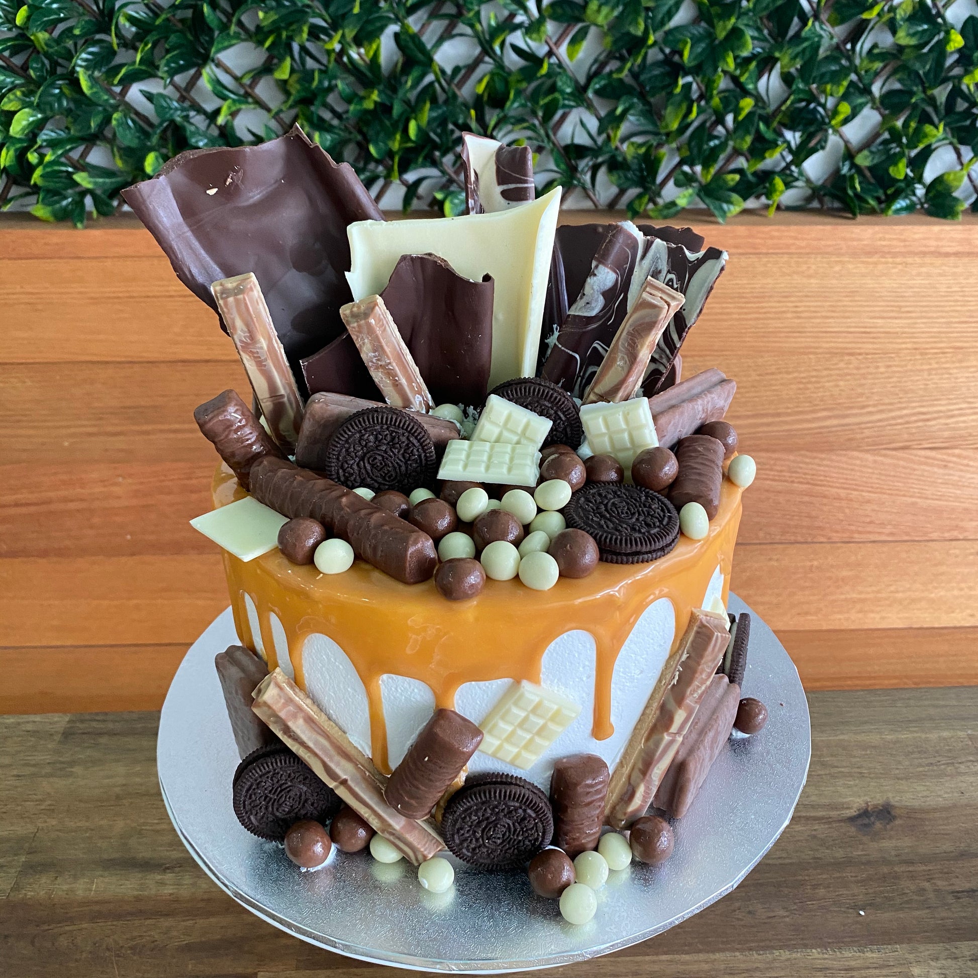 Filled sponge cake with smooth buttercream icing. Chocolate drizzled, finished with chocolate shards, chocolate lollies can chocolate bars. you choose your colours and we will do the rest.