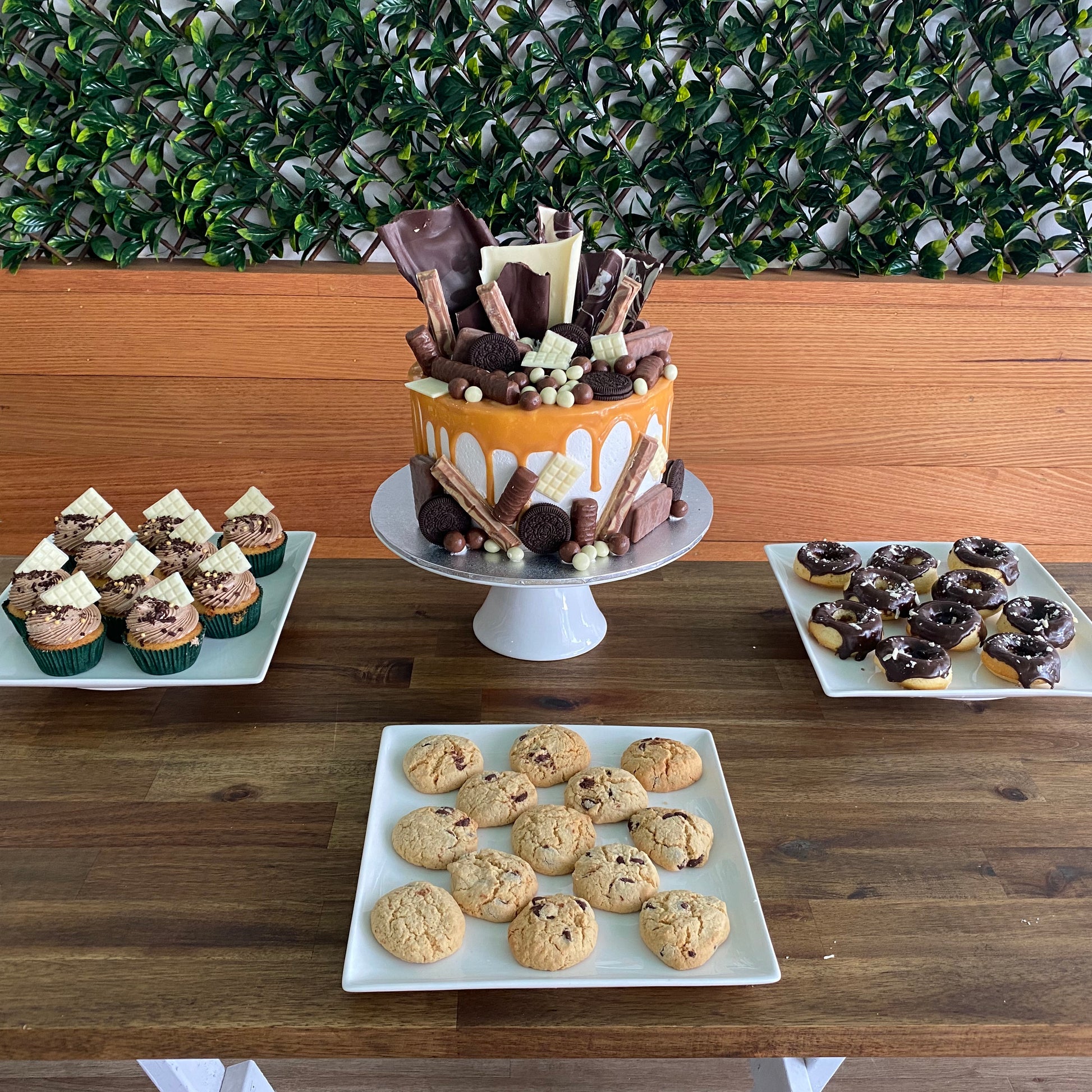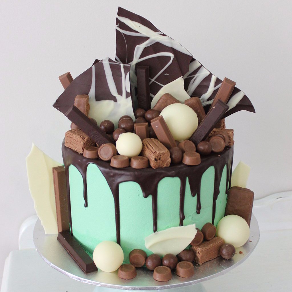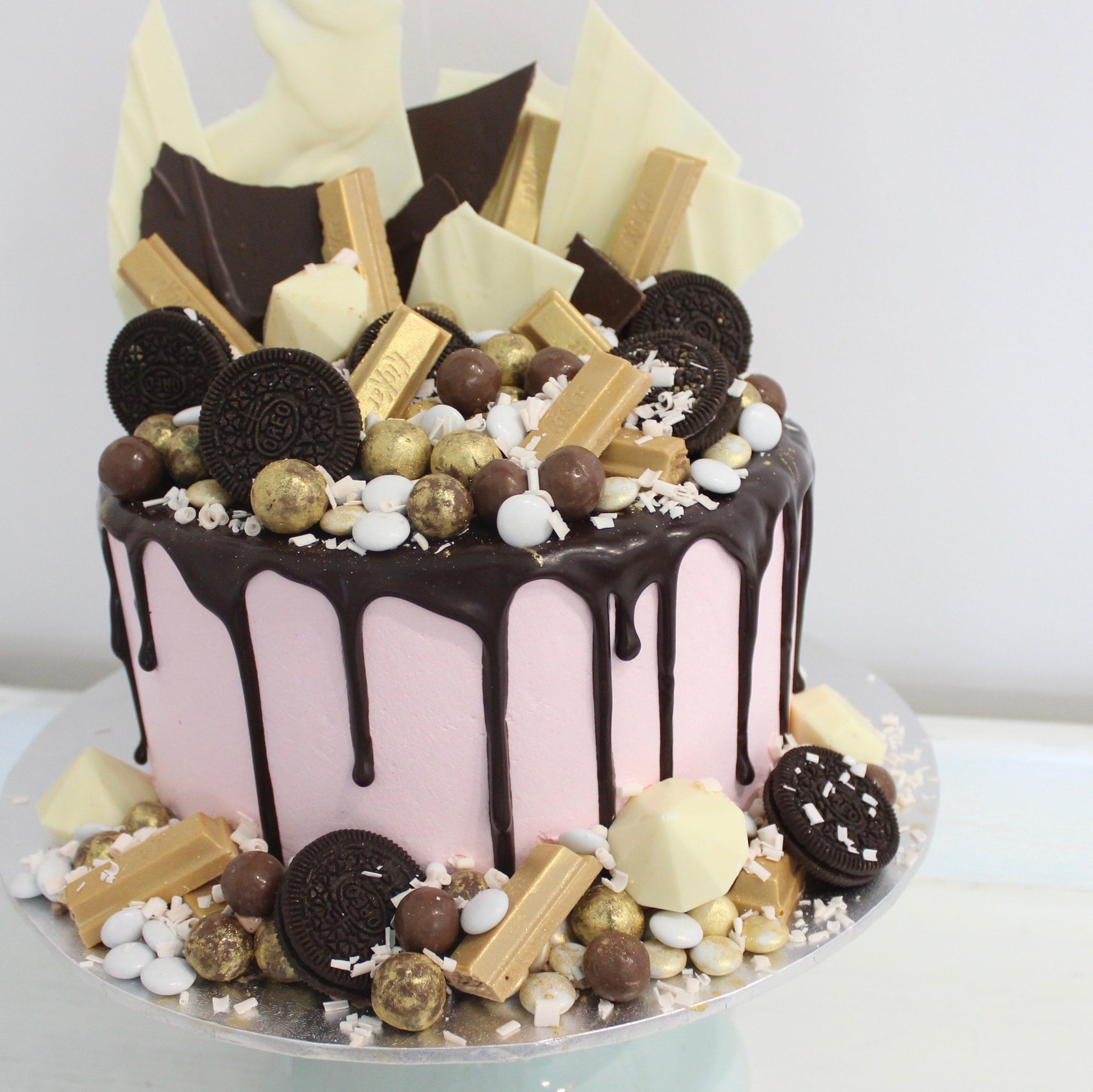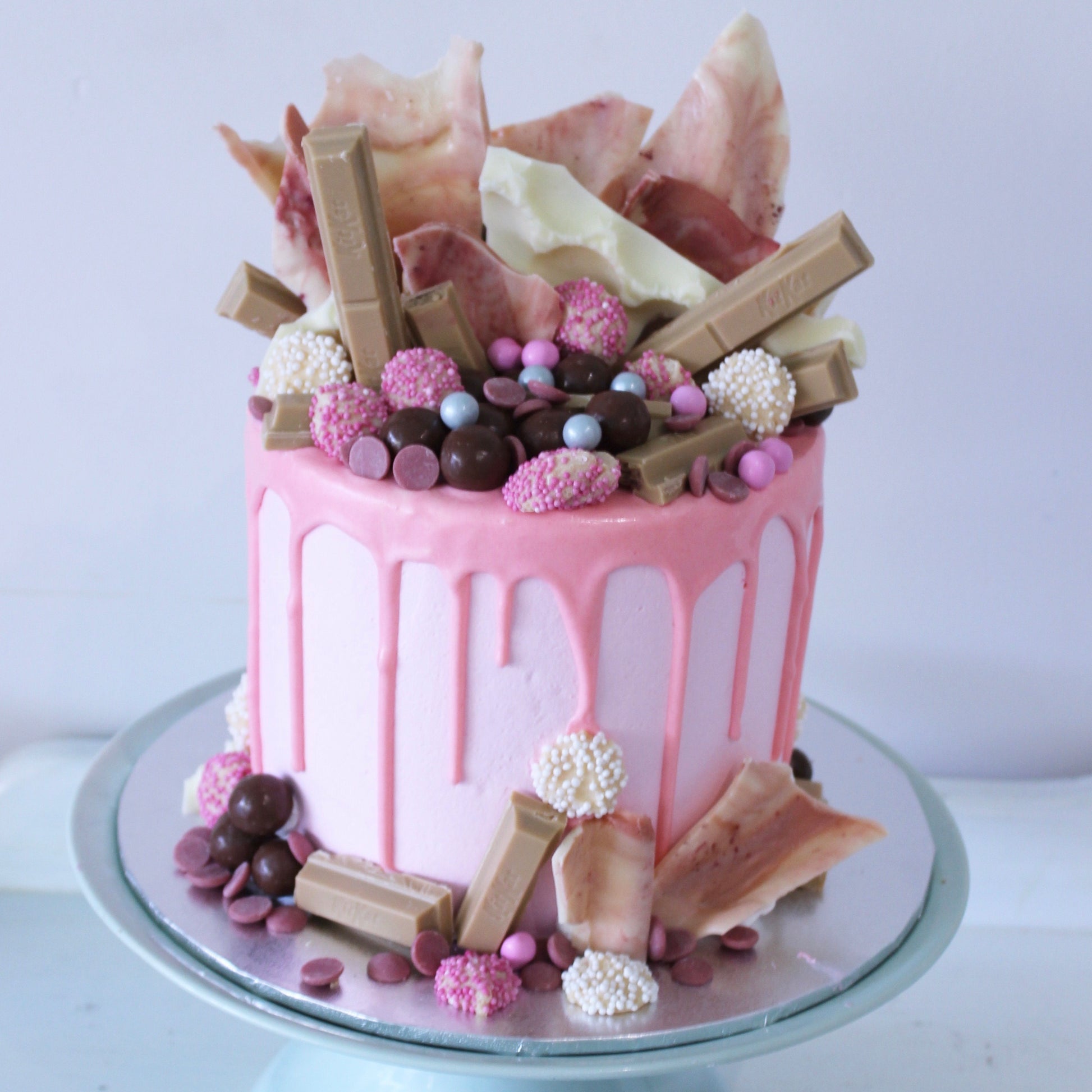 Filled sponge cake with smooth buttercream icing. Chocolate drizzled, finished with chocolate shards, chocolate lollies can chocolate bars. you choose your colours and we will do the rest.
