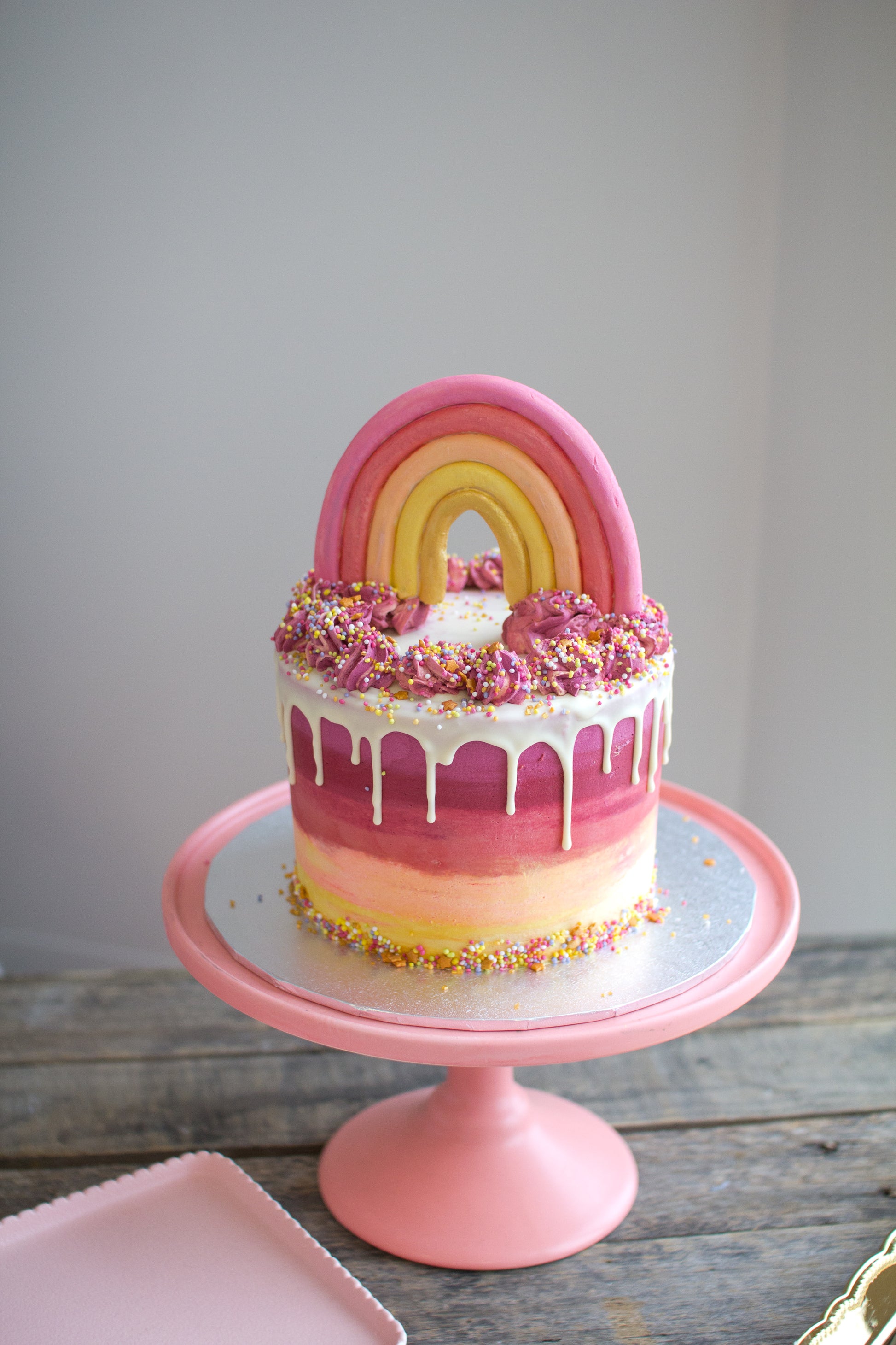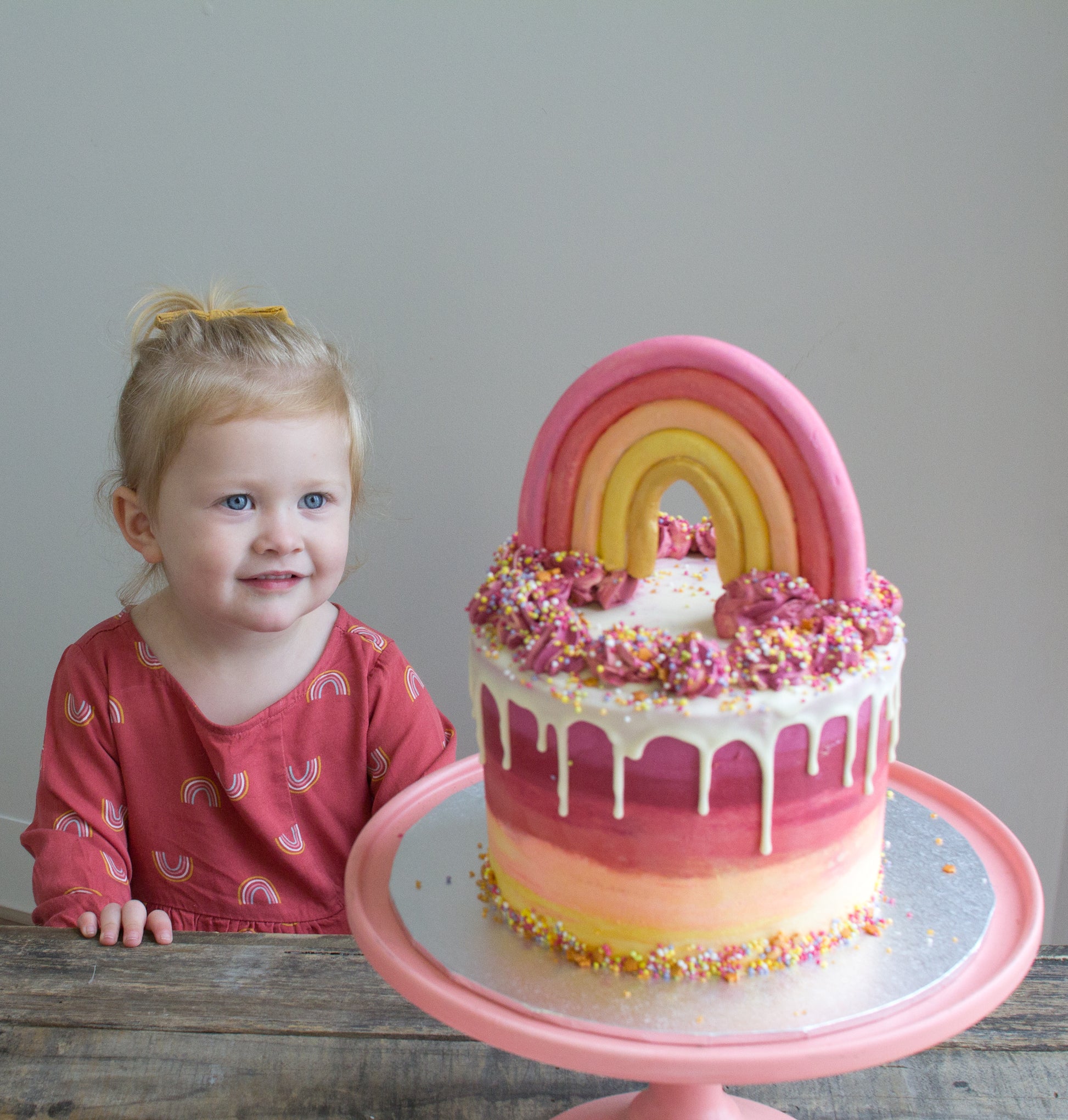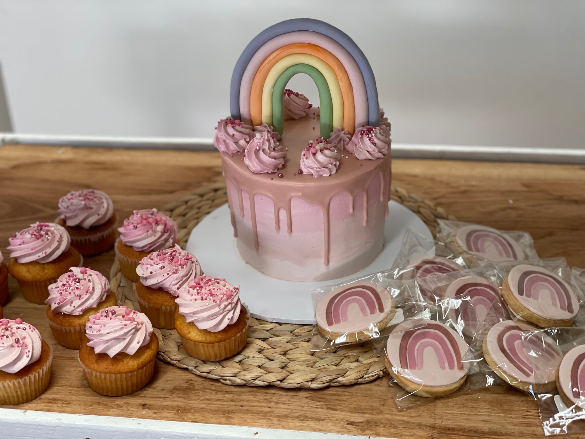 Filled sponge cake with smooth buttercream icing, and fun confetti pieces, drizzle and rainbow cake topper. You choose your colours and we will do the rest.