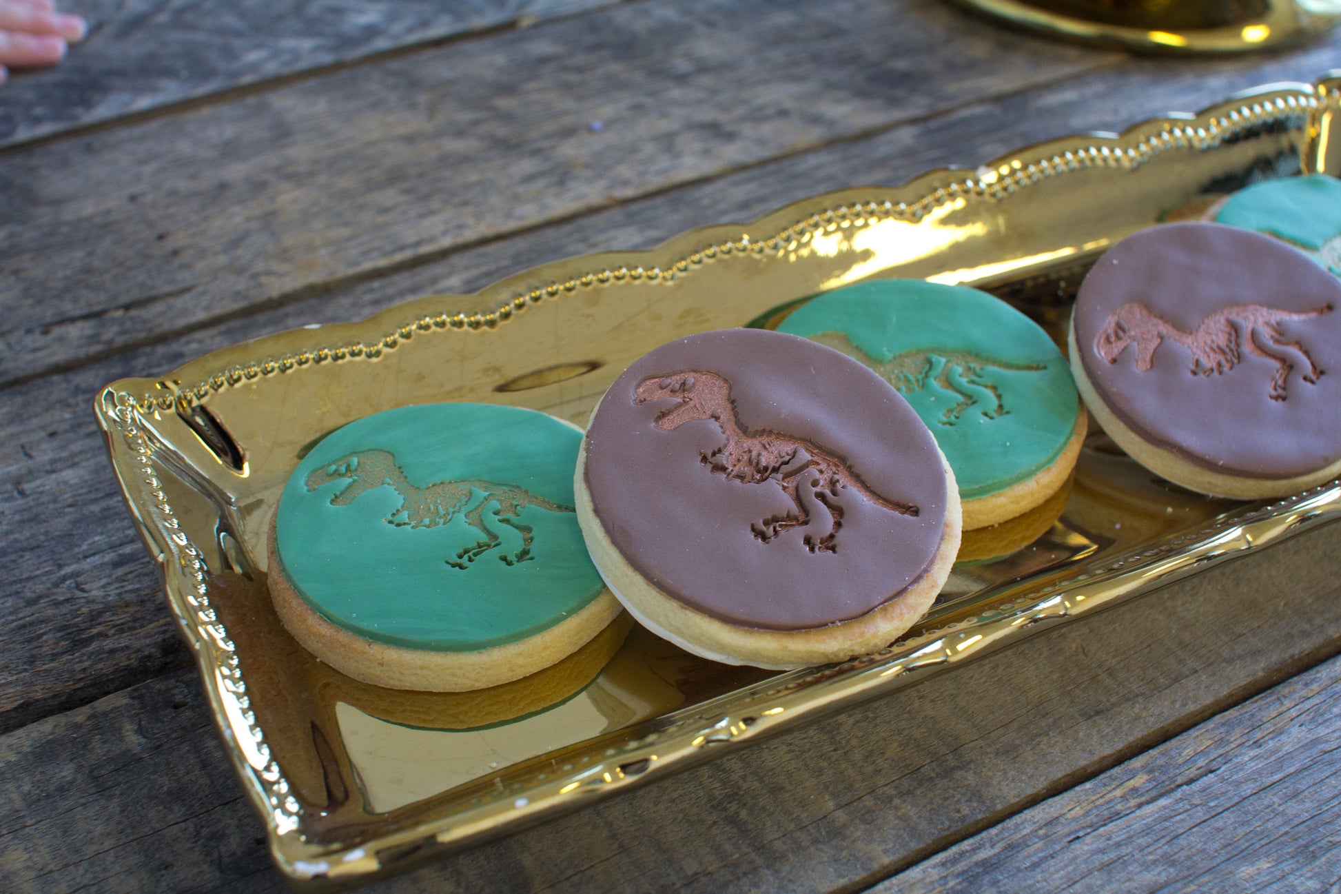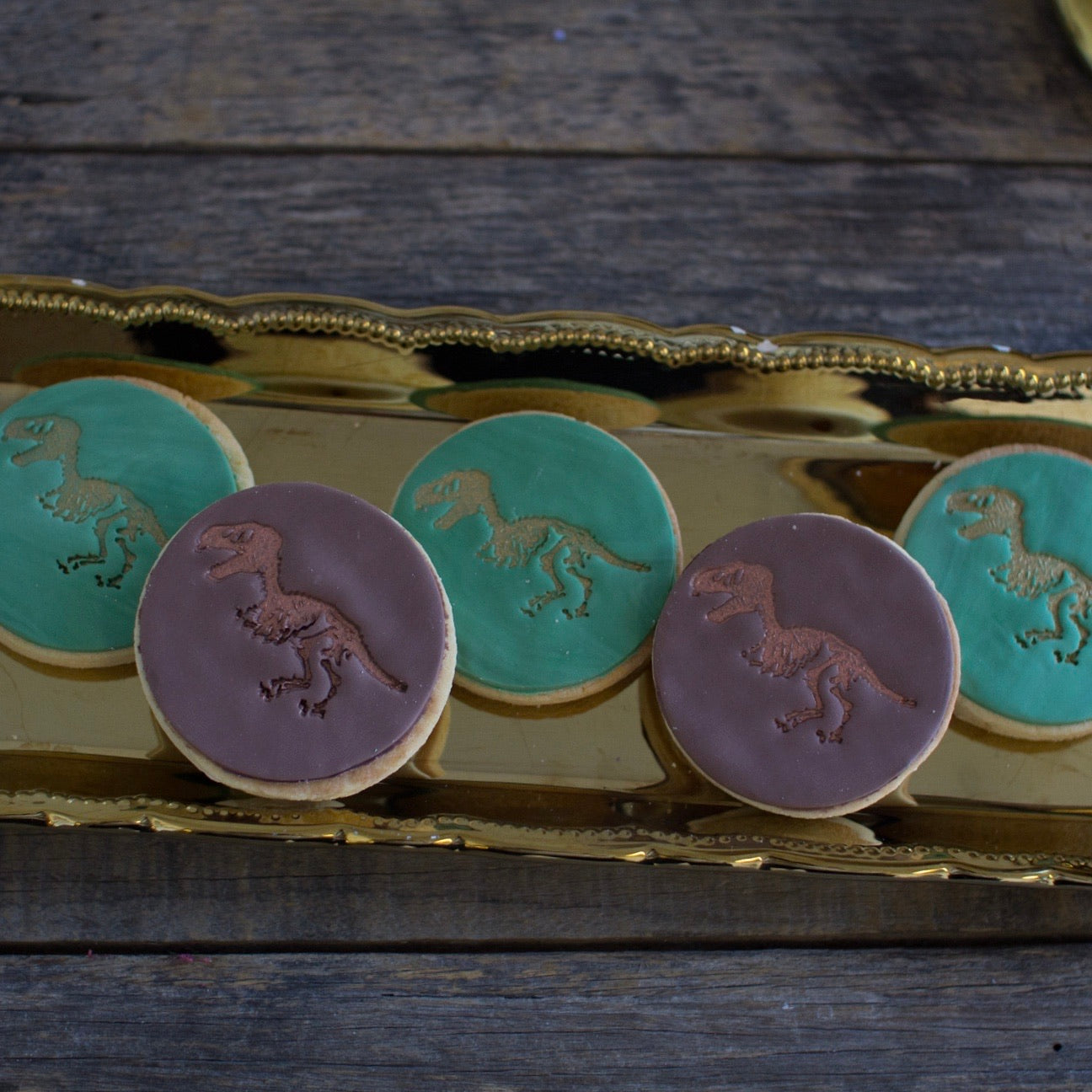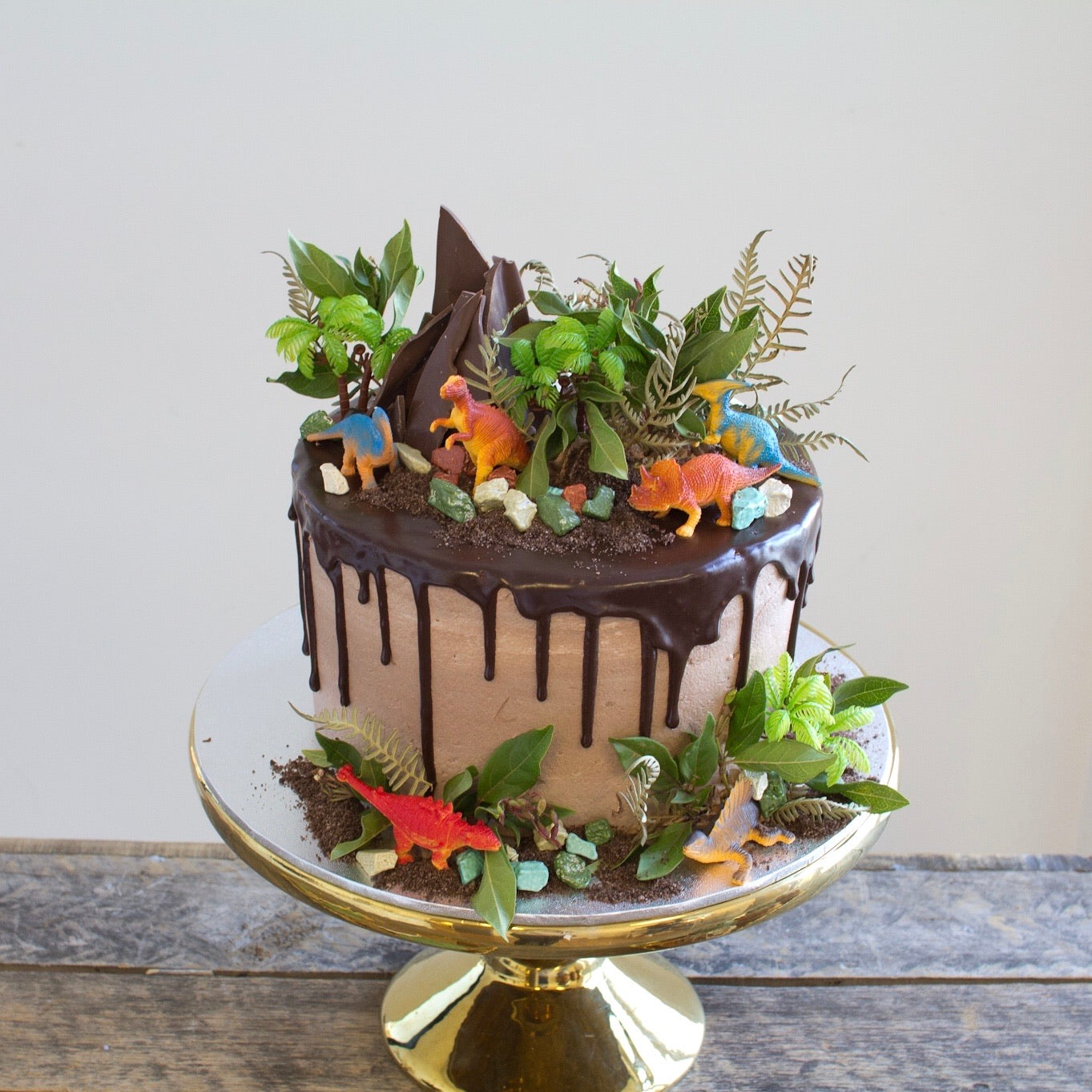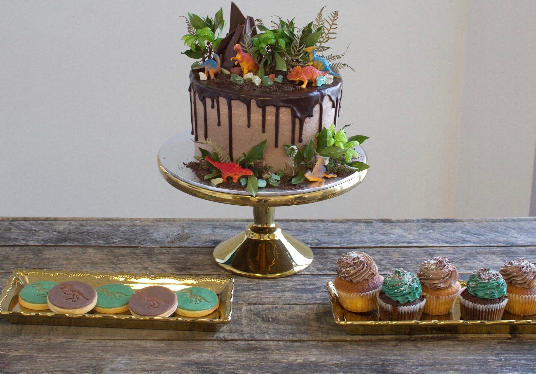Filled sponge cake with smooth marble buttercream icing, with drizzle, toy dinosaurs, chocolate rocks and decorations. Cookies with dinosaur print and cupcakes to match your chosen colours.