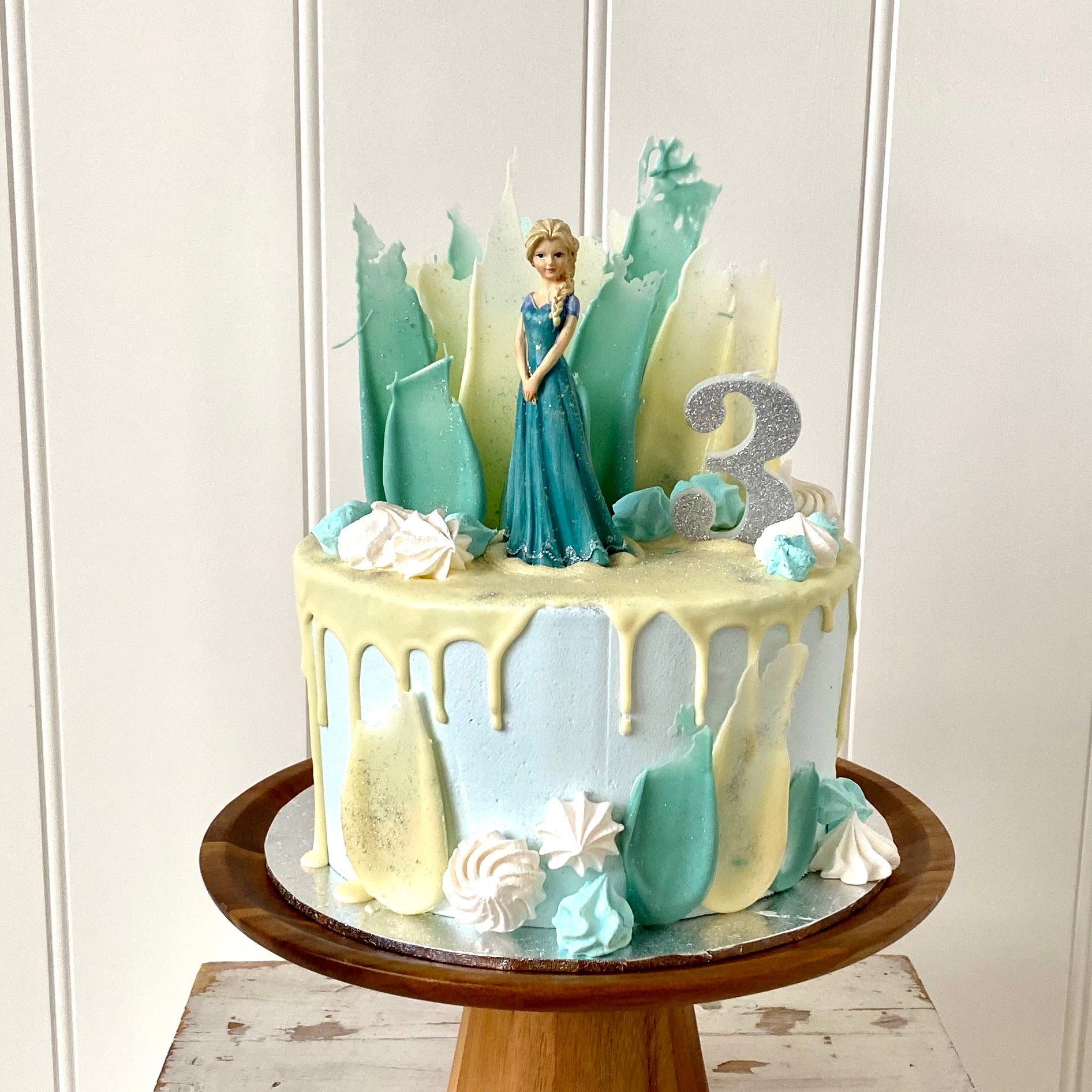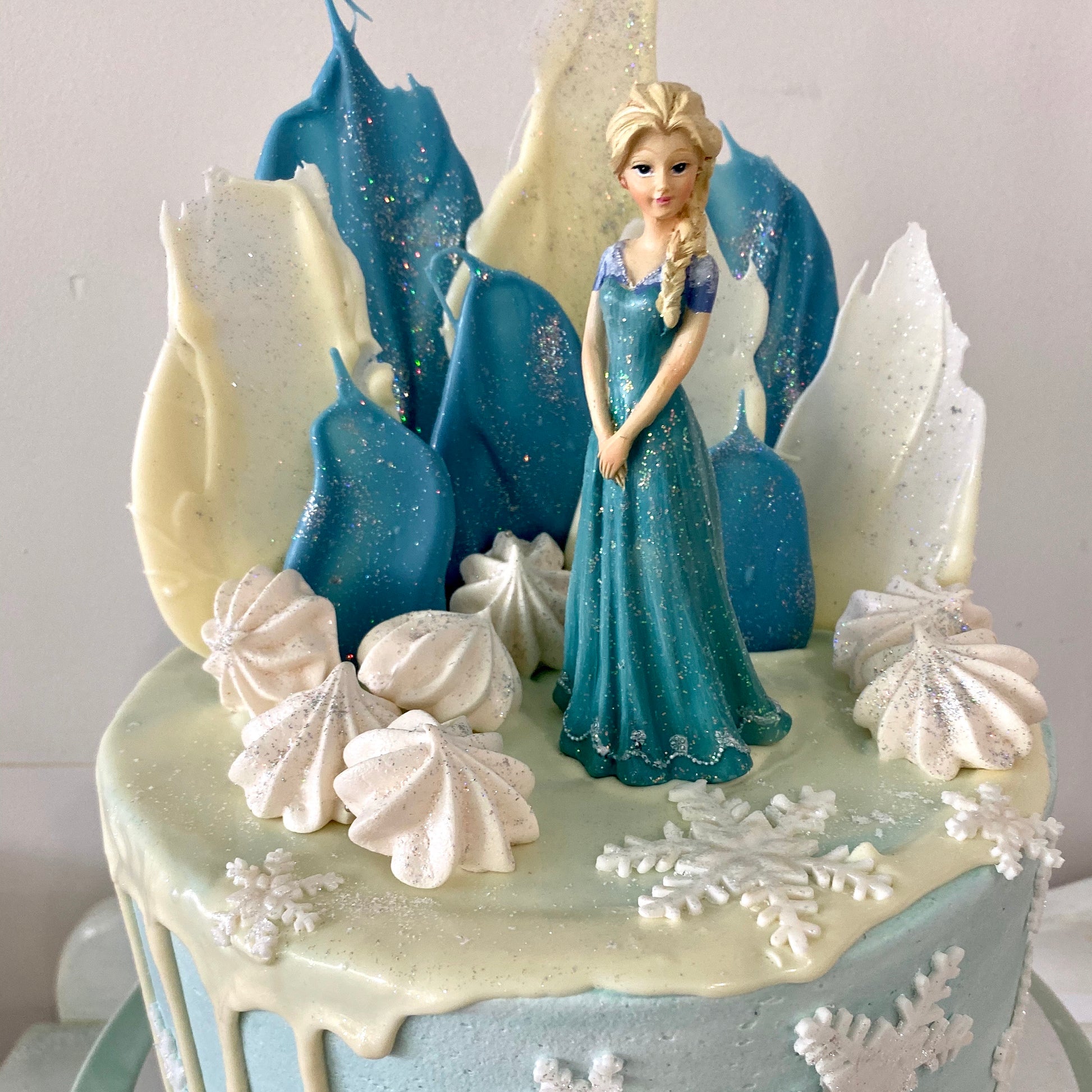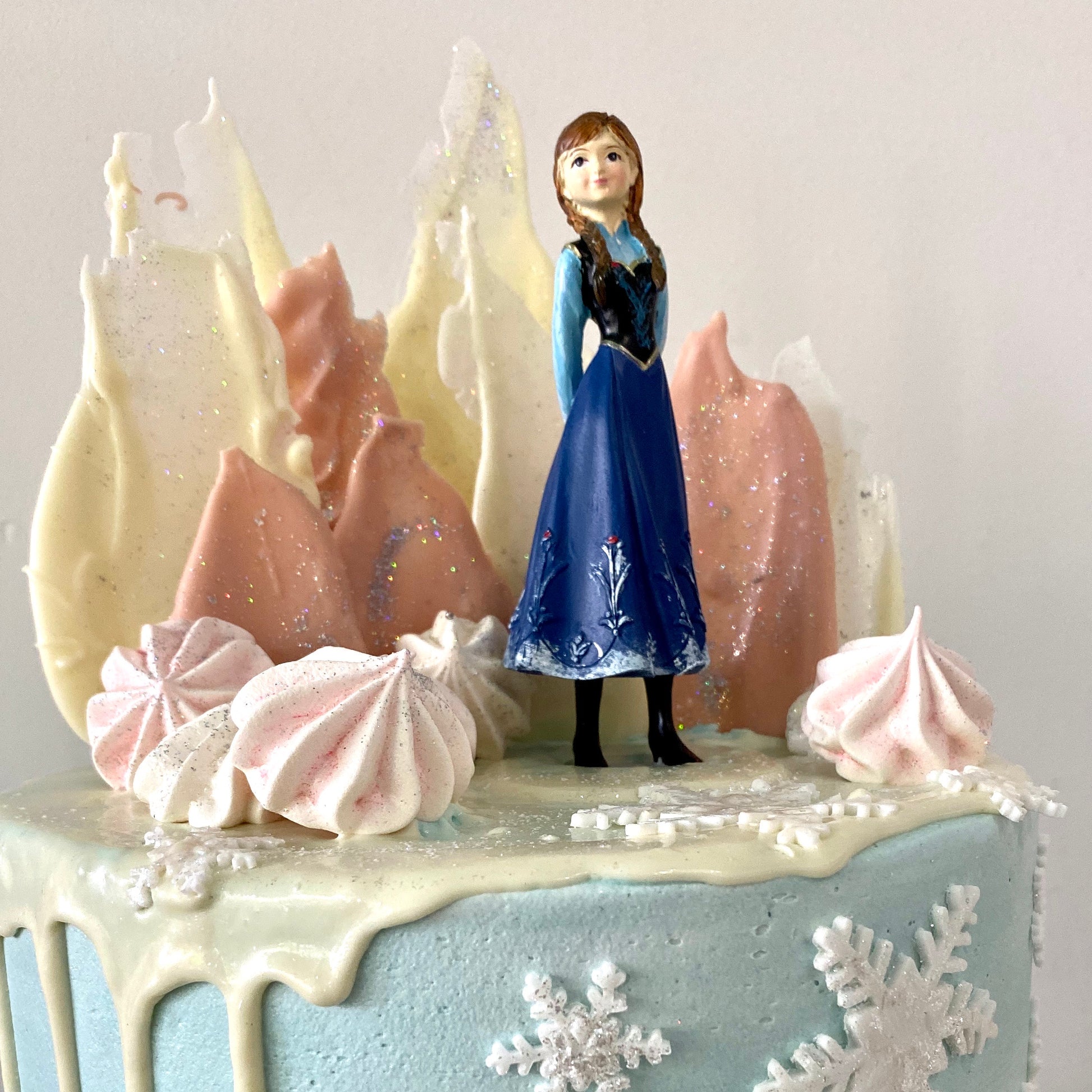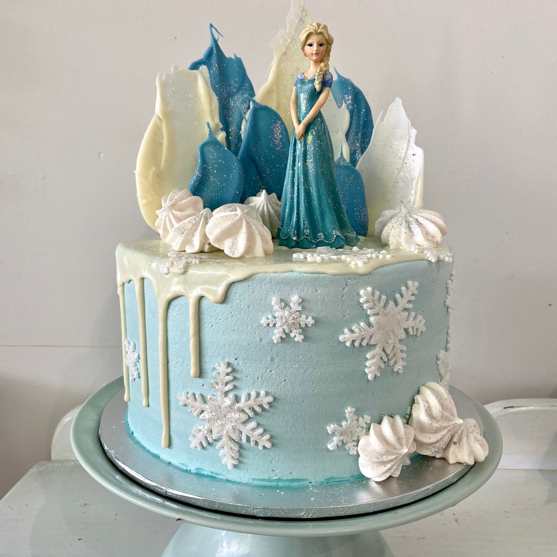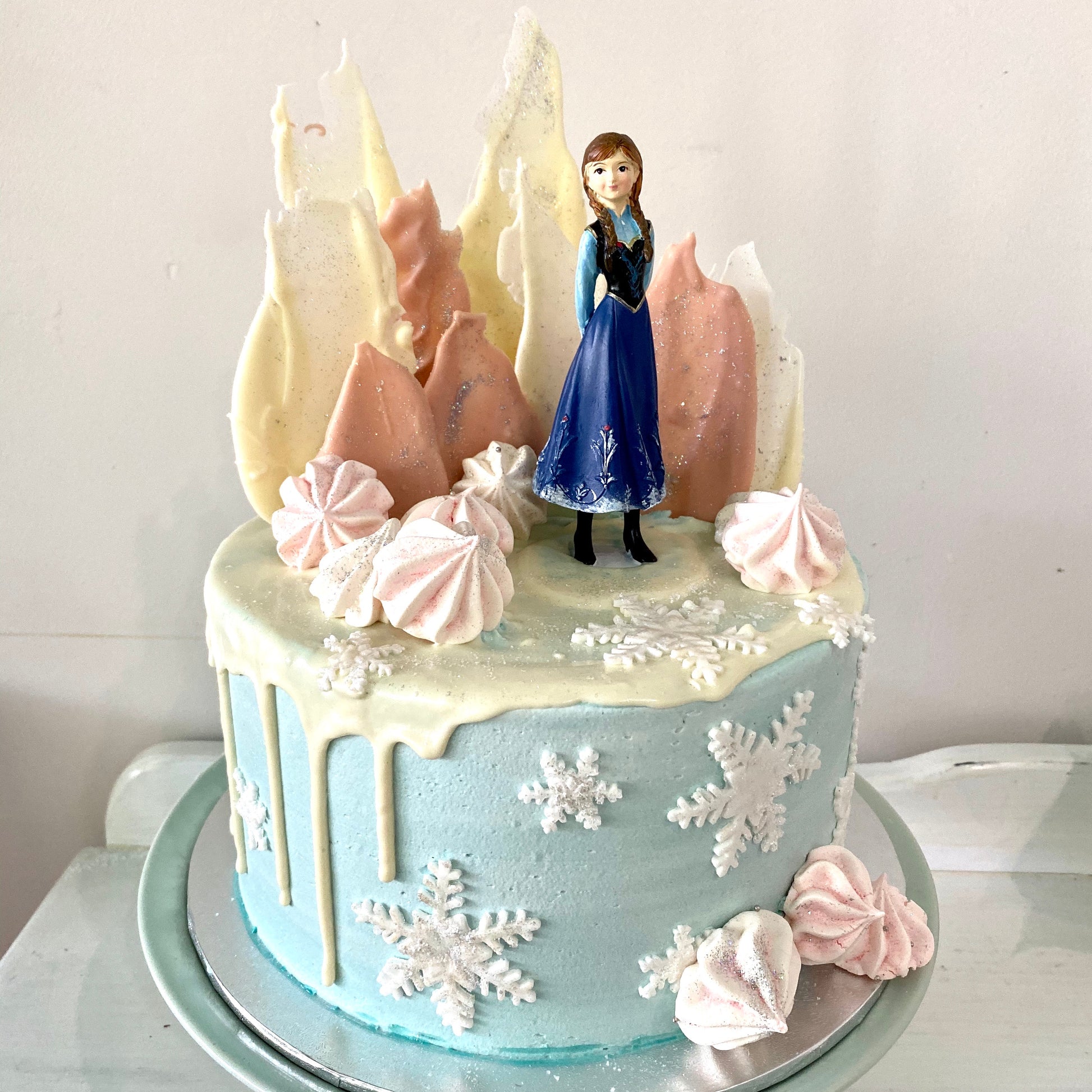 Made with layers of fluffy sponge cake with your choice of filling. Decorated in frosred blues, white drizzle, magical chocolate shards and sparkle meringues. Choose Elsa with blue details or Anna with pink details. Our buy a two tier and get both with Olaf.