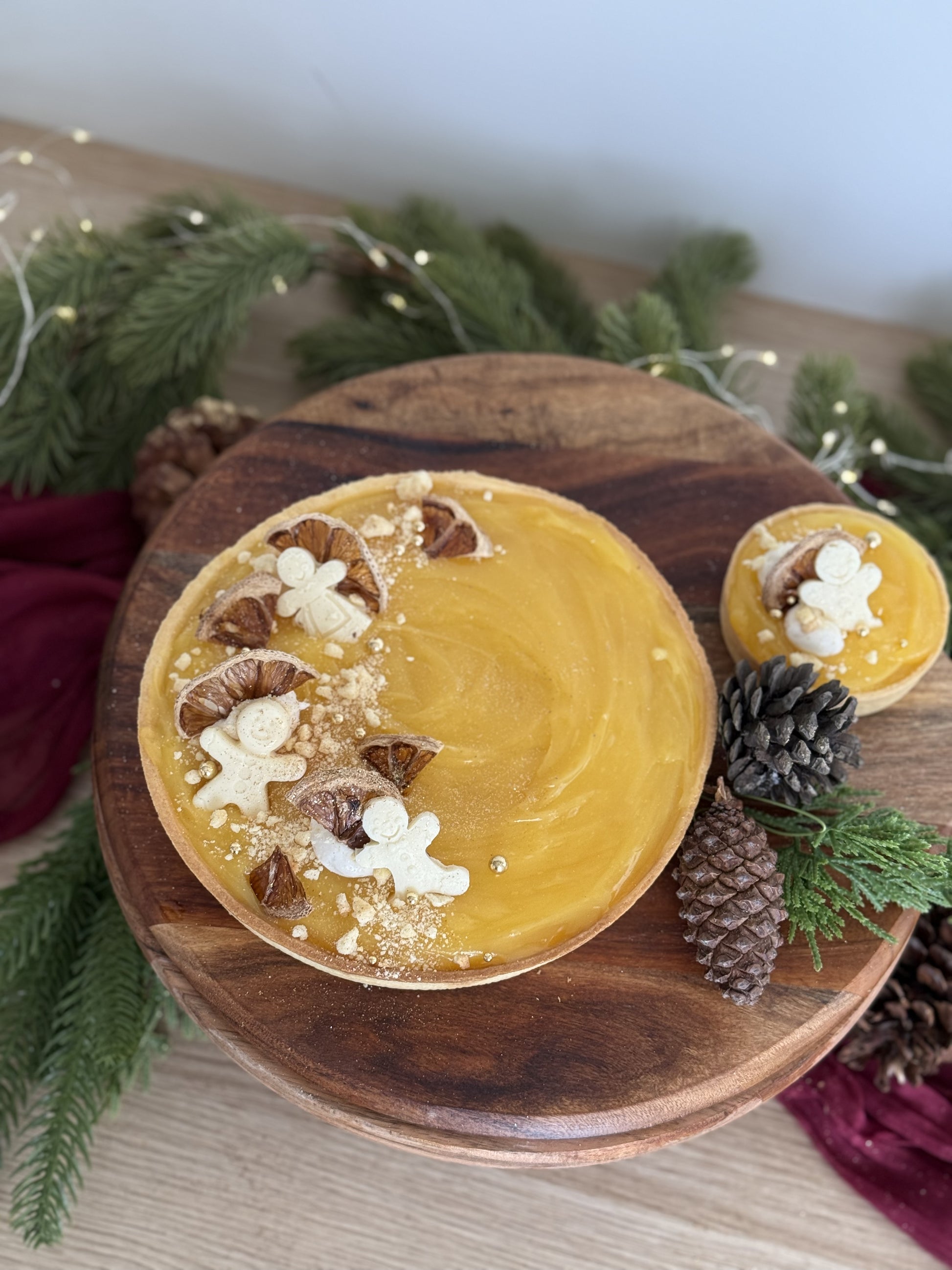 Shortbread tart case, with house made lemon curd , decorated with citrus piece.