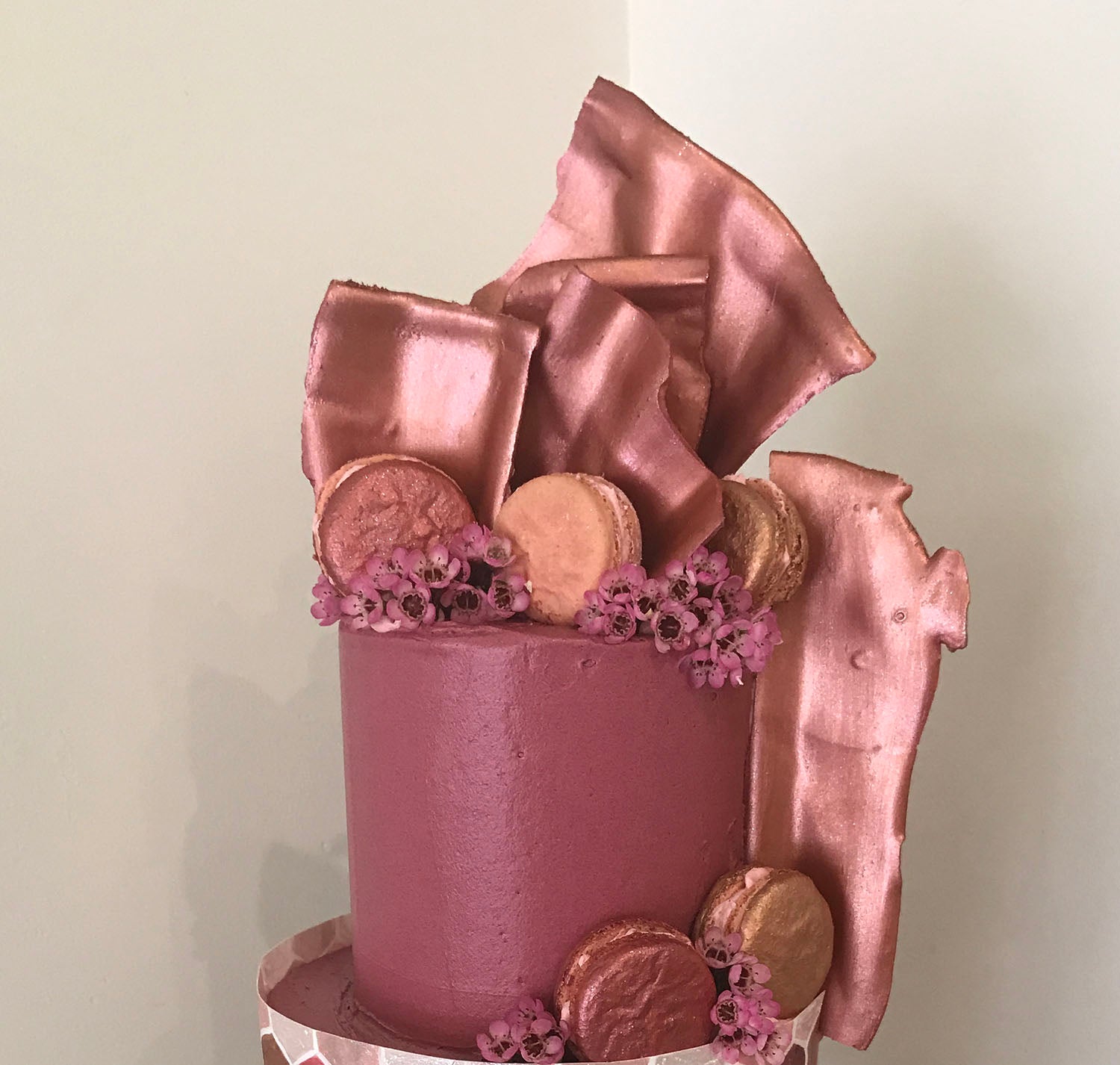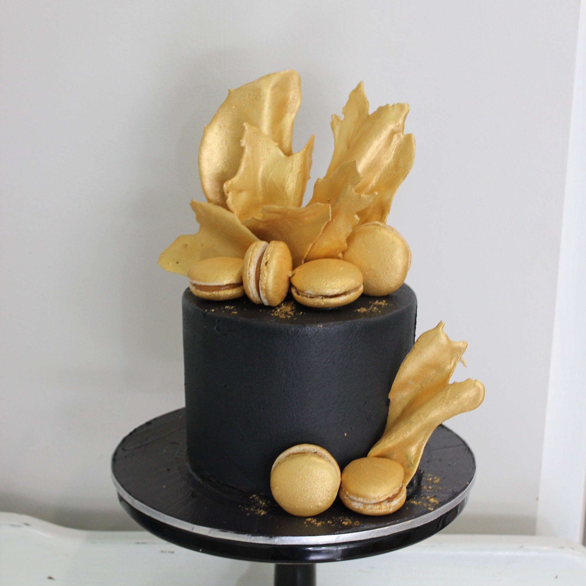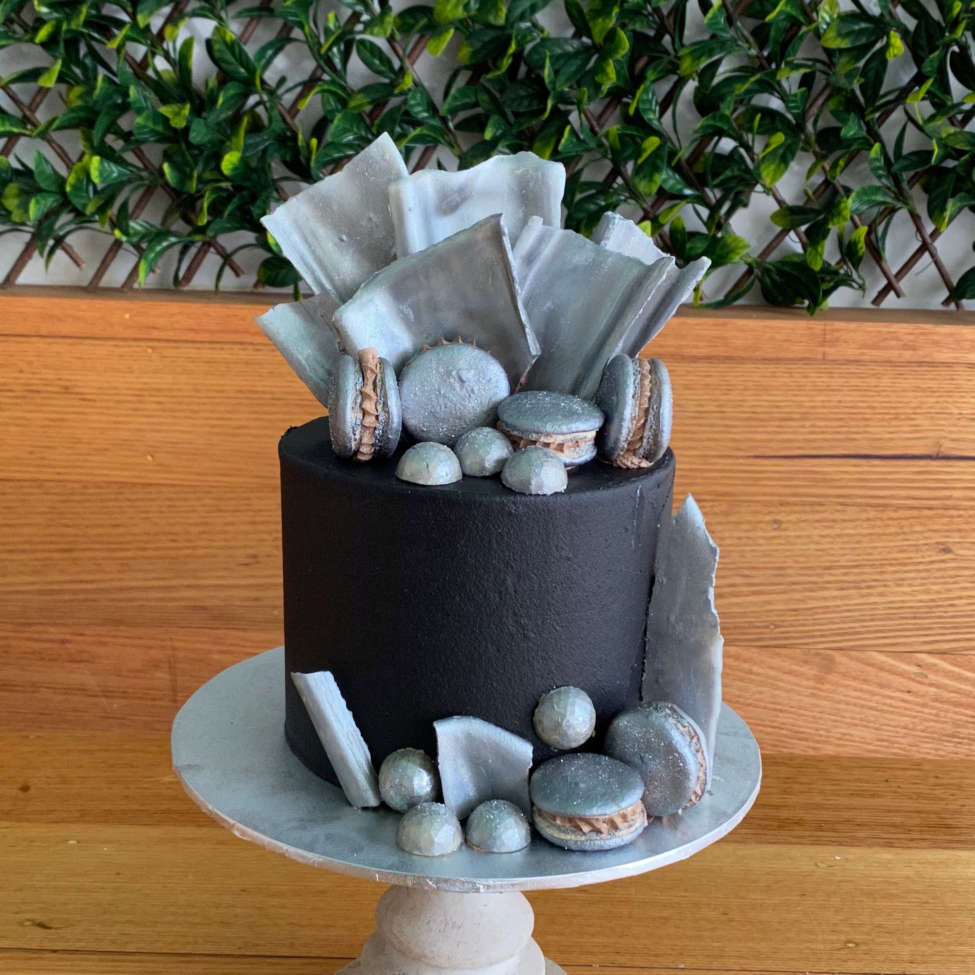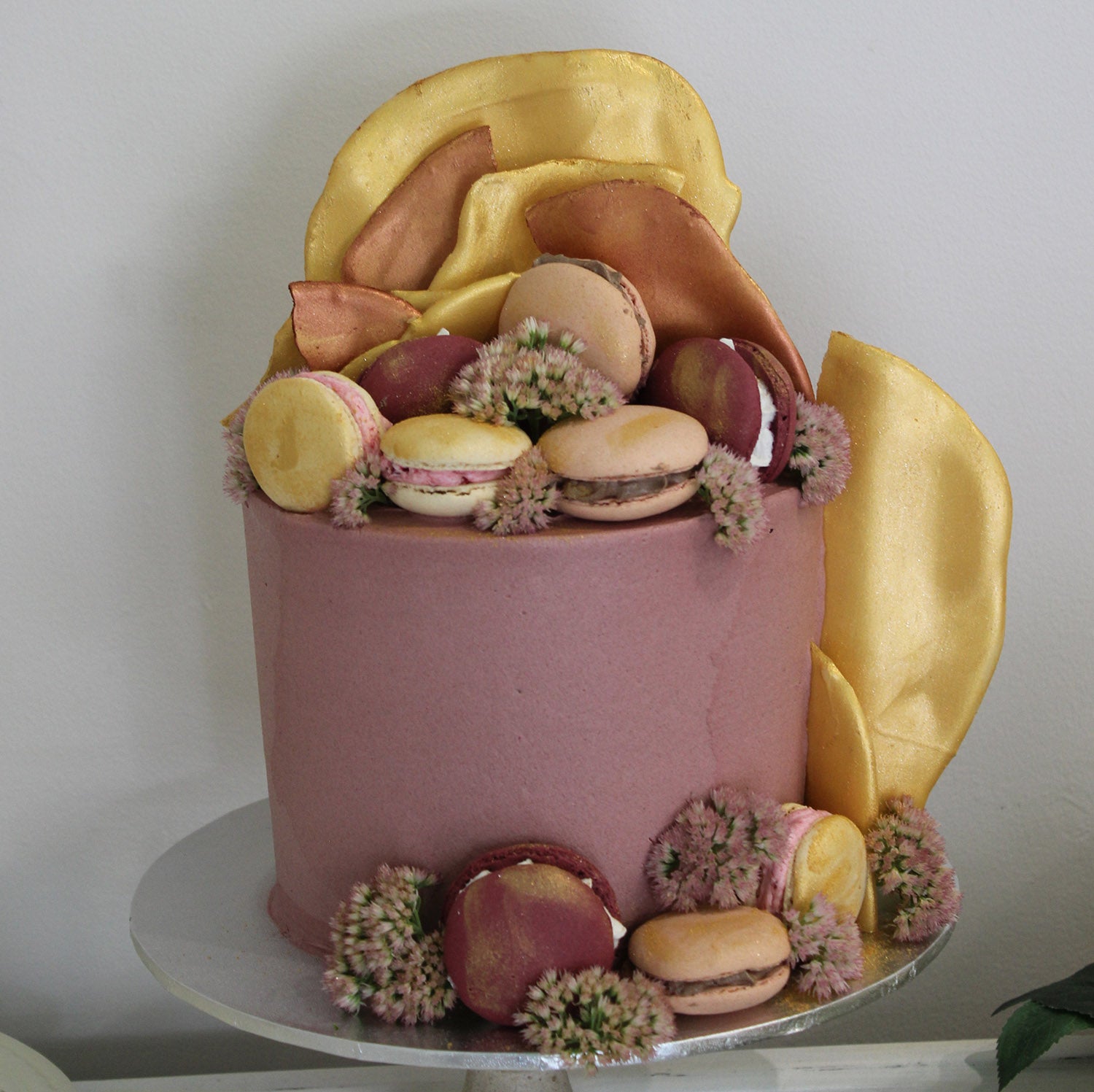 Filled sponge cake with smooth buttercream icing of your colour choice. Decorated with Metallic Chocolate shards and Macarons. Options to add Drizzle if you would like