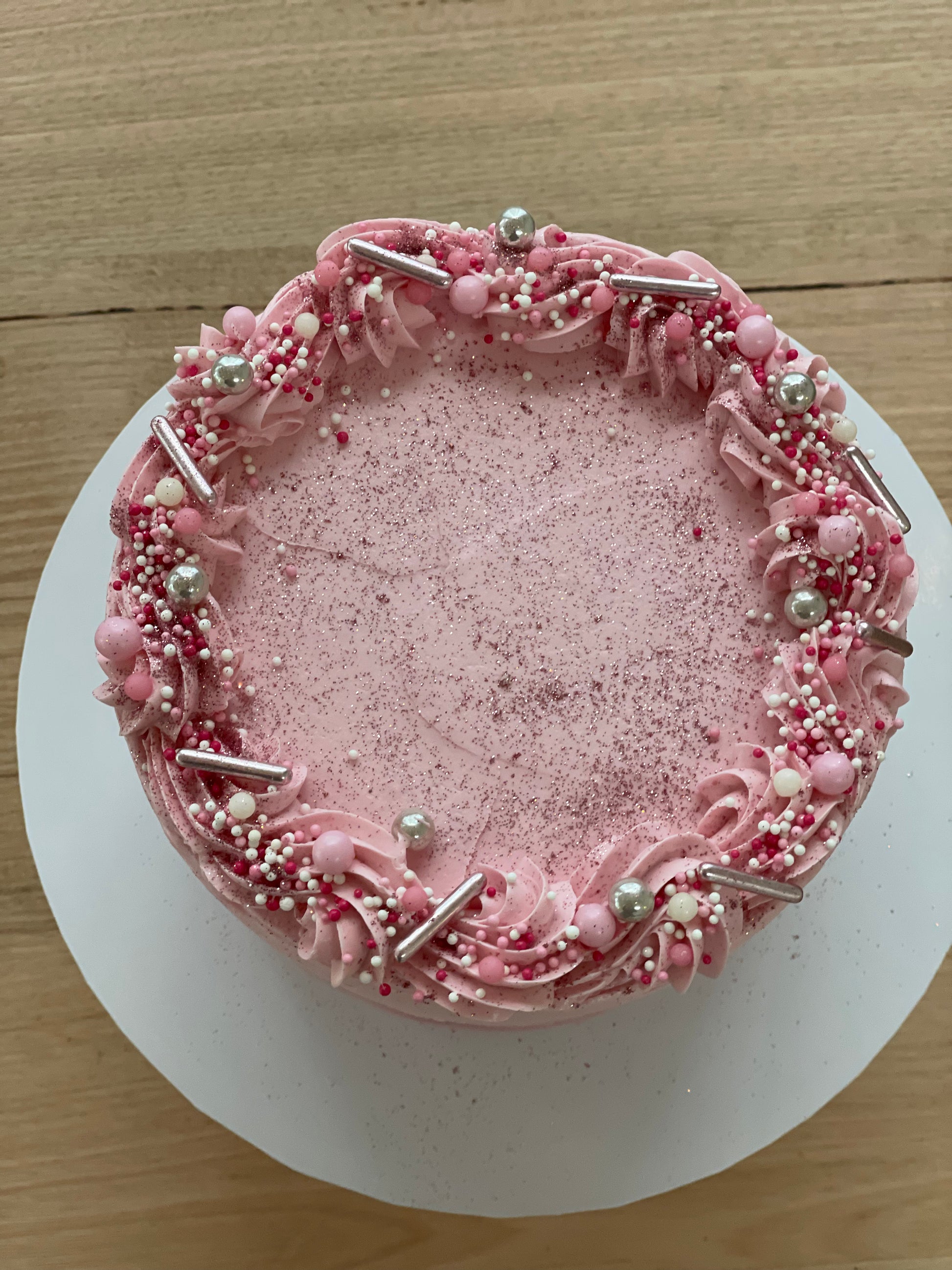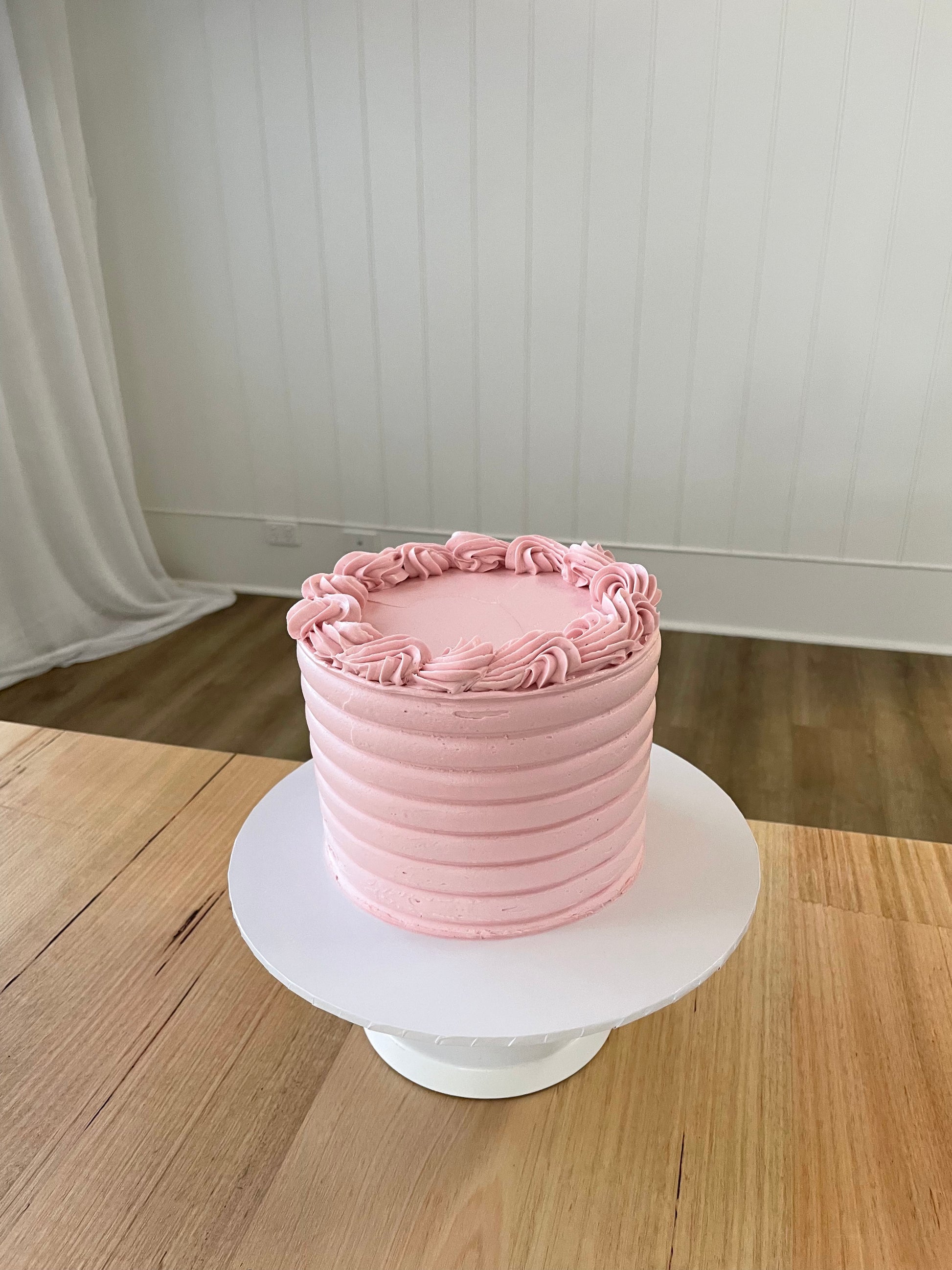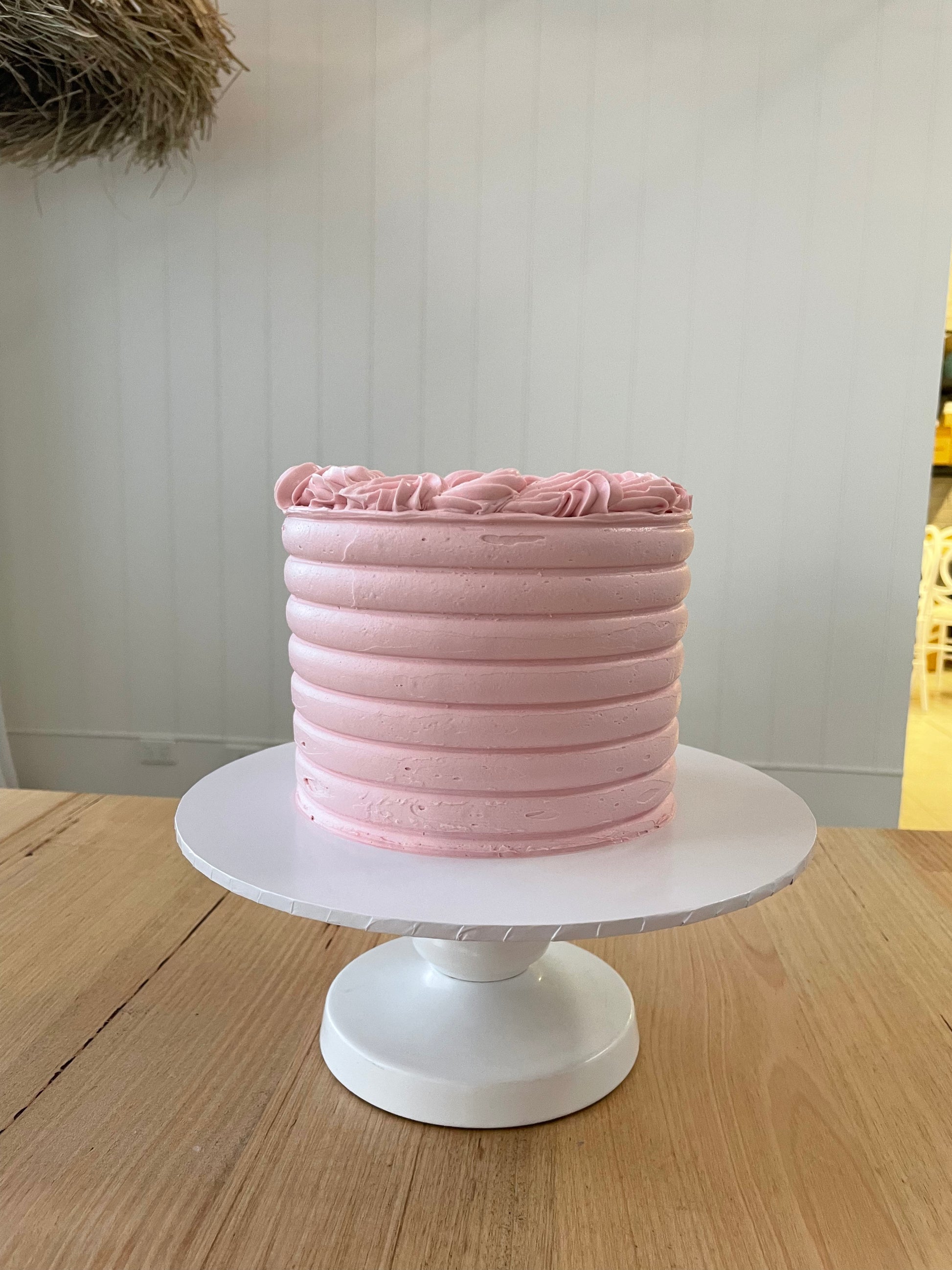 Filled sponge cake with a lined buttercream icing finish and finished with piped buttercream edge.