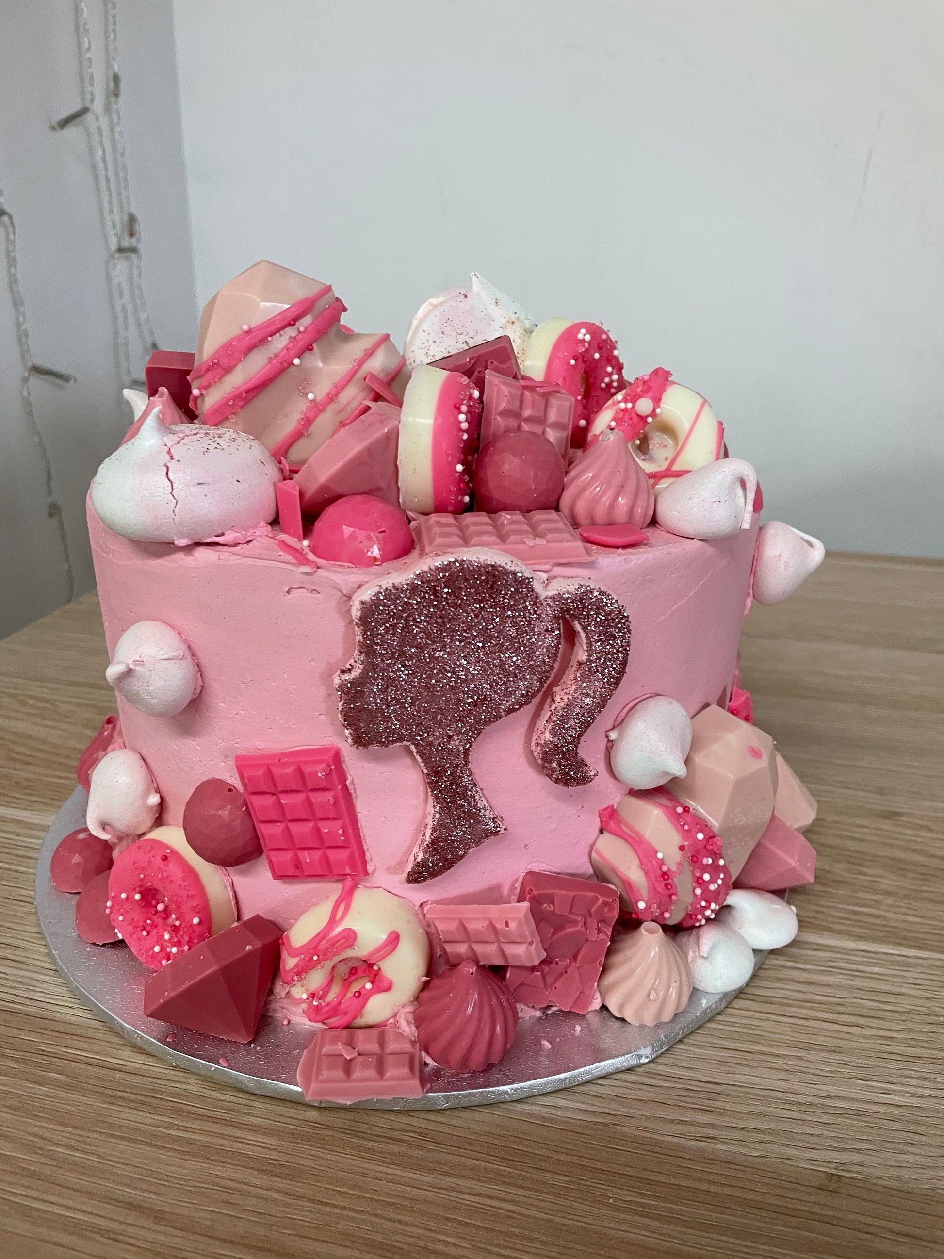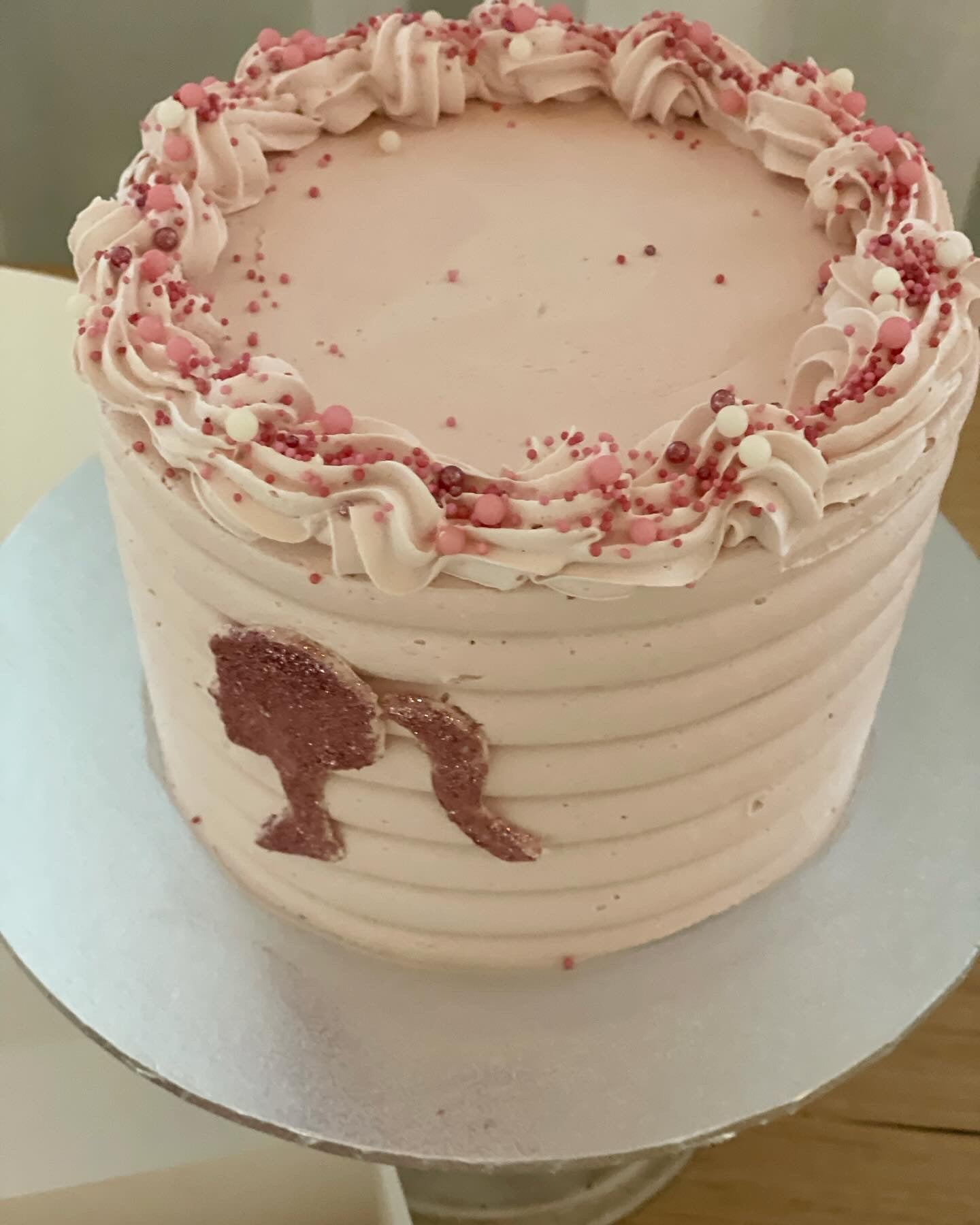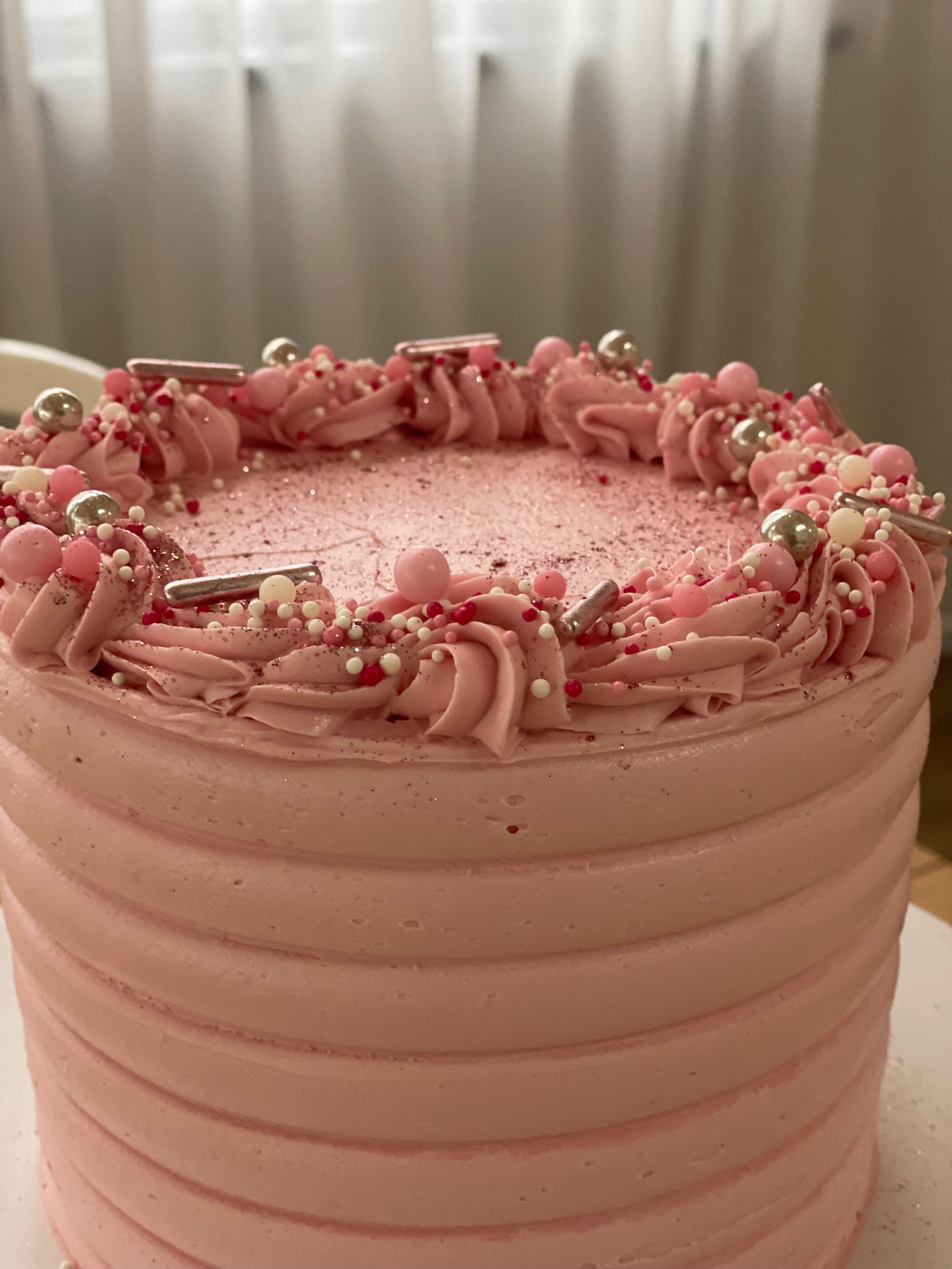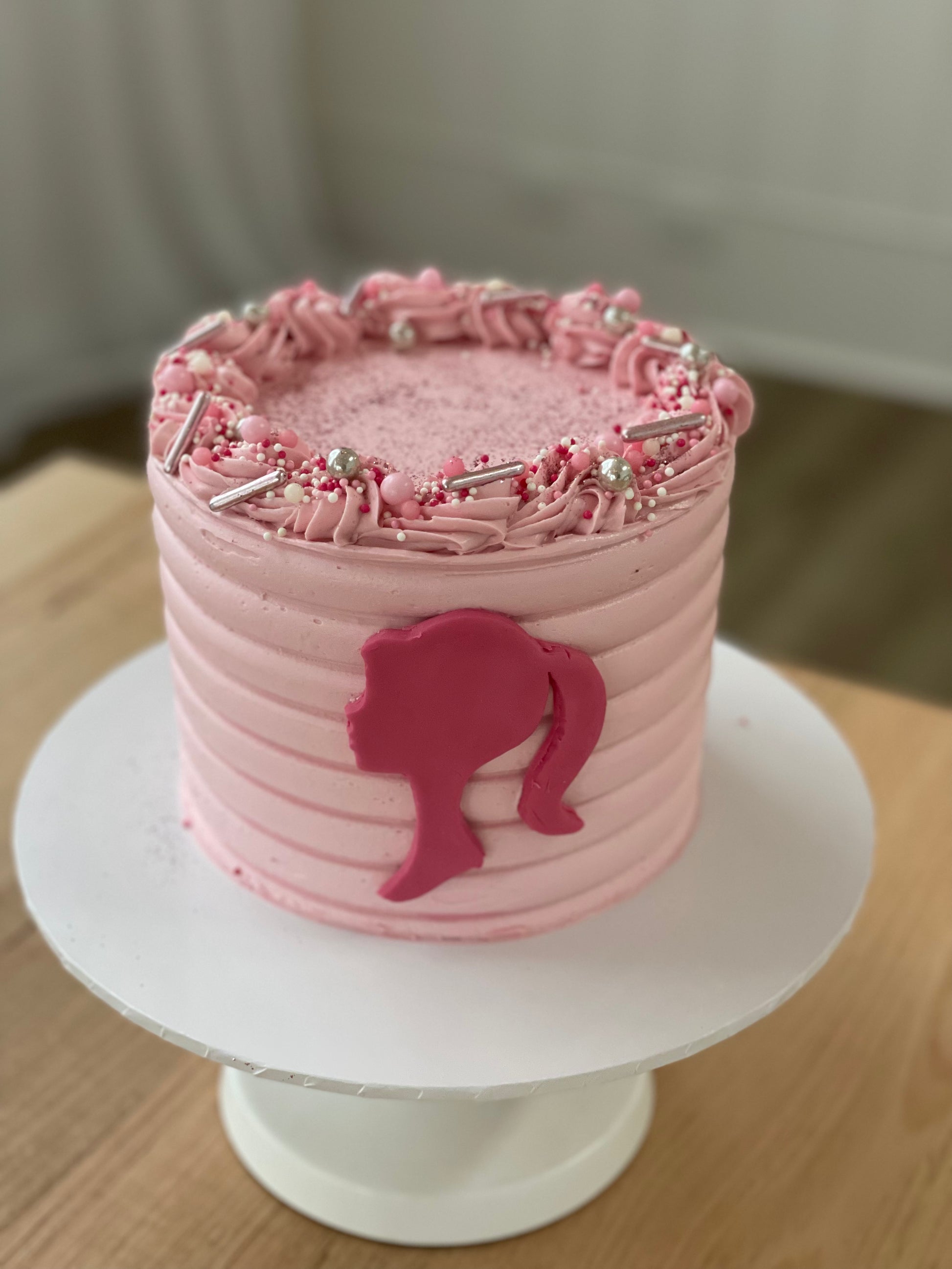Filled sponge cake with a lined buttercream icing finish and finished with piped buttercream edge.