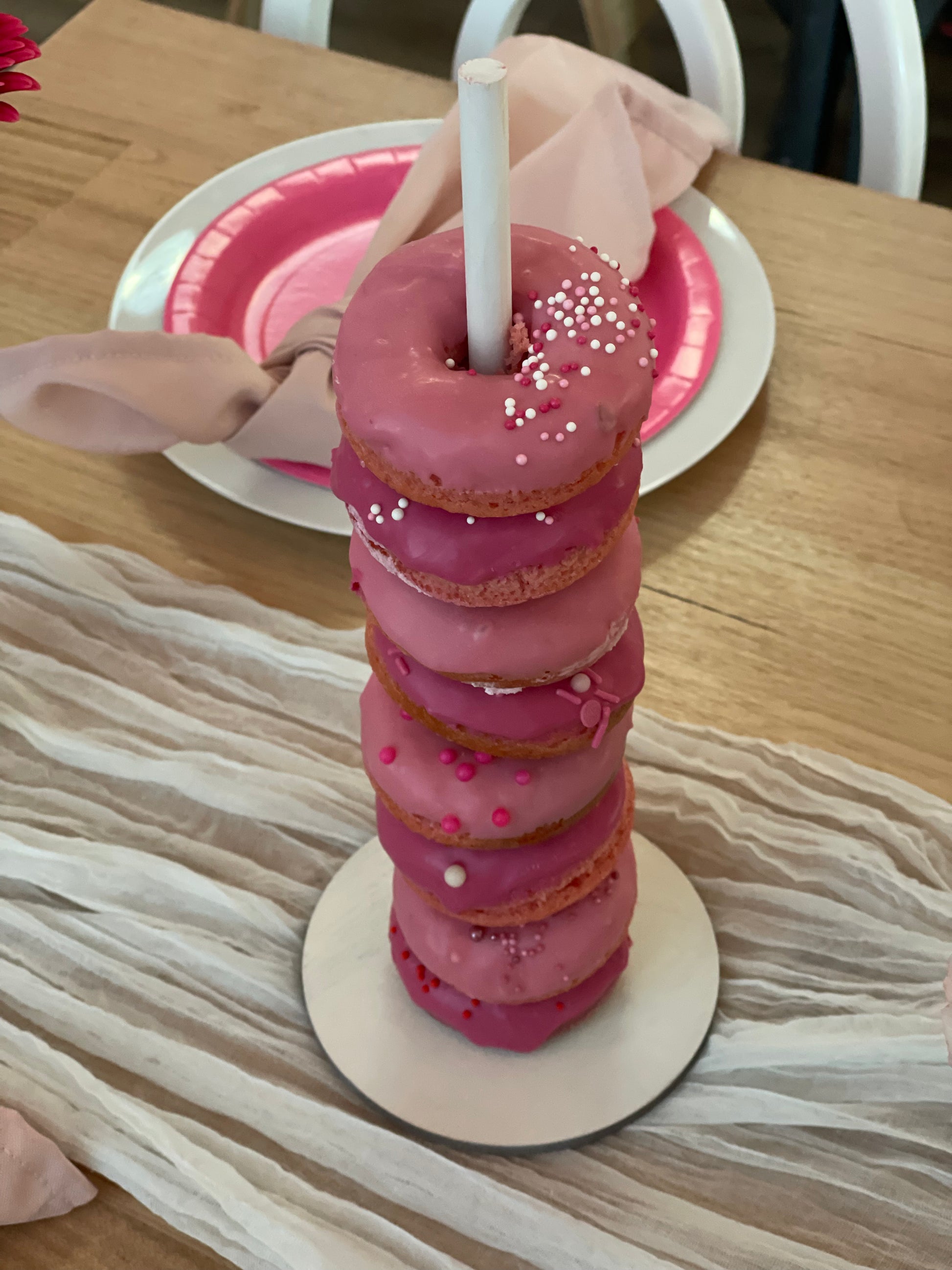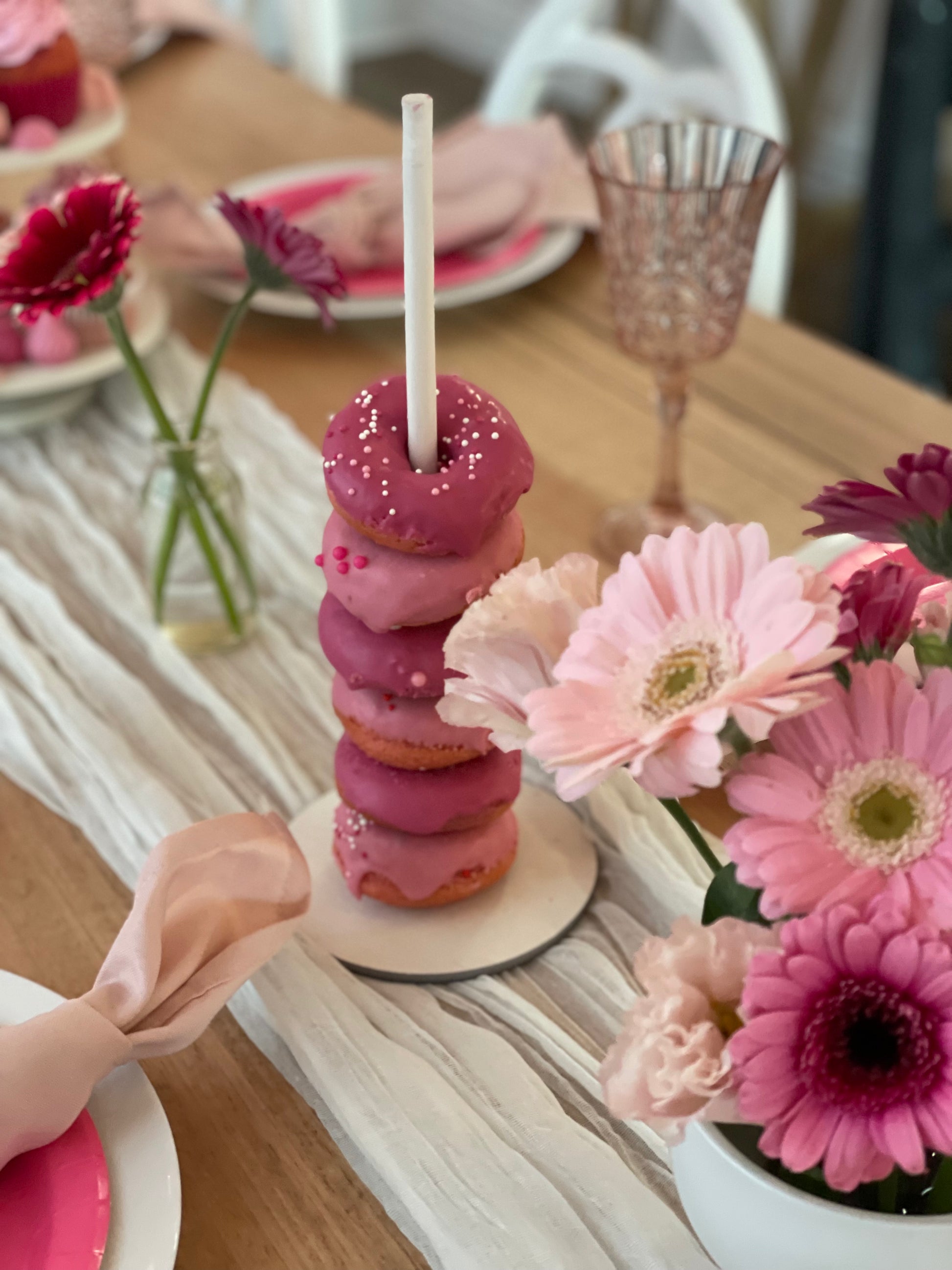 Freshly baked donuts, with pink icing and mixed sprinkles