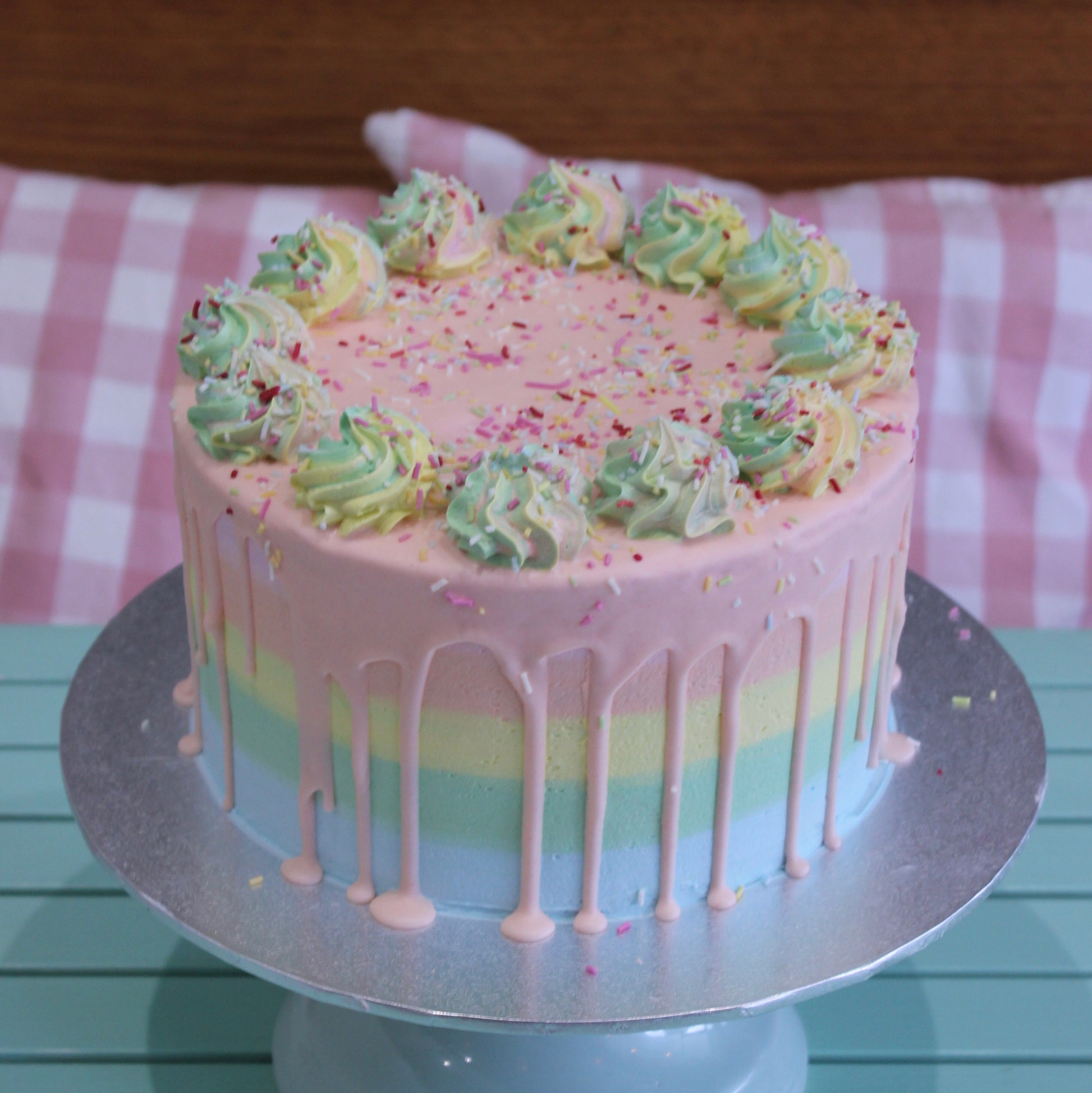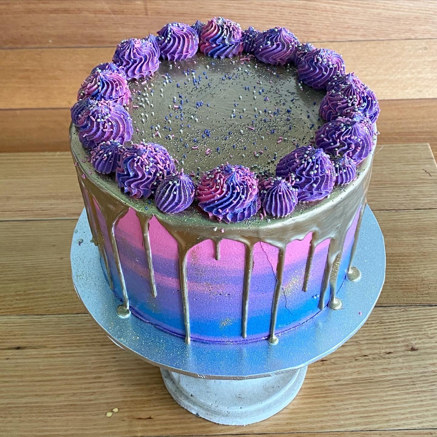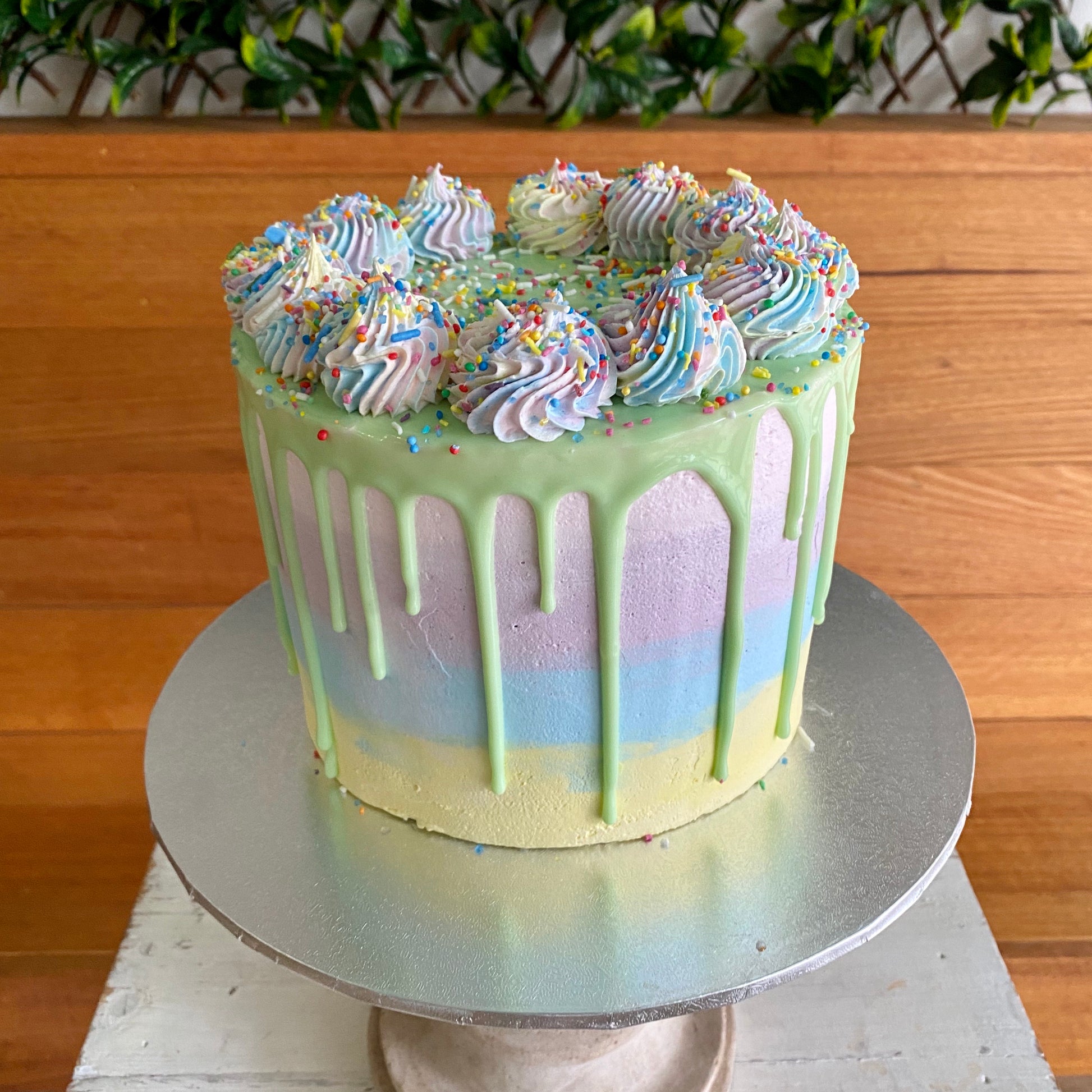 Filled sponge cake with a smooth buttercream icing finish and surrounded by piped decorations. Finished off with coloured sugar confetti and the option to add your choice of drizzle and chocolate shards.