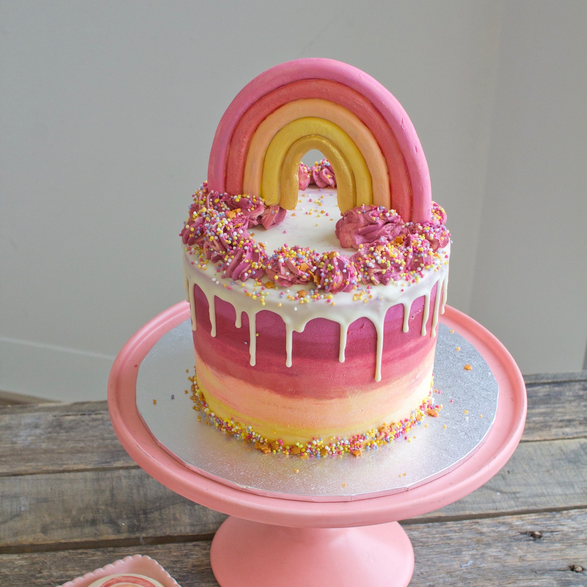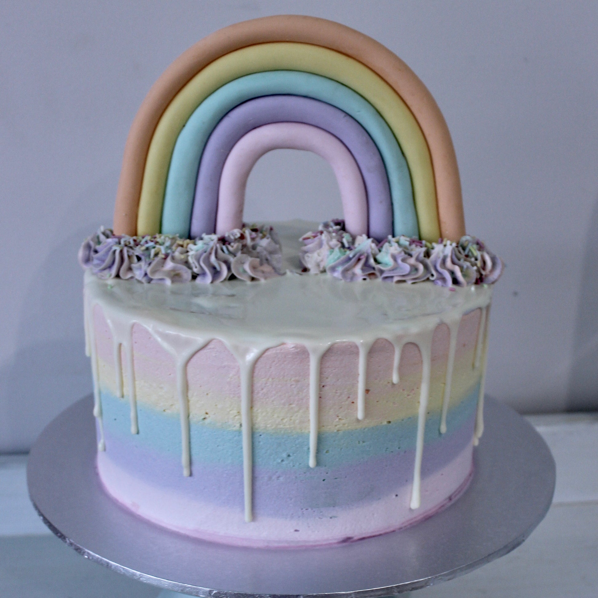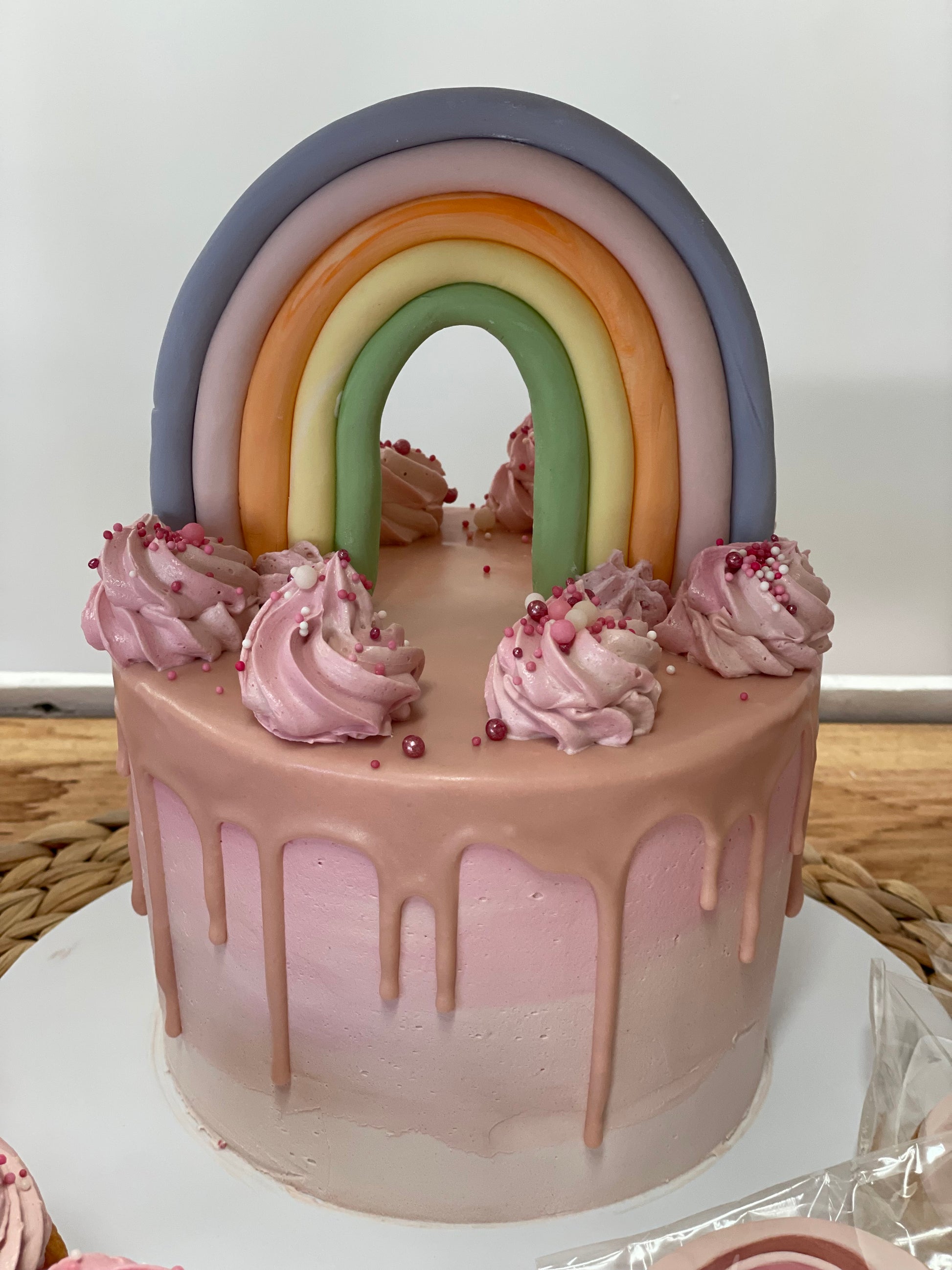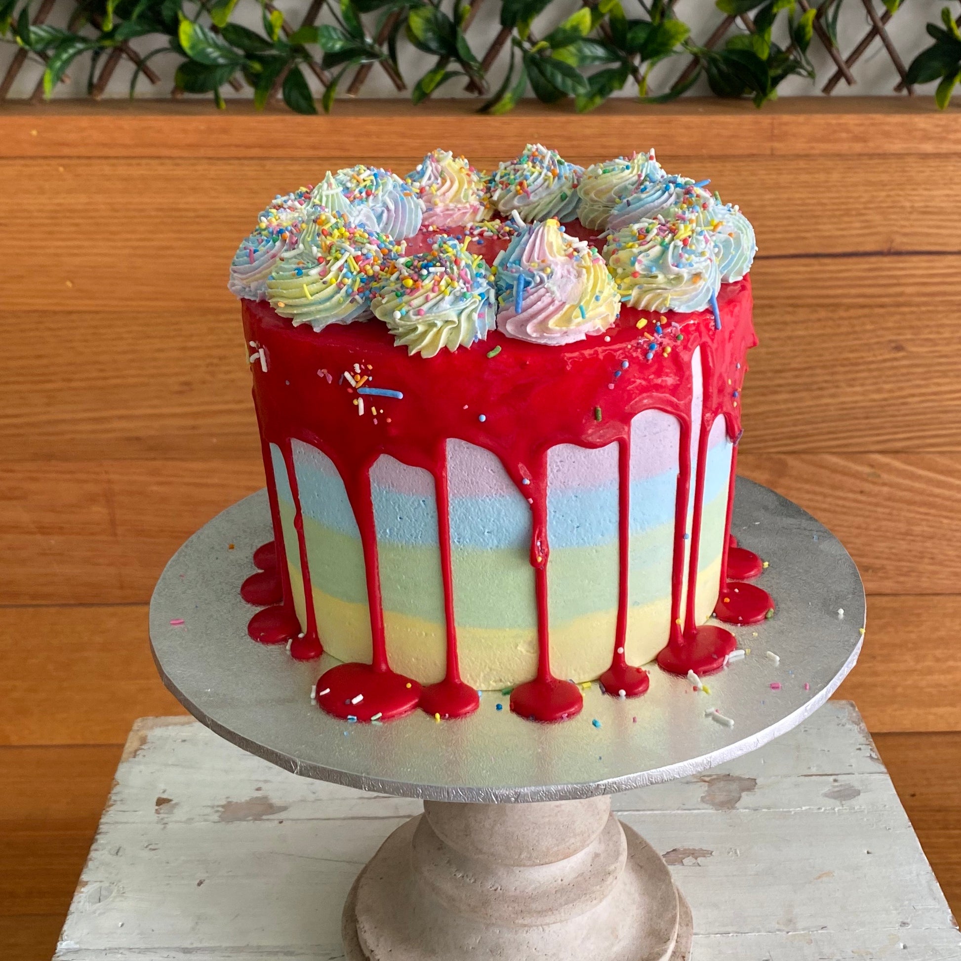 Filled sponge cake with a smooth buttercream icing finish and surrounded by piped decorations. Finished off with coloured sugar confetti and the option to add your choice of drizzle and chocolate shards.