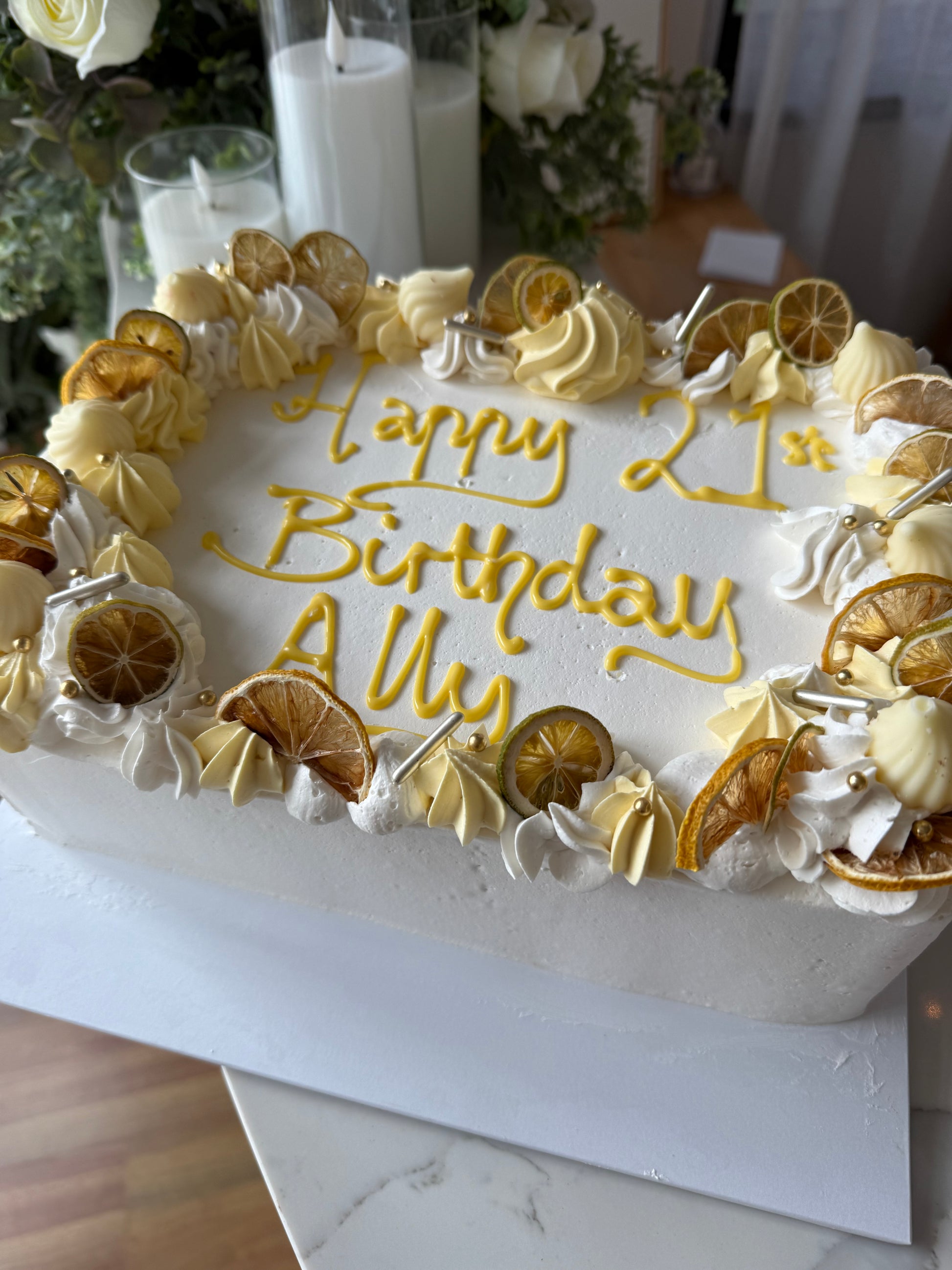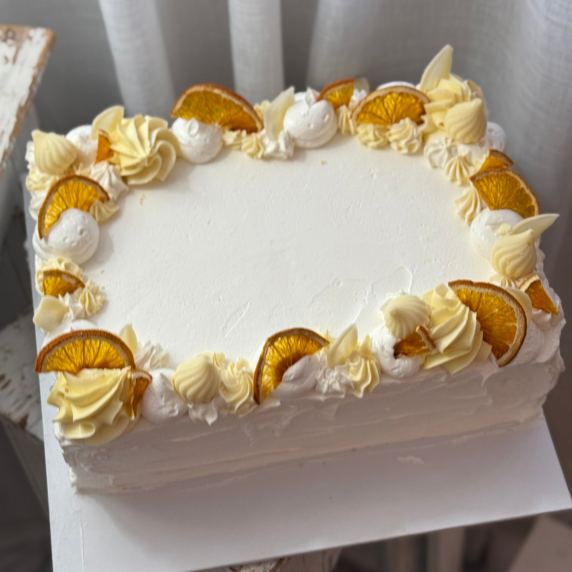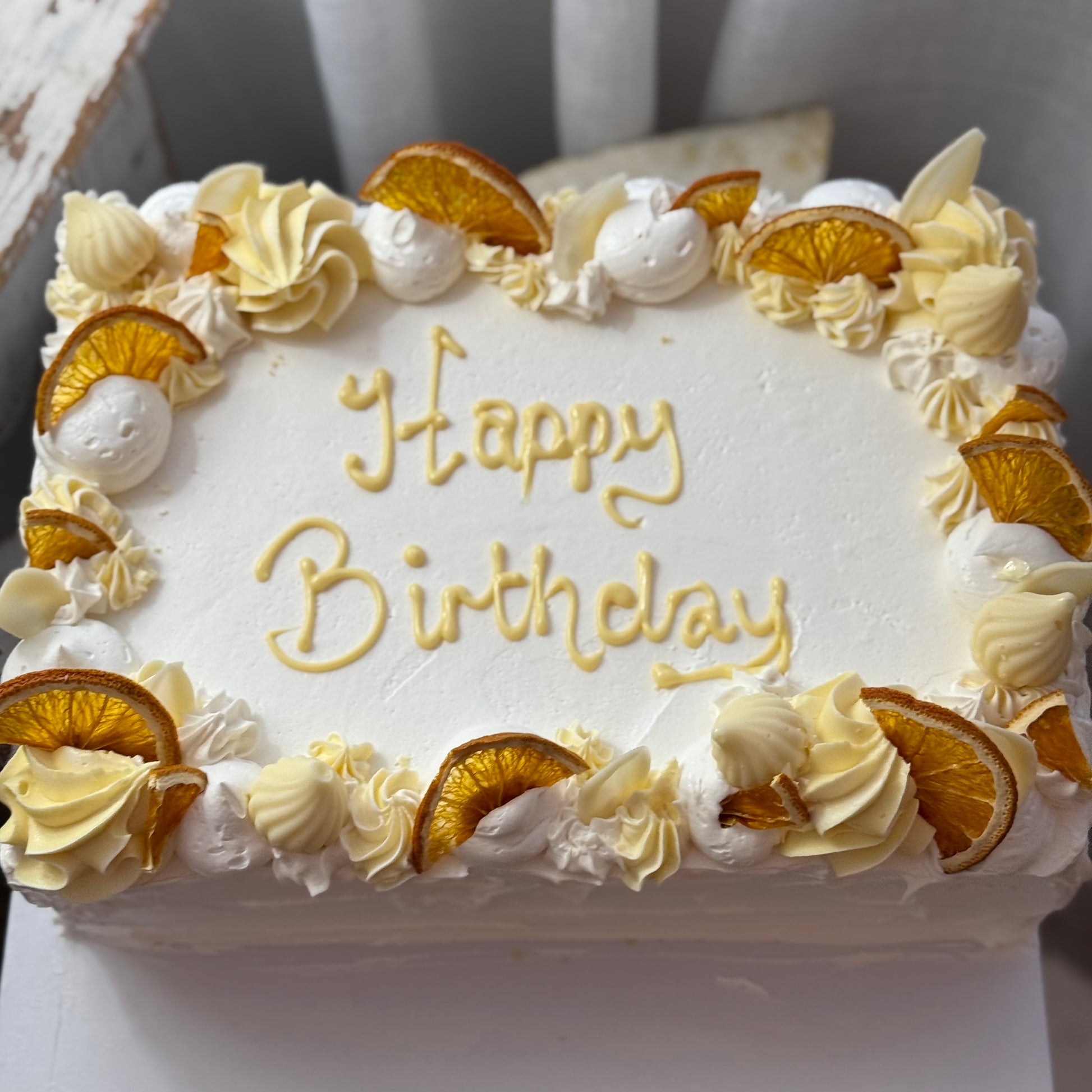 Light and airy vanilla cake with your desired filling, surrounded by a playful blend of ivory and citrus tones, hand-piped accents, and whimsical chocolate designs paired with zesty citrus slices. Choose to top it off with a touch of metallic flair.