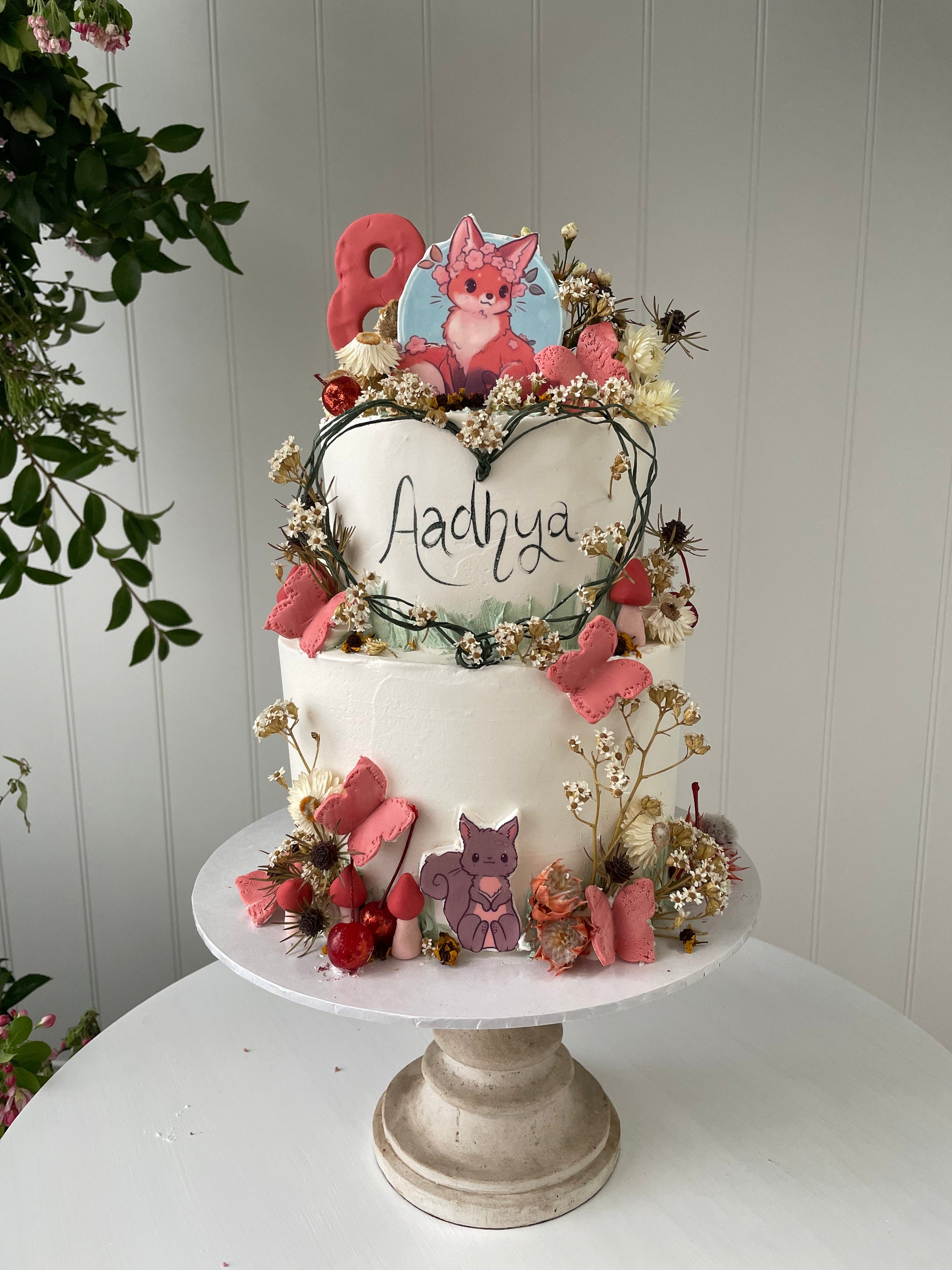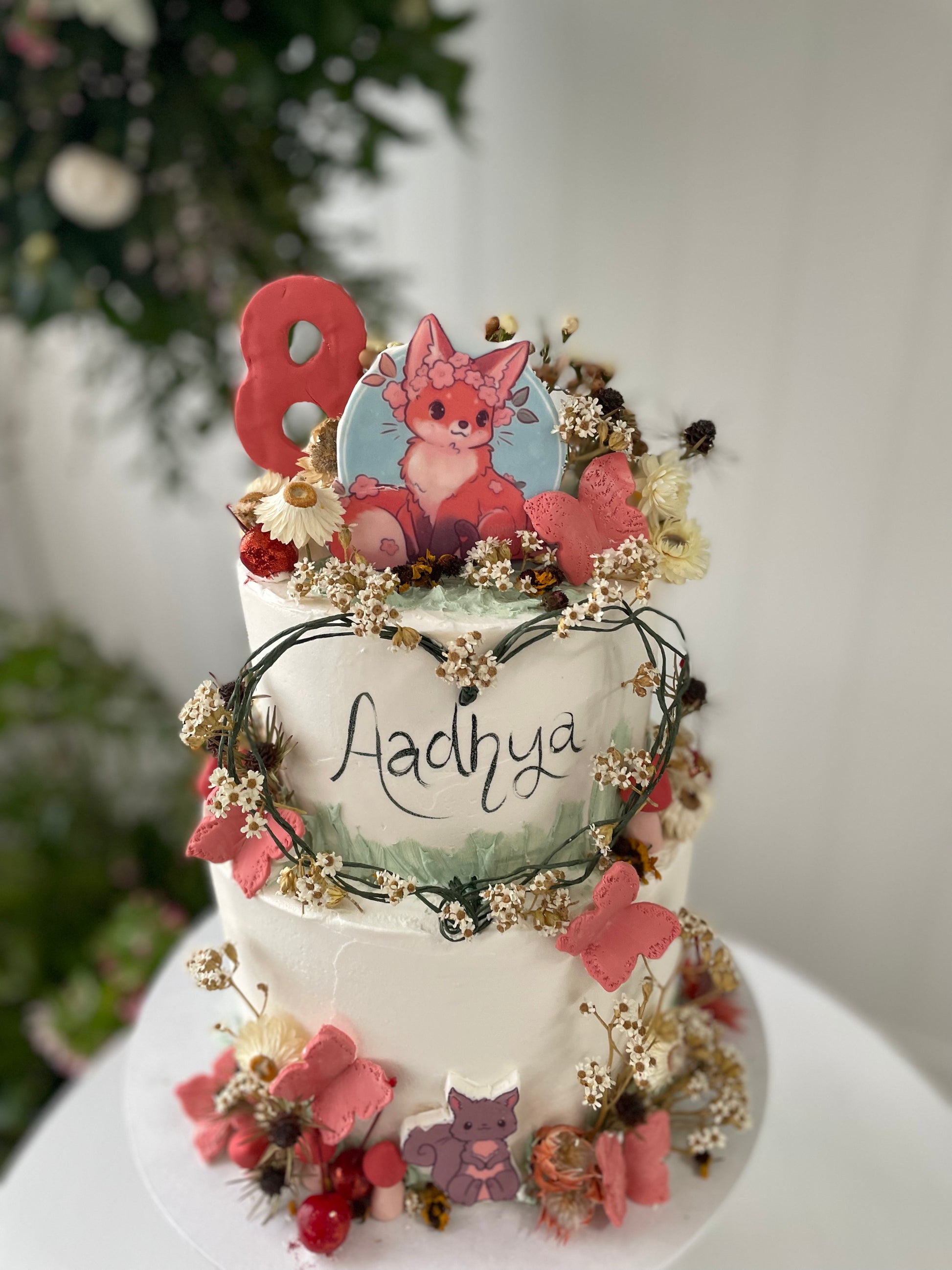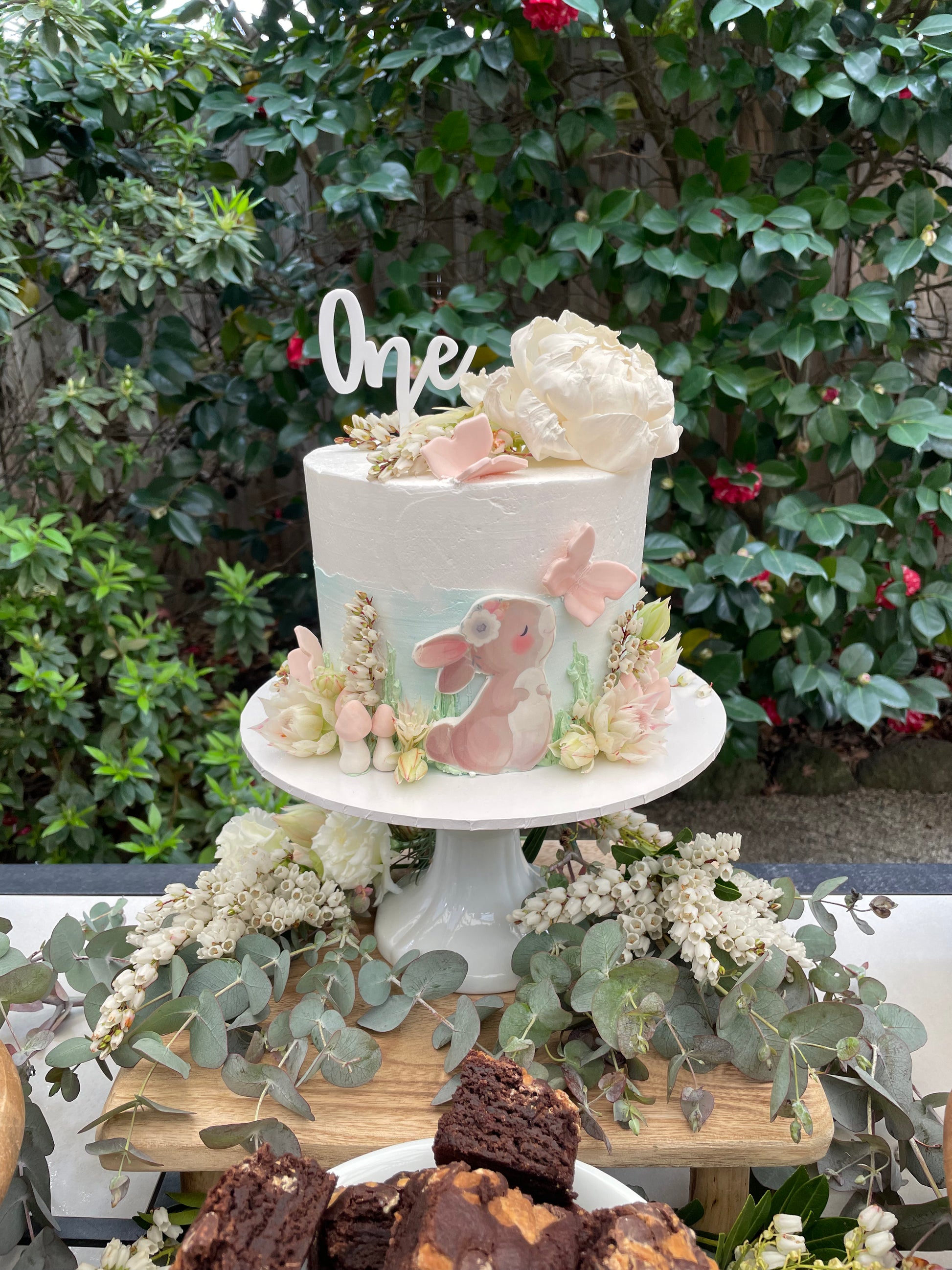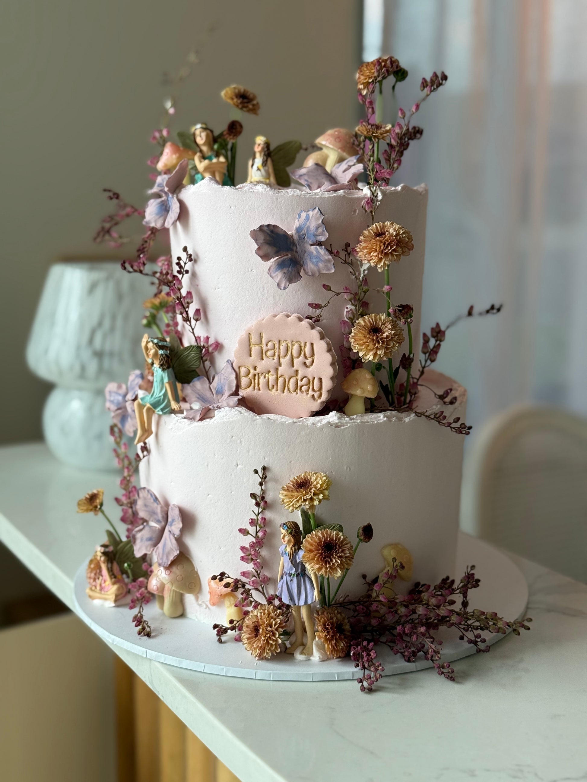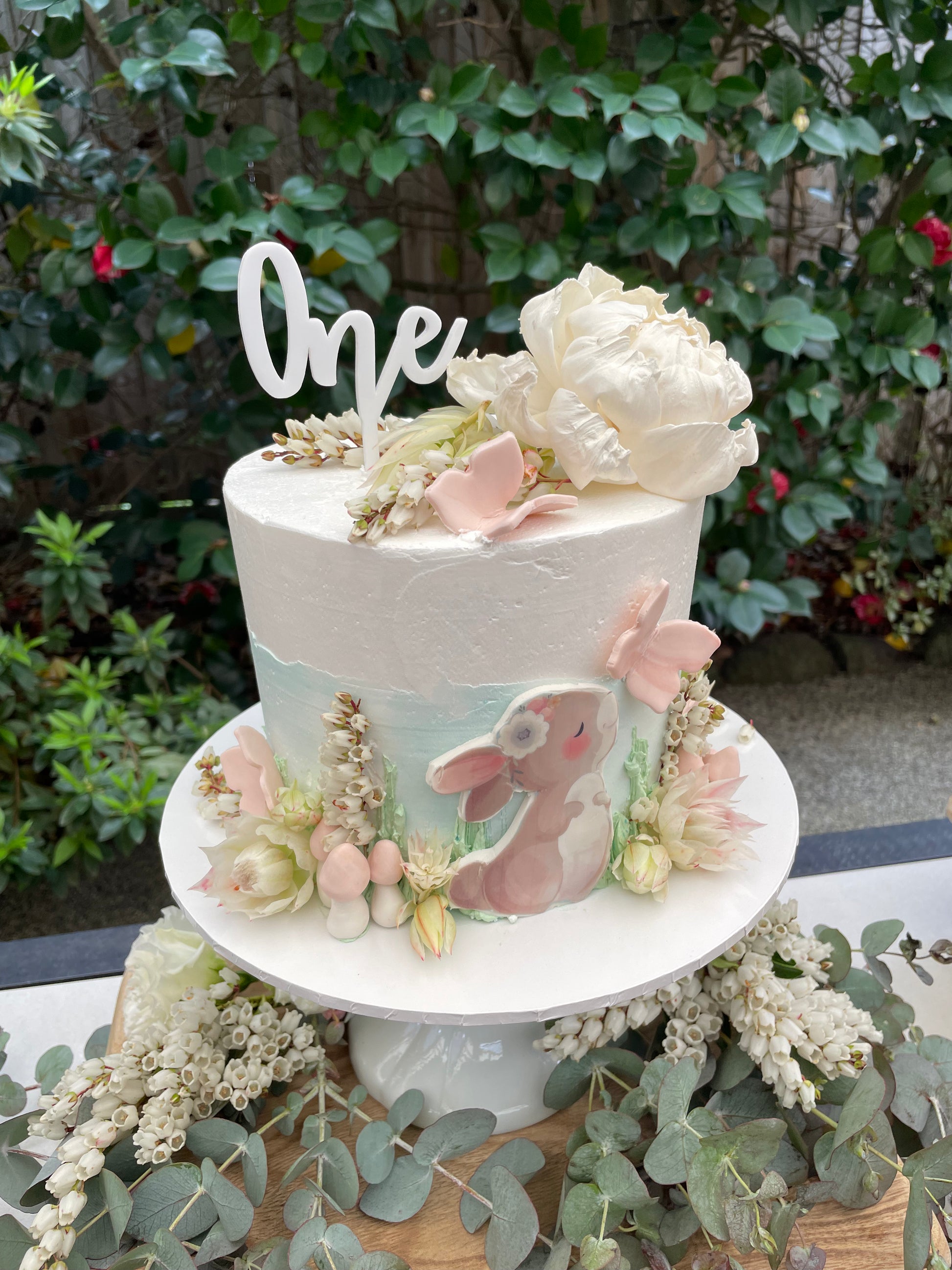 Filled sponge cake with a marble buttercream icing buttercream icing. Decorated with flowers and cartoon animals of your choice.