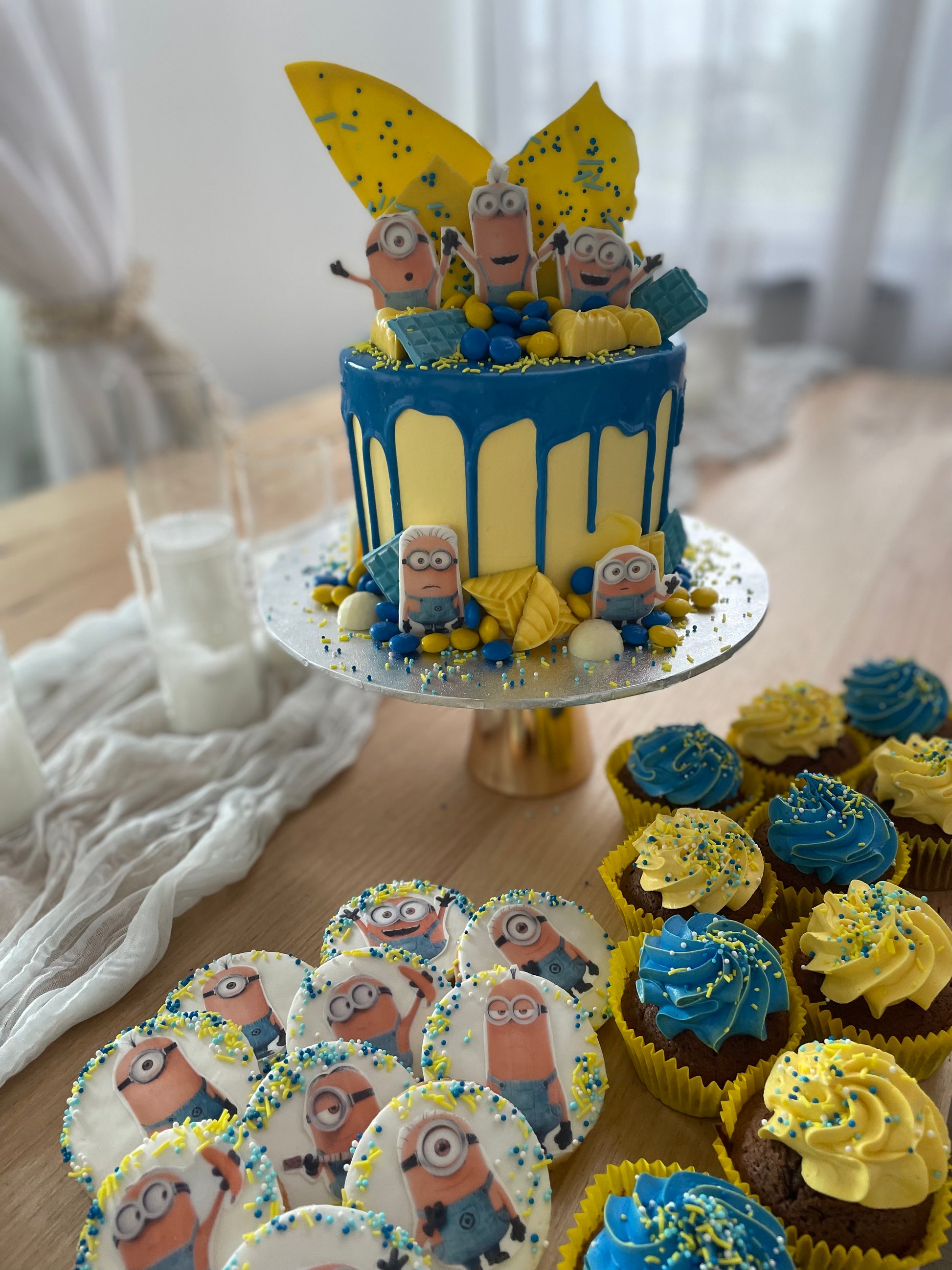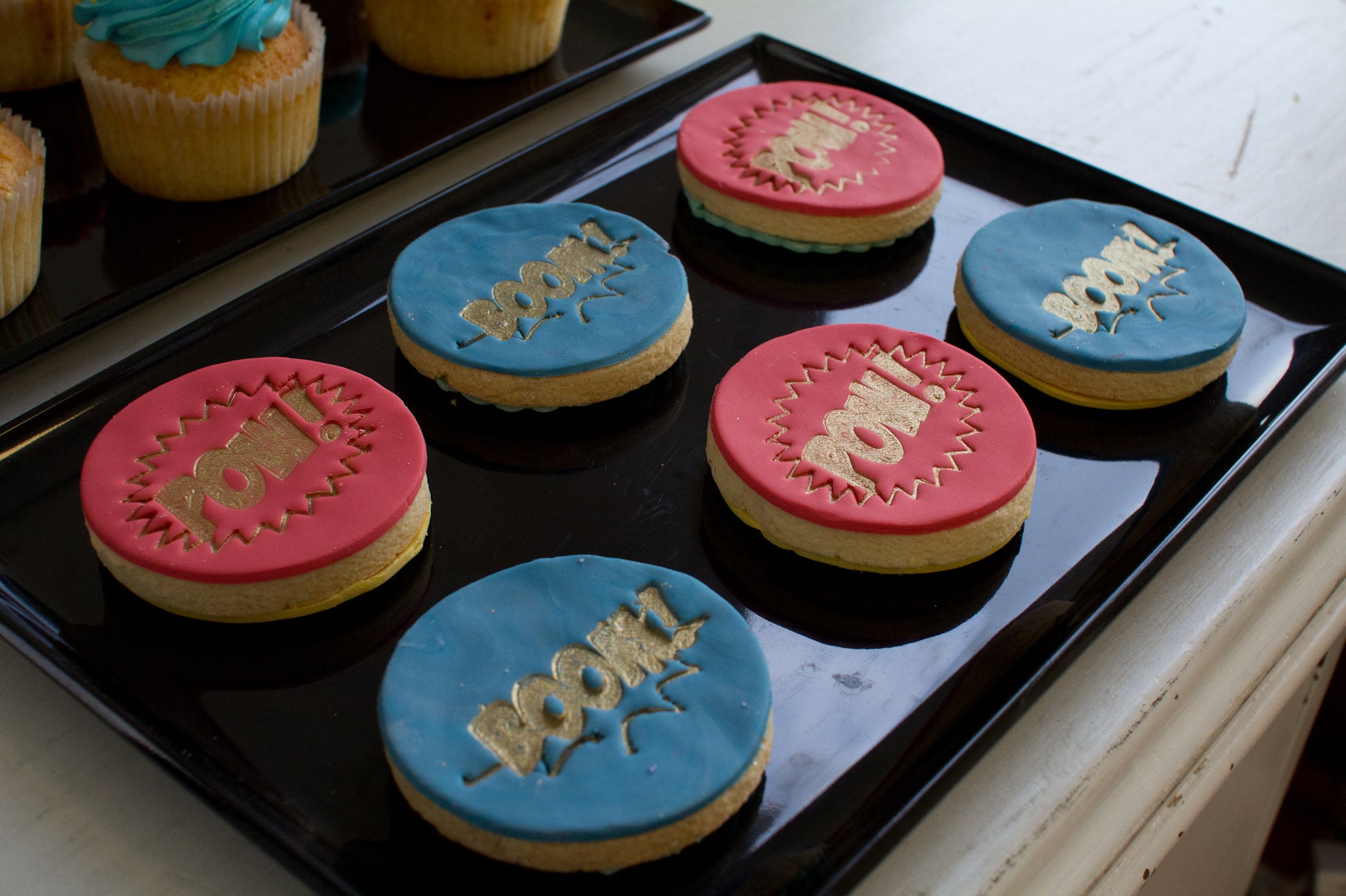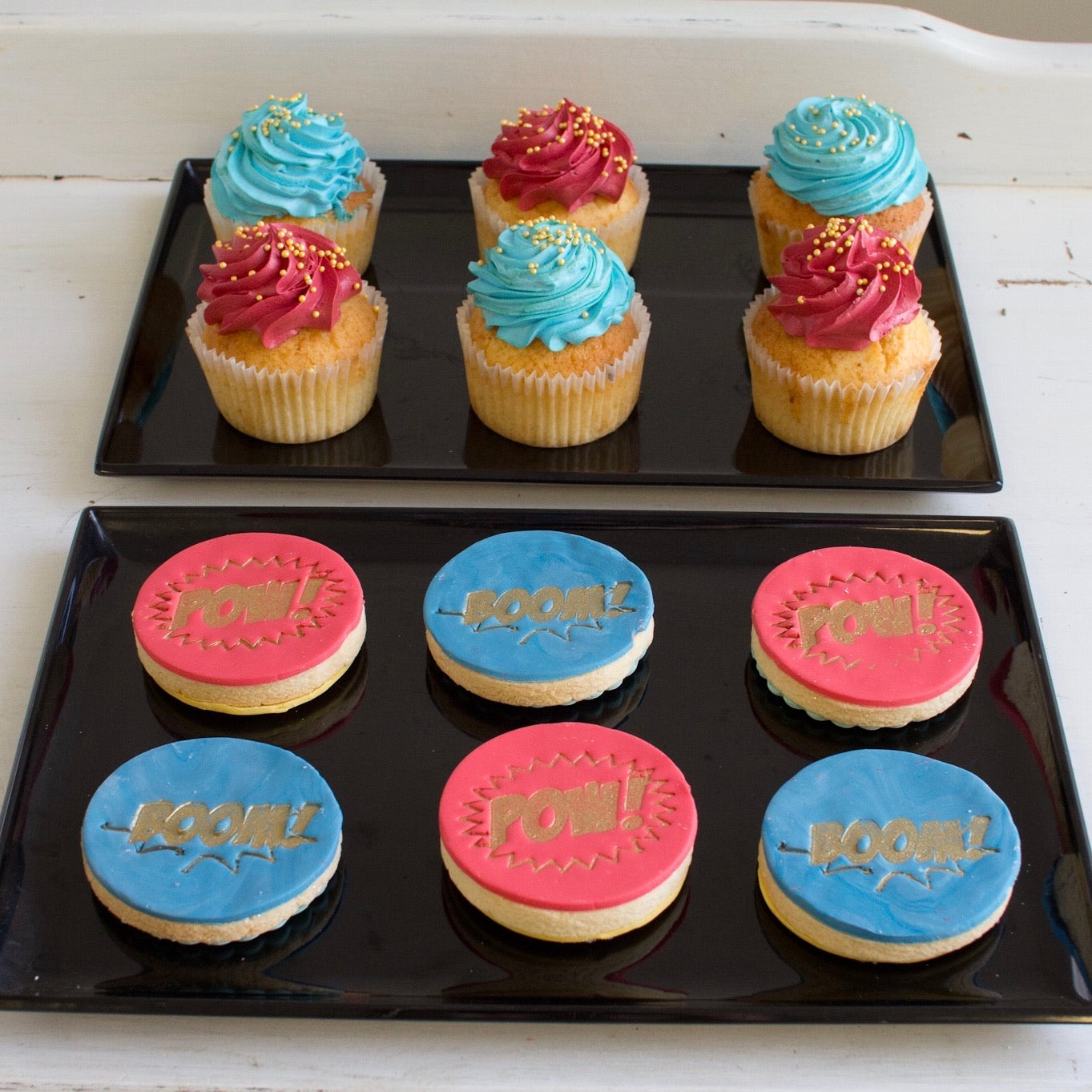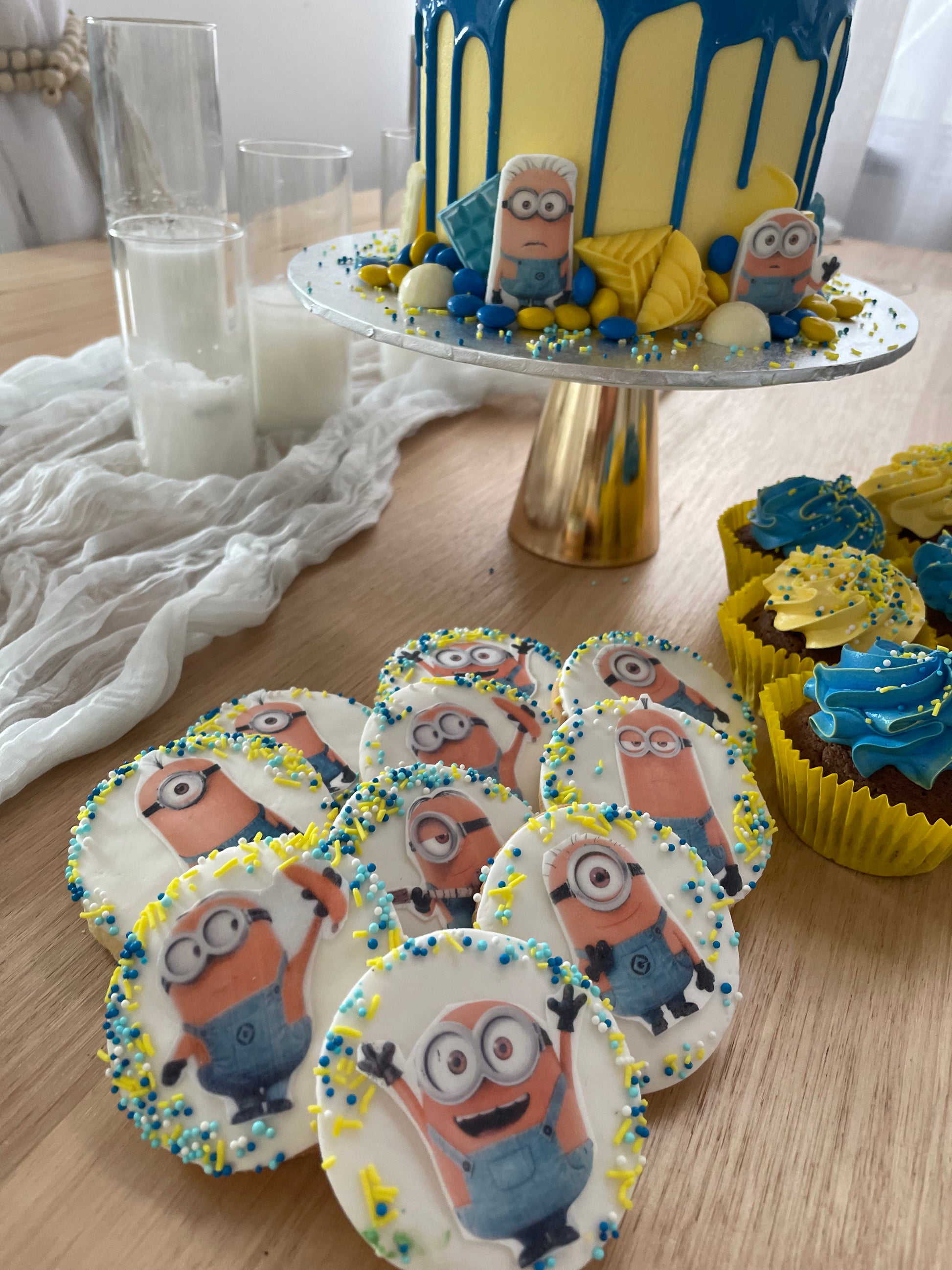 Filled sponge cake smooth buttercream icing, with drizzle, and decorations to match your Hero. Cookies with hero print and cupcakes to match your chosen colours.