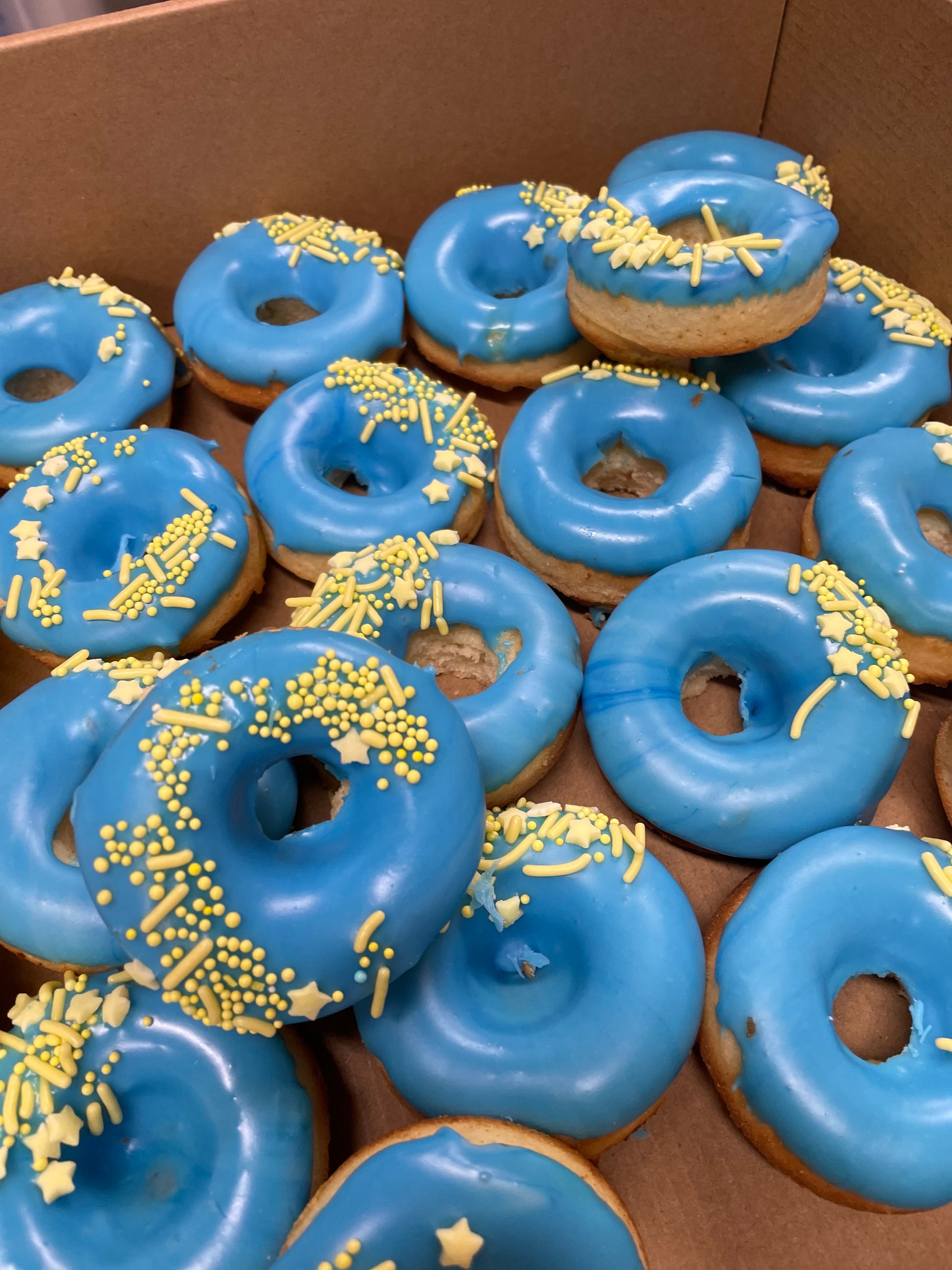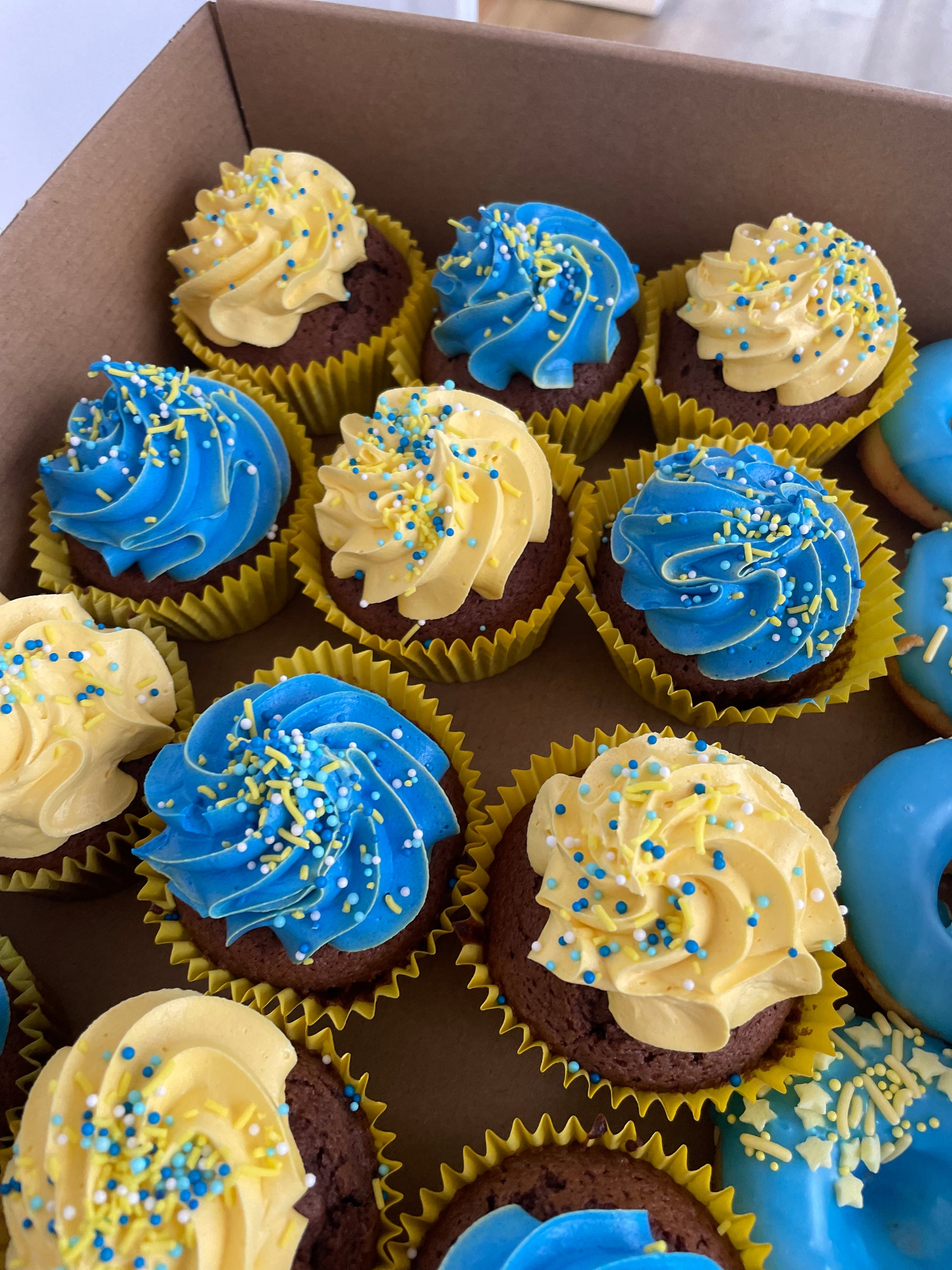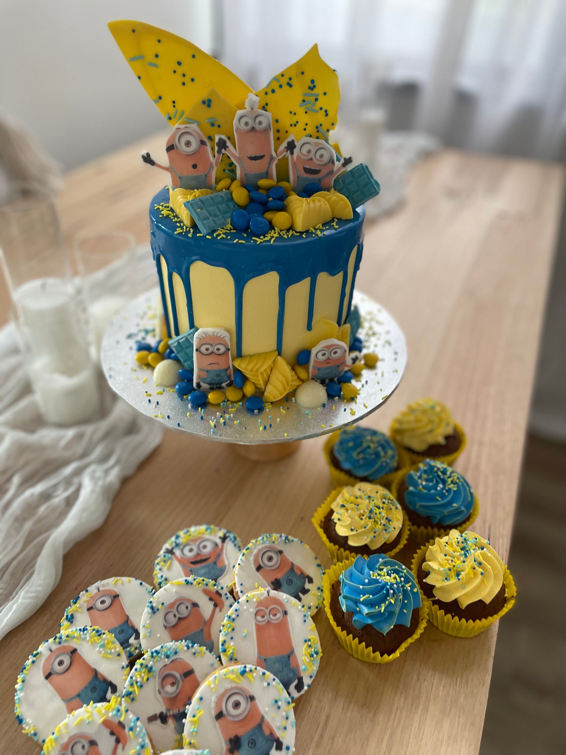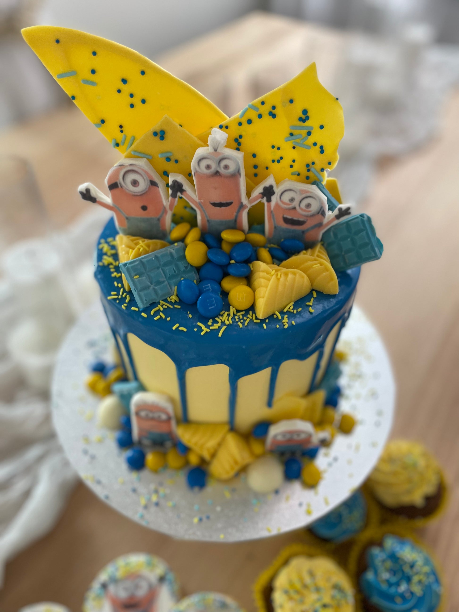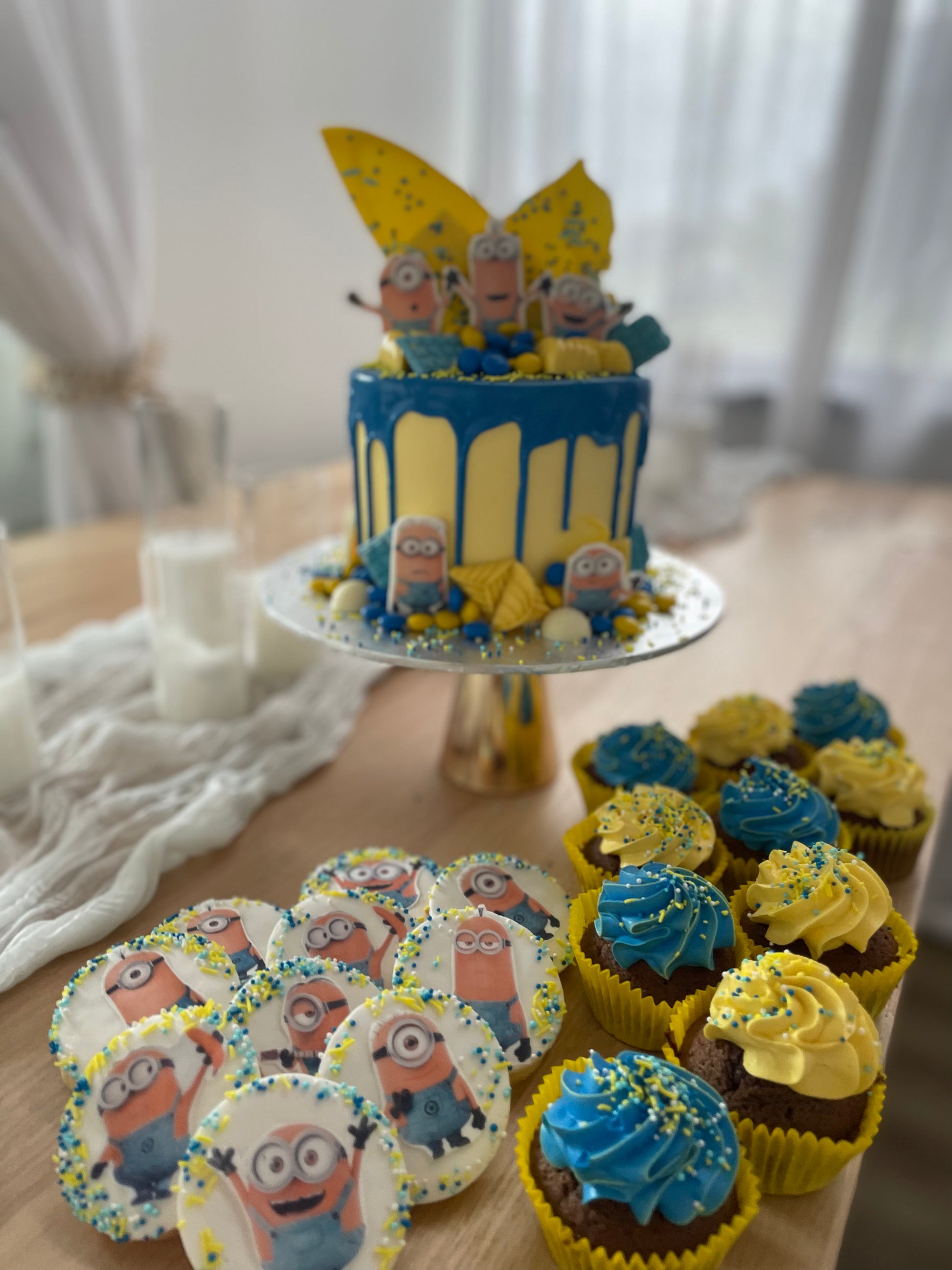 Filled sponge cake smooth buttercream icing, with drizzle, and decorations to match your Hero. Cookies with hero print and cupcakes to match your chosen colours.