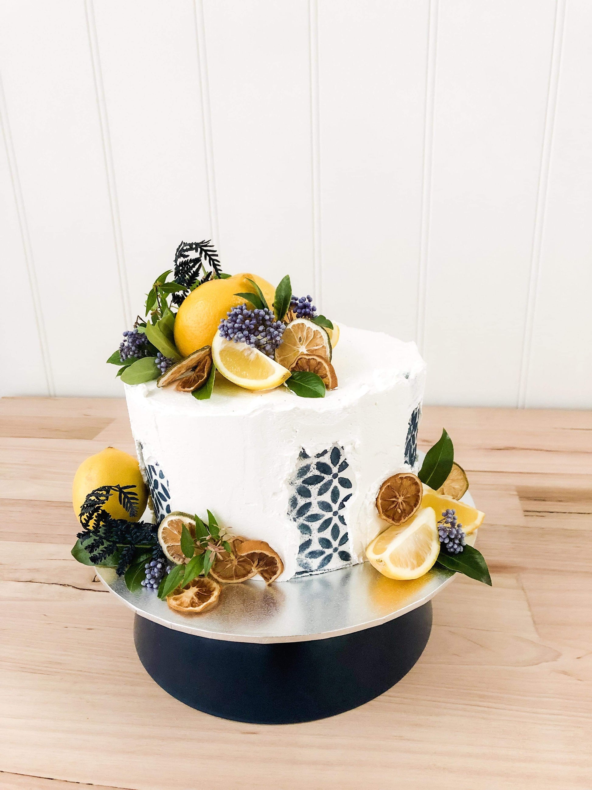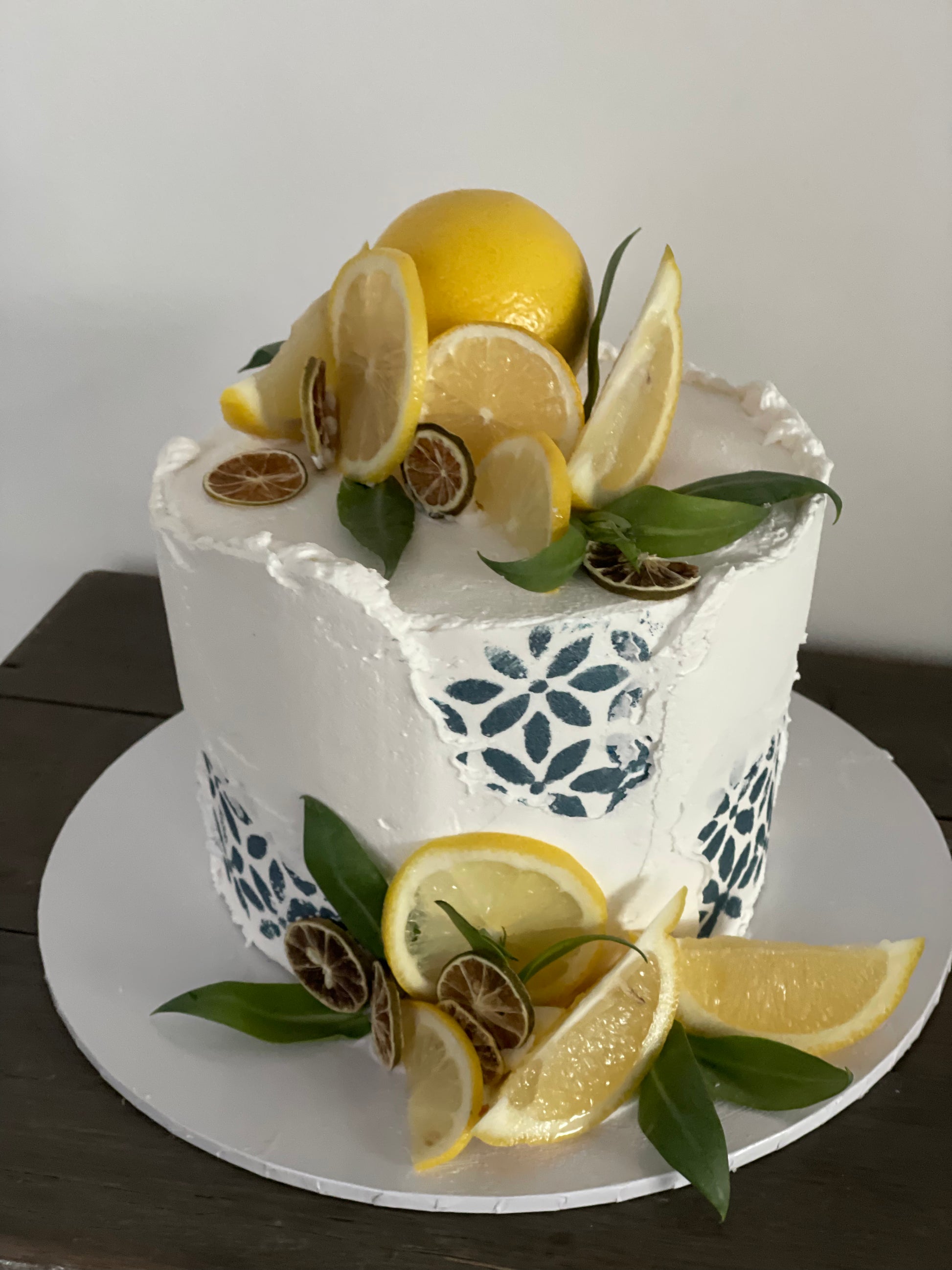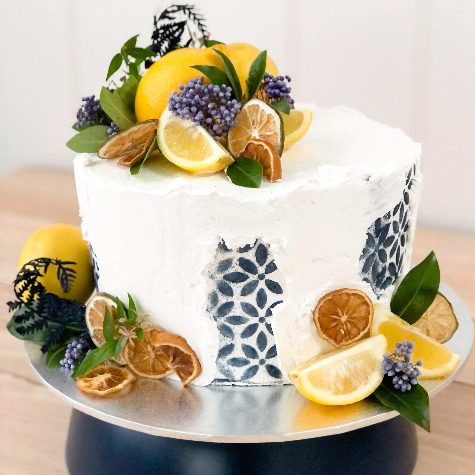 Filled Sponge cake with your choice of flavour and filling. Decorated with blue edible tile print, Lemons and foliage.