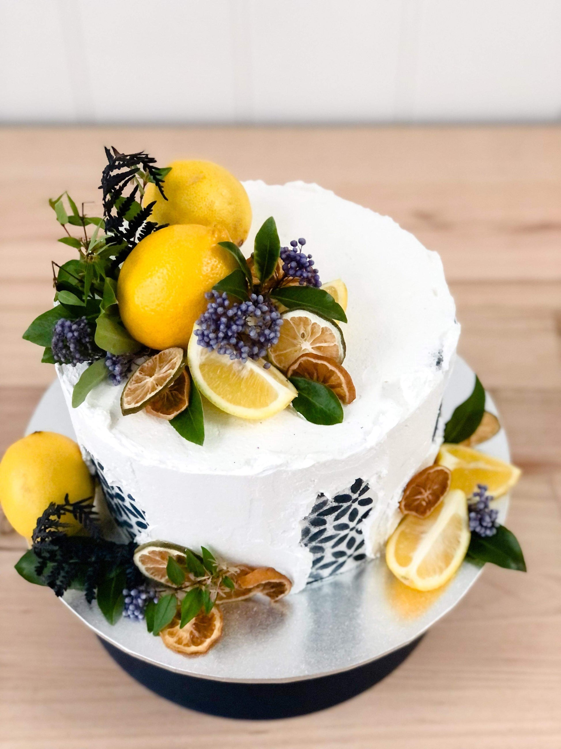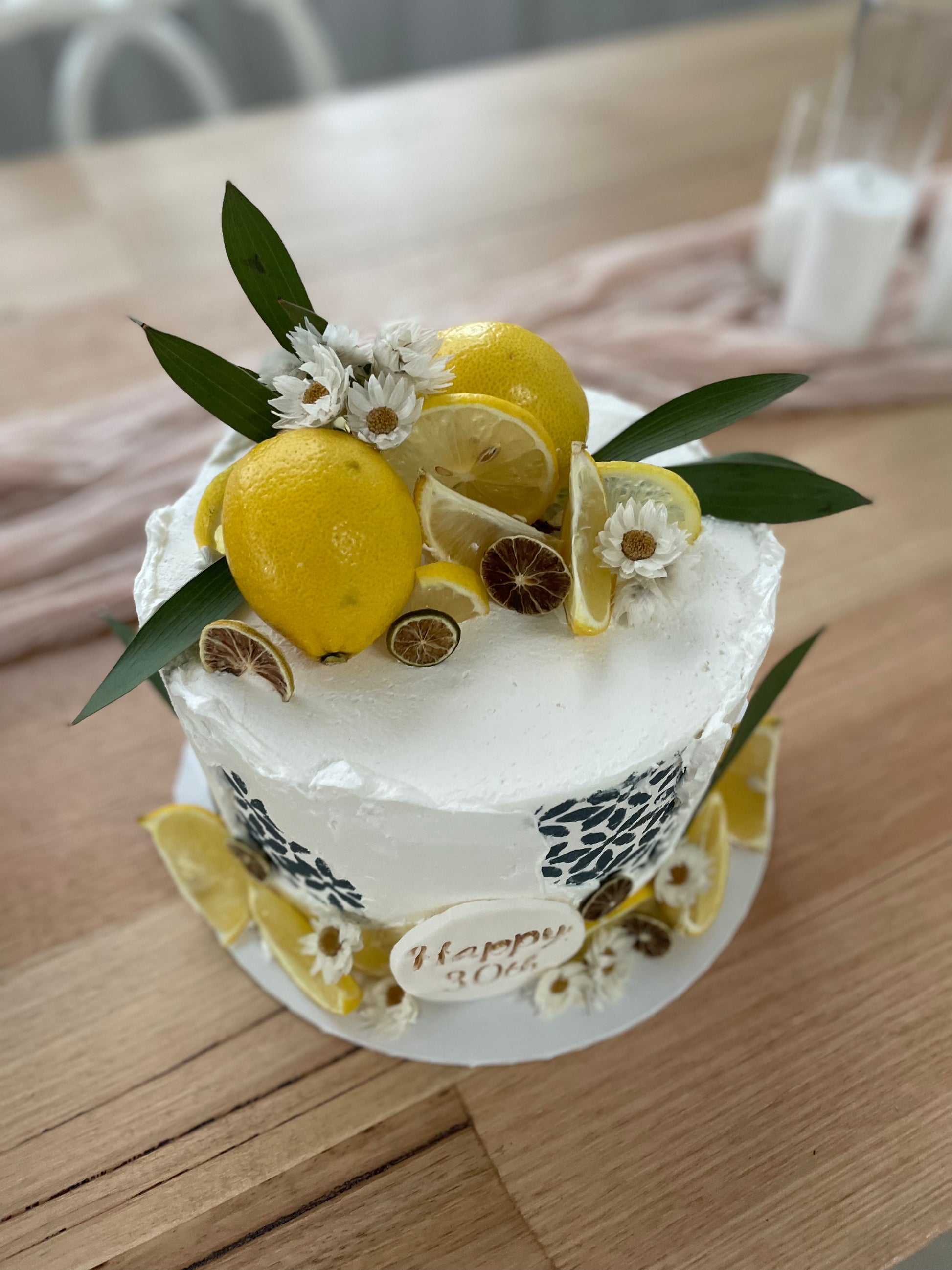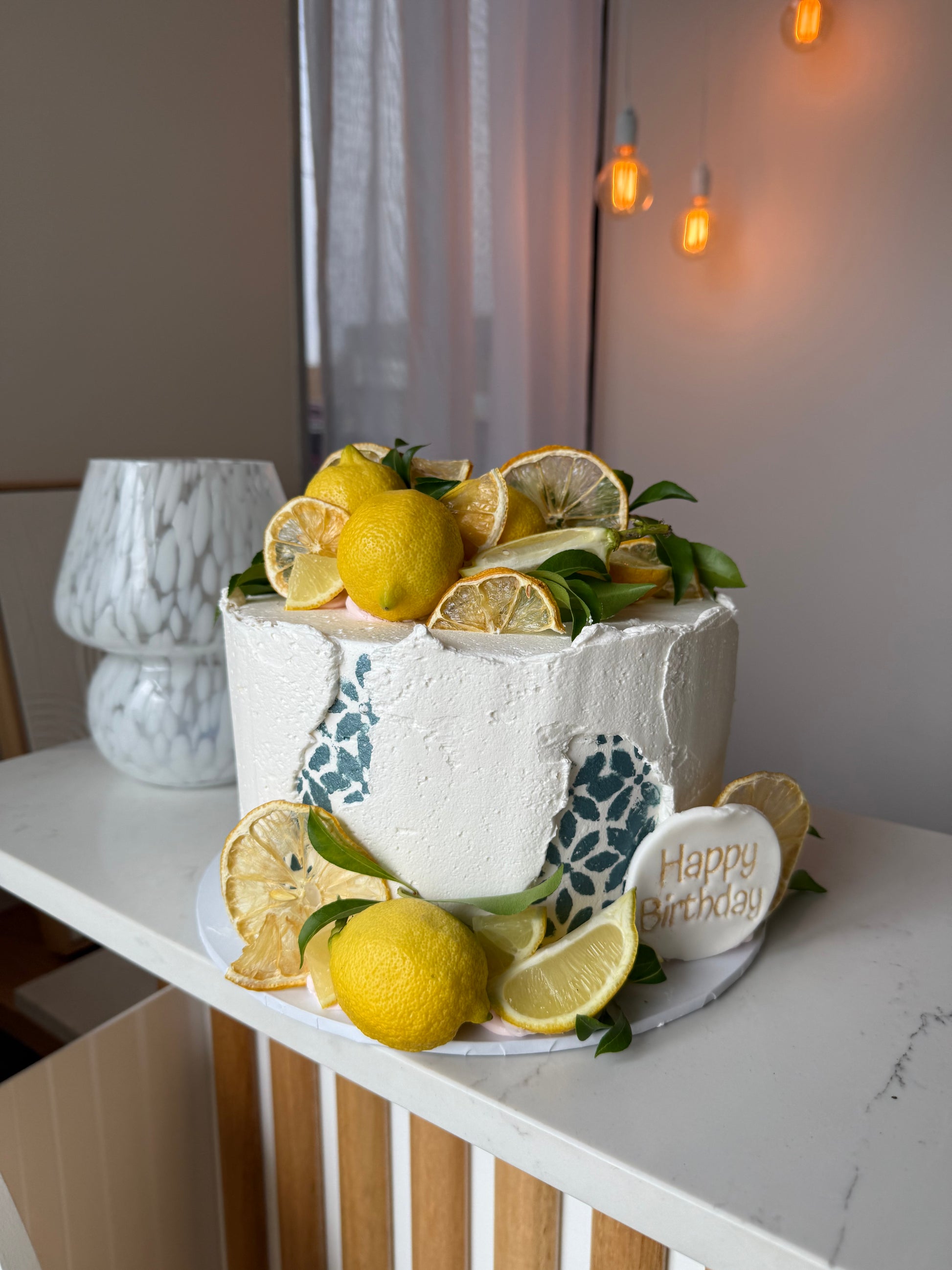 Filled Sponge cake with your choice of flavour and filling. Decorated with blue edible tile print, Lemons and foliage.