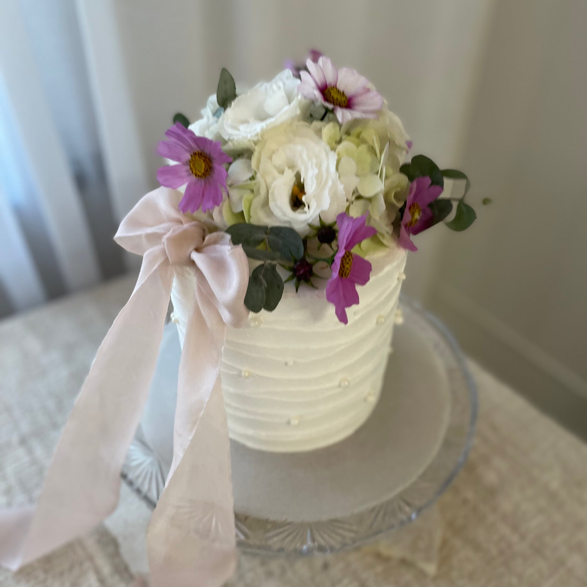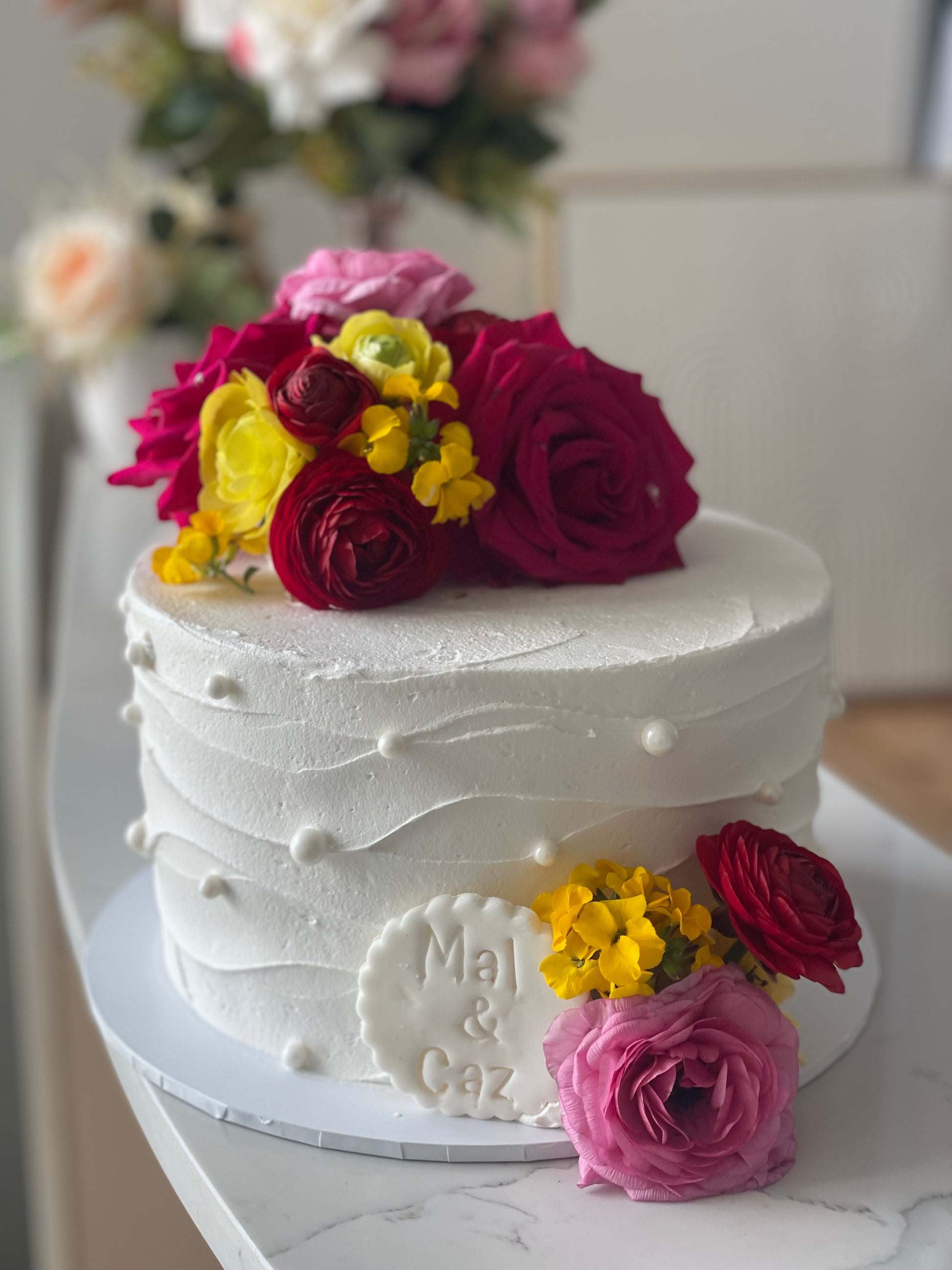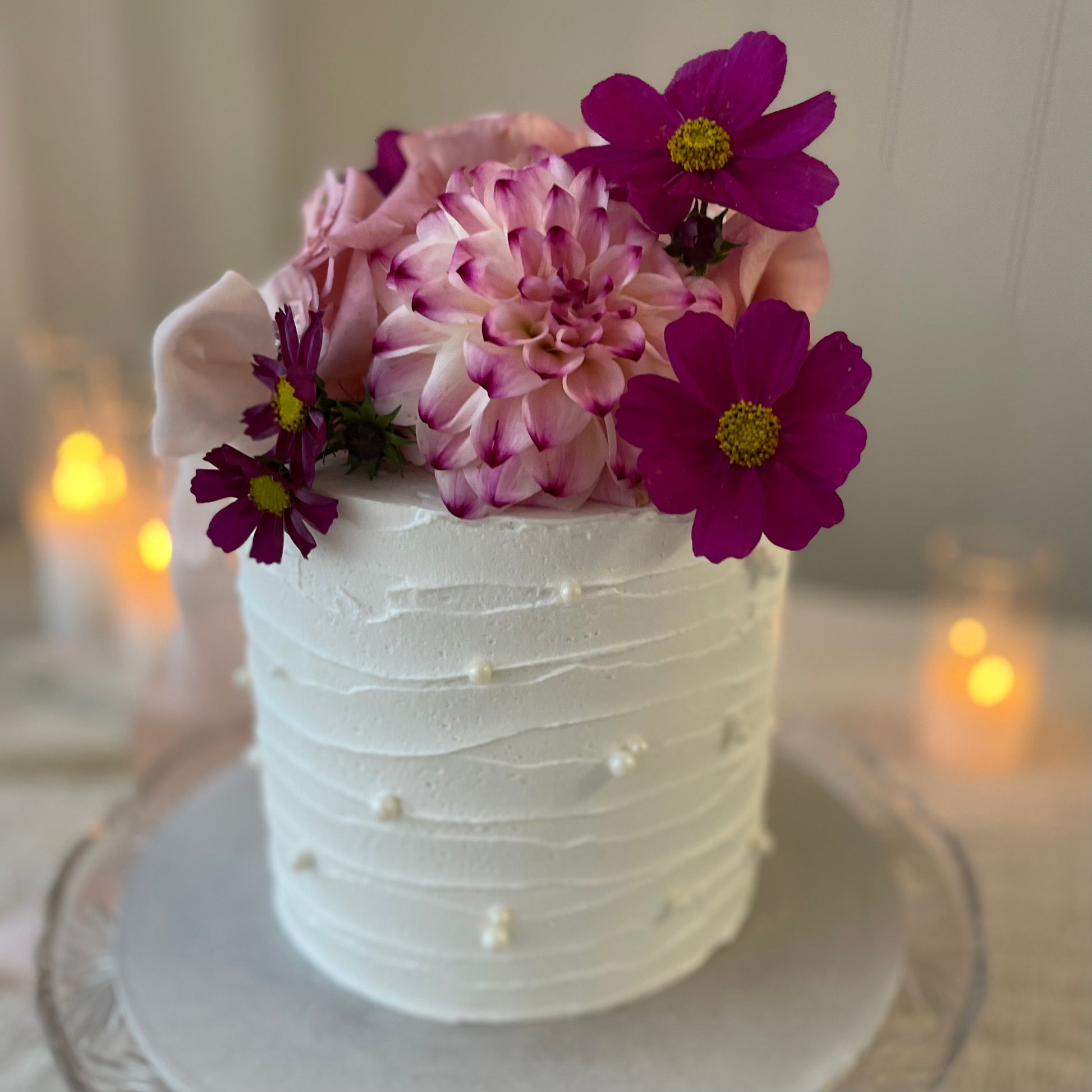 Filled sponge cake with your choose of filling. With a wave buttercream and added sugar pearls. Finished with fresh flowers. Choose to add ribbon