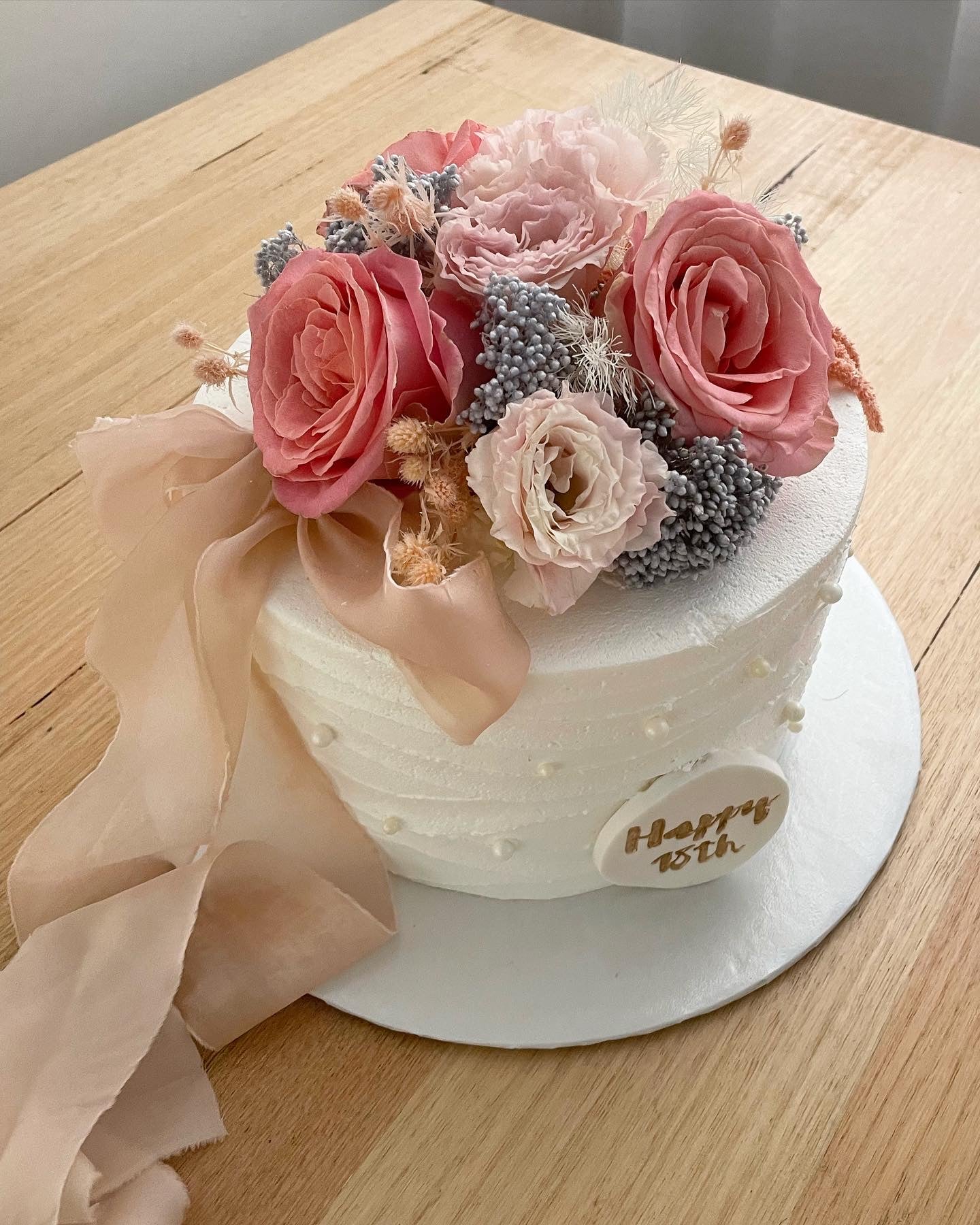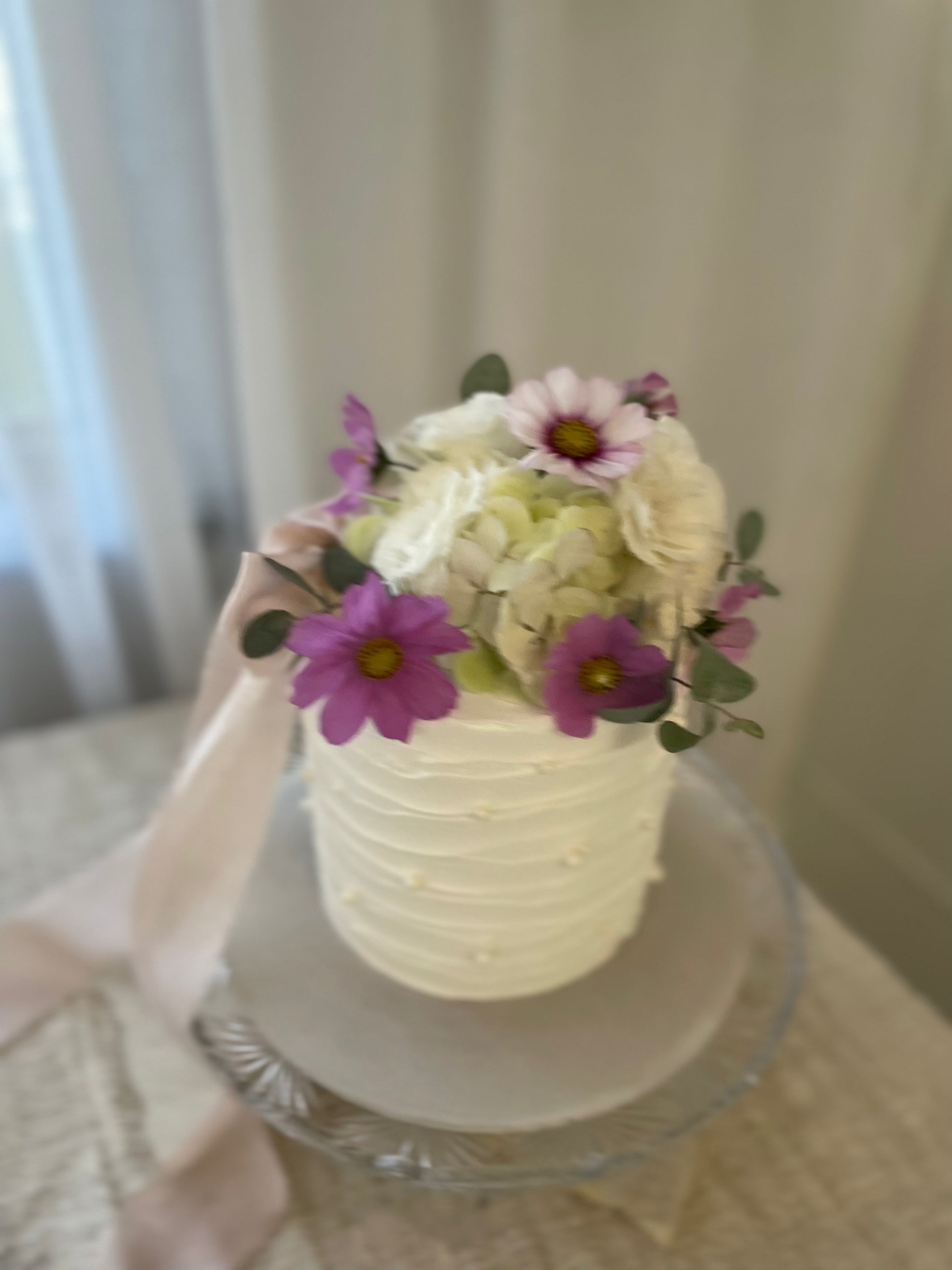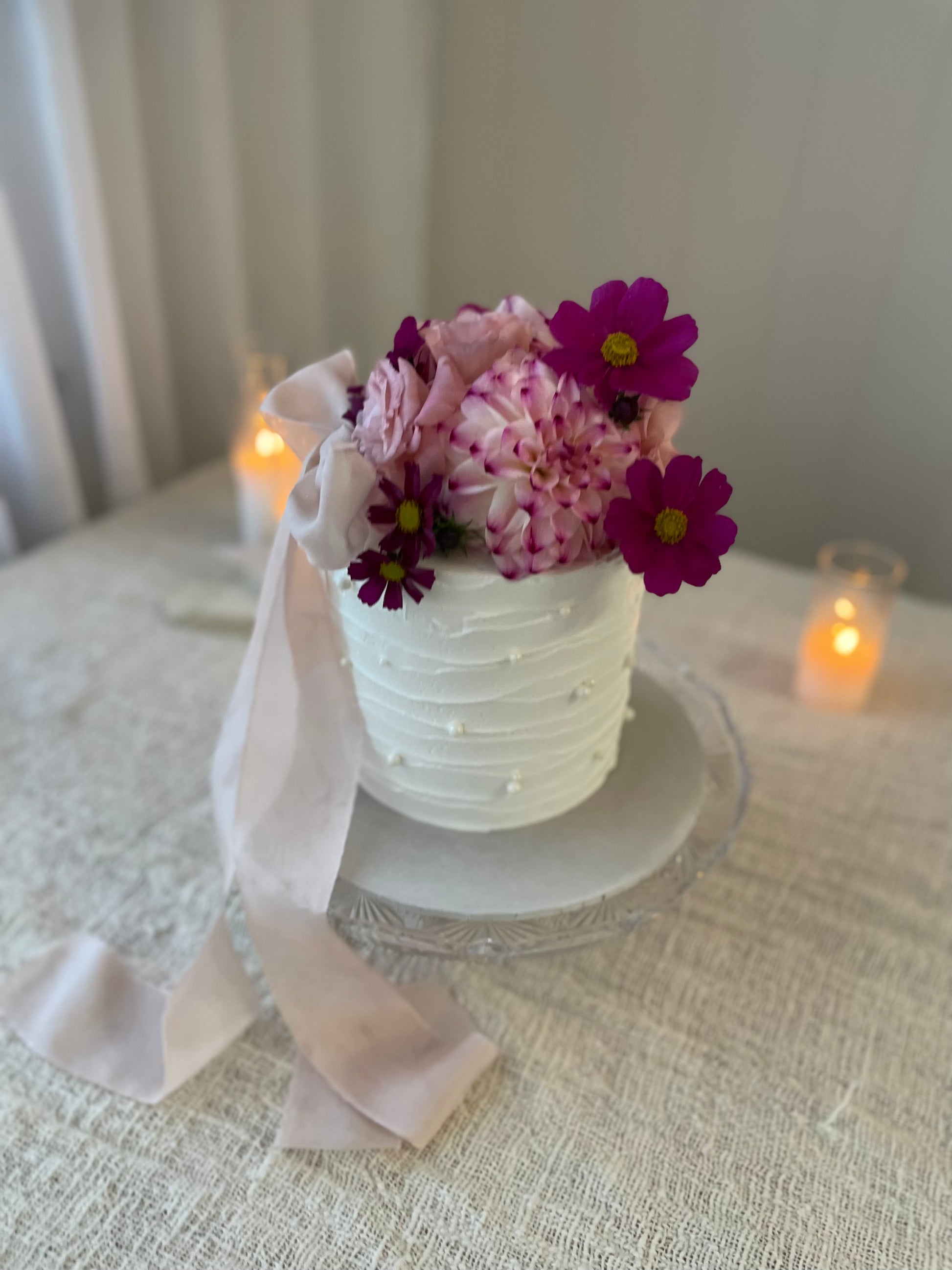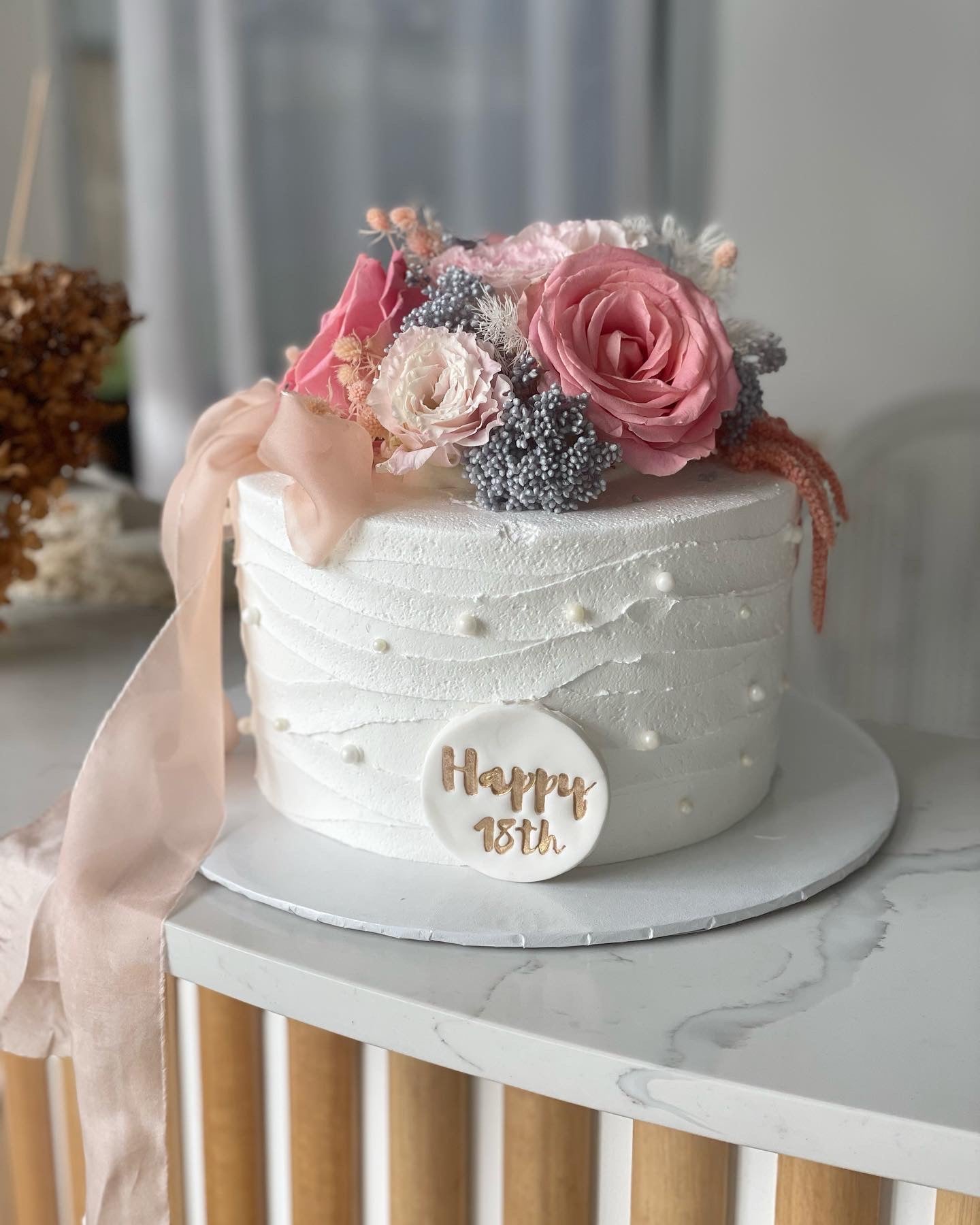 Filled sponge cake with your choose of filling. With a wave buttercream and added sugar pearls. Finished with fresh flowers. Choose to add ribbon