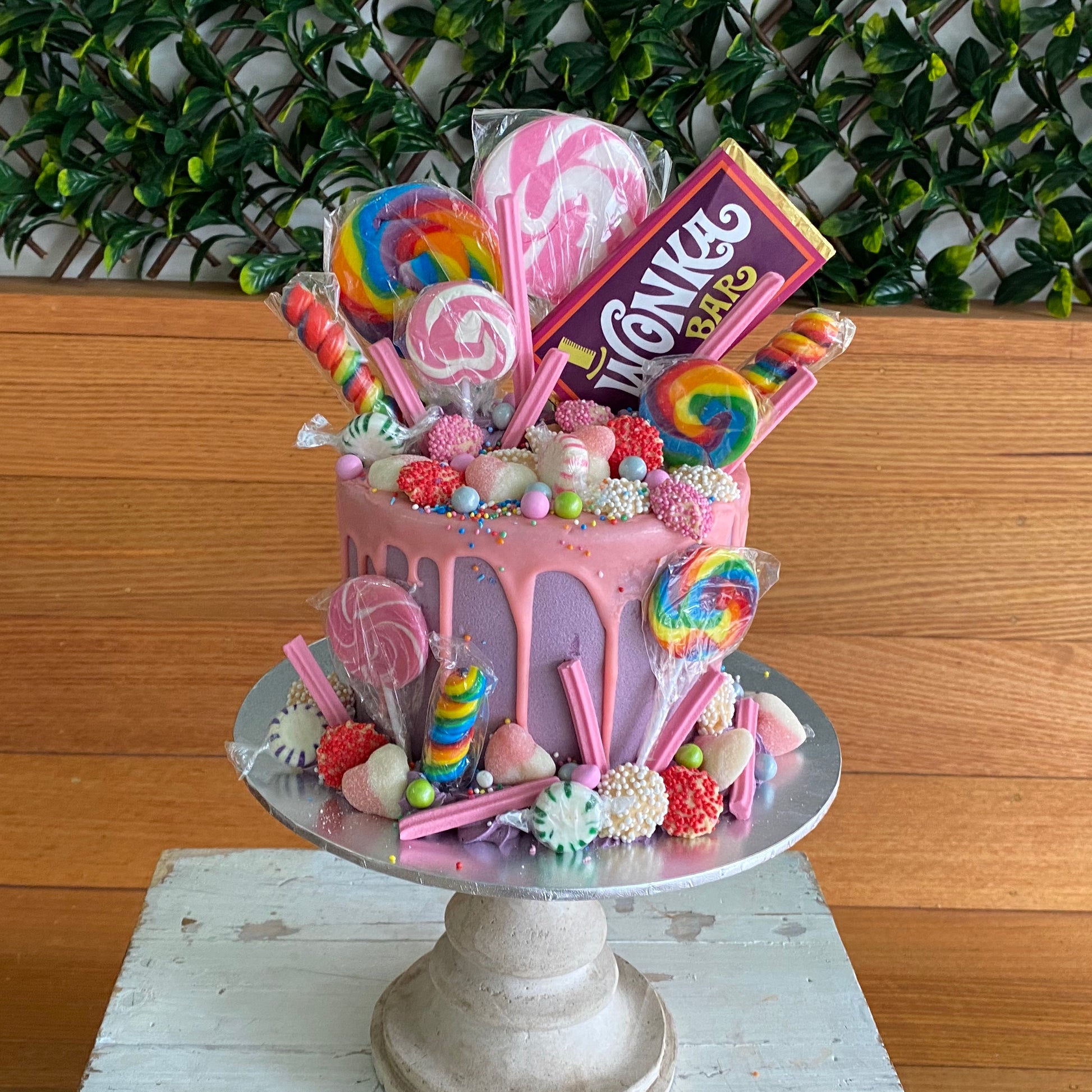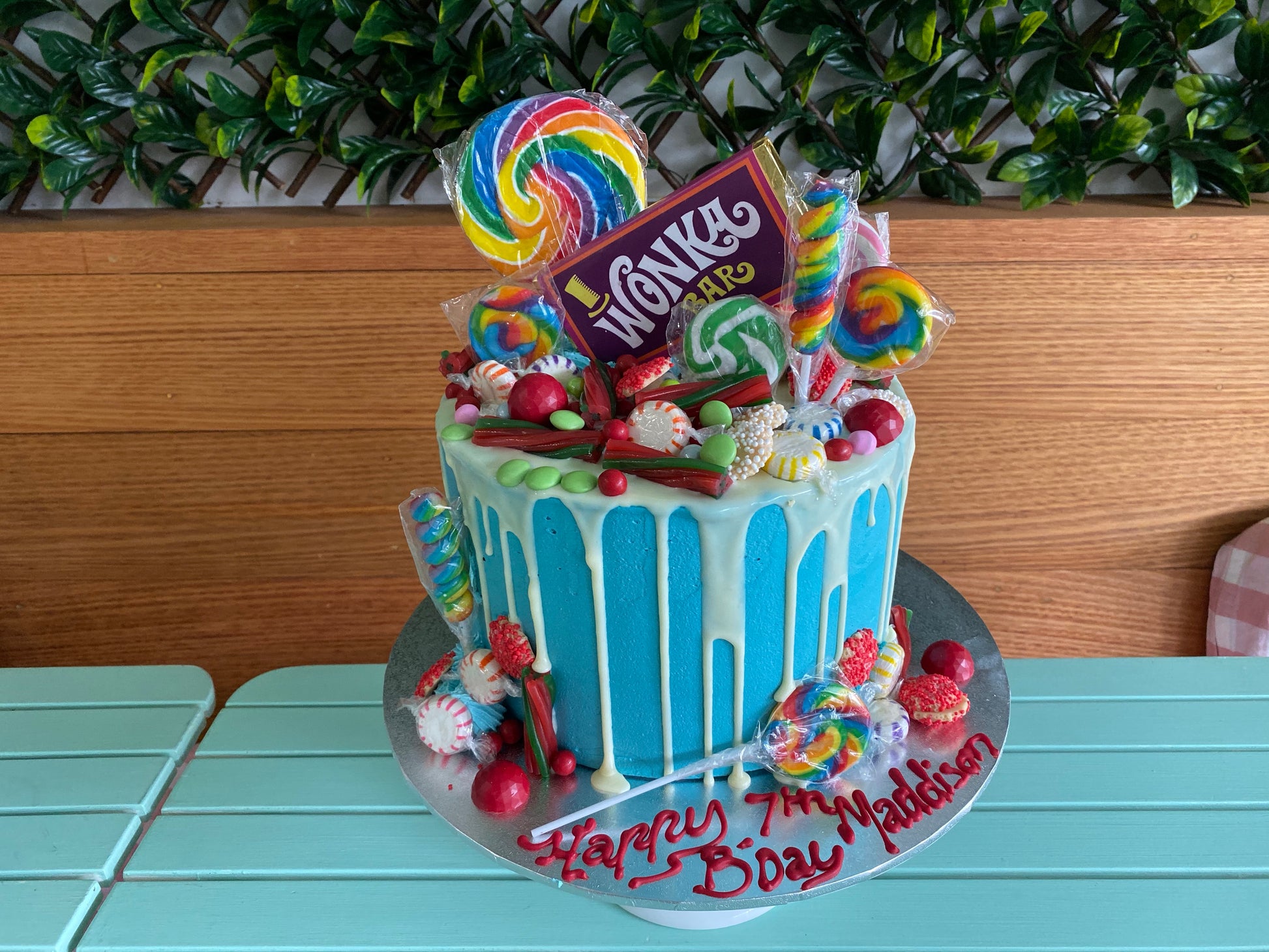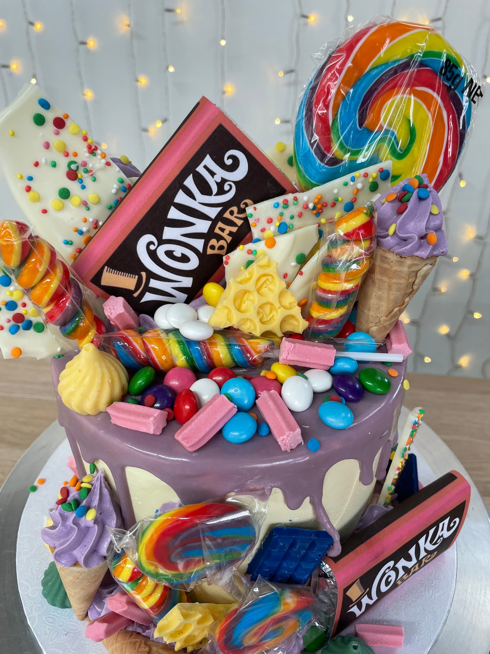 Filled Sponge cake with a smooth buttercream icing finish. Decorated with a rich ganache drizzle, loads of colourful lollies and your very own Wonka bar. You choose your colours and we will do the rest.