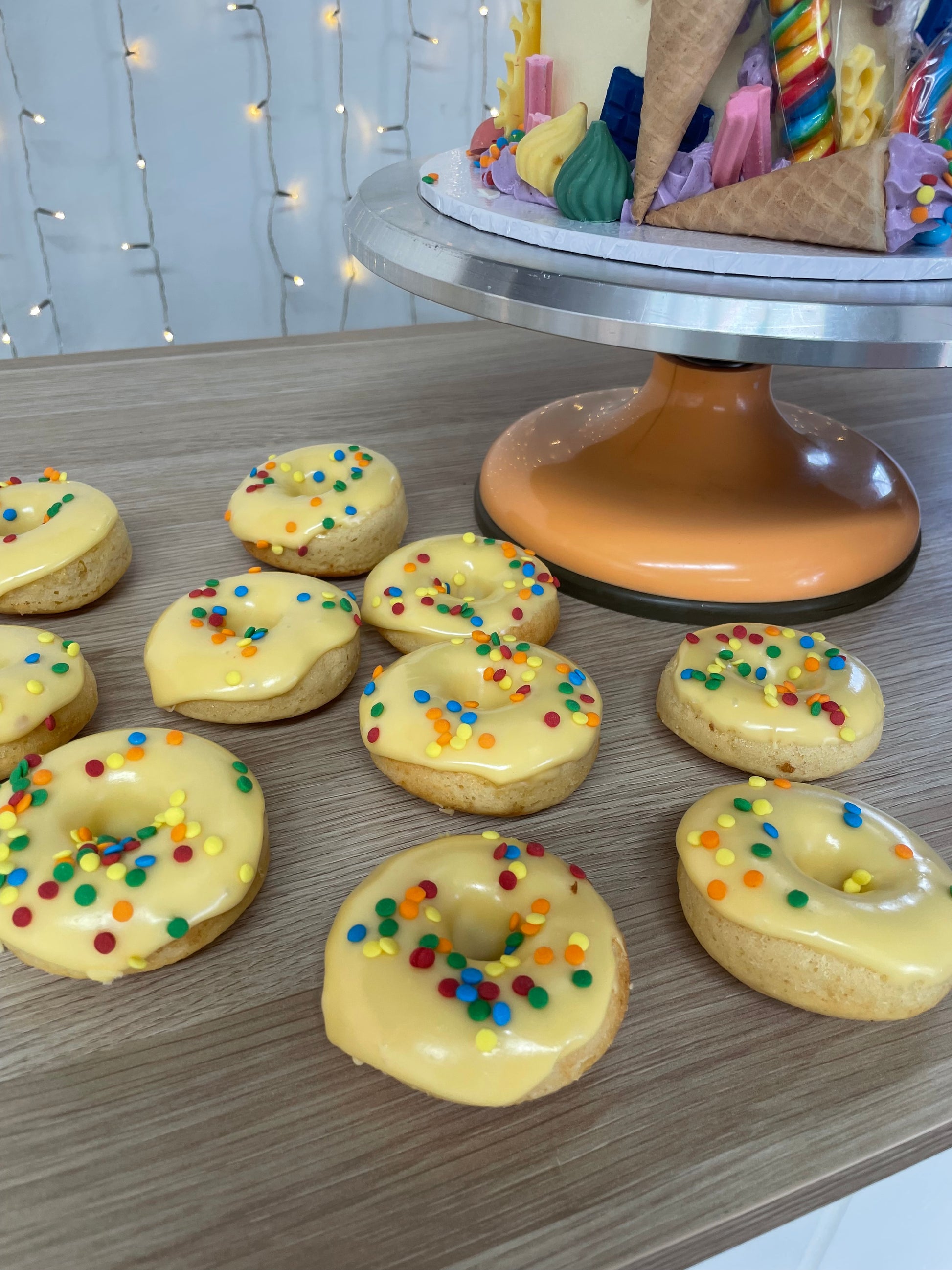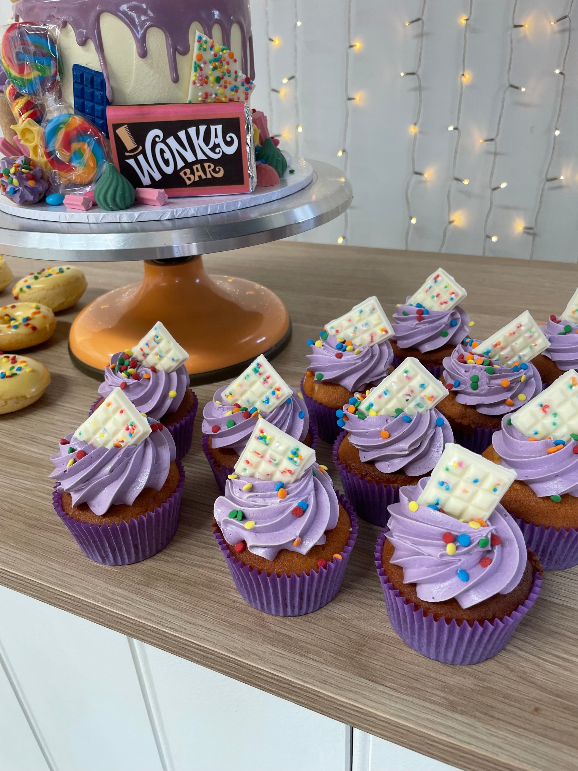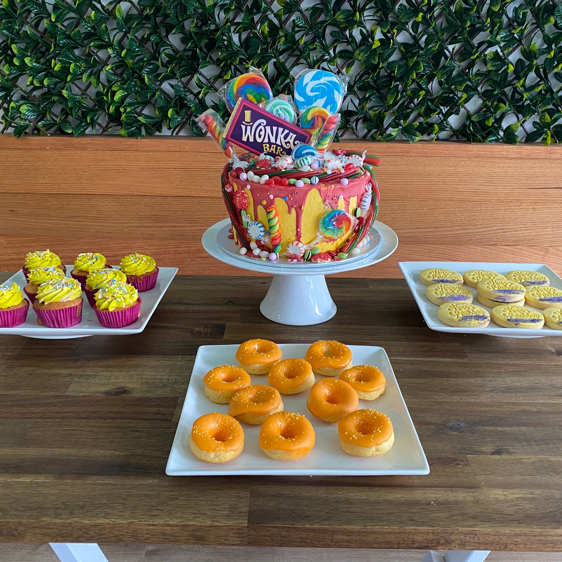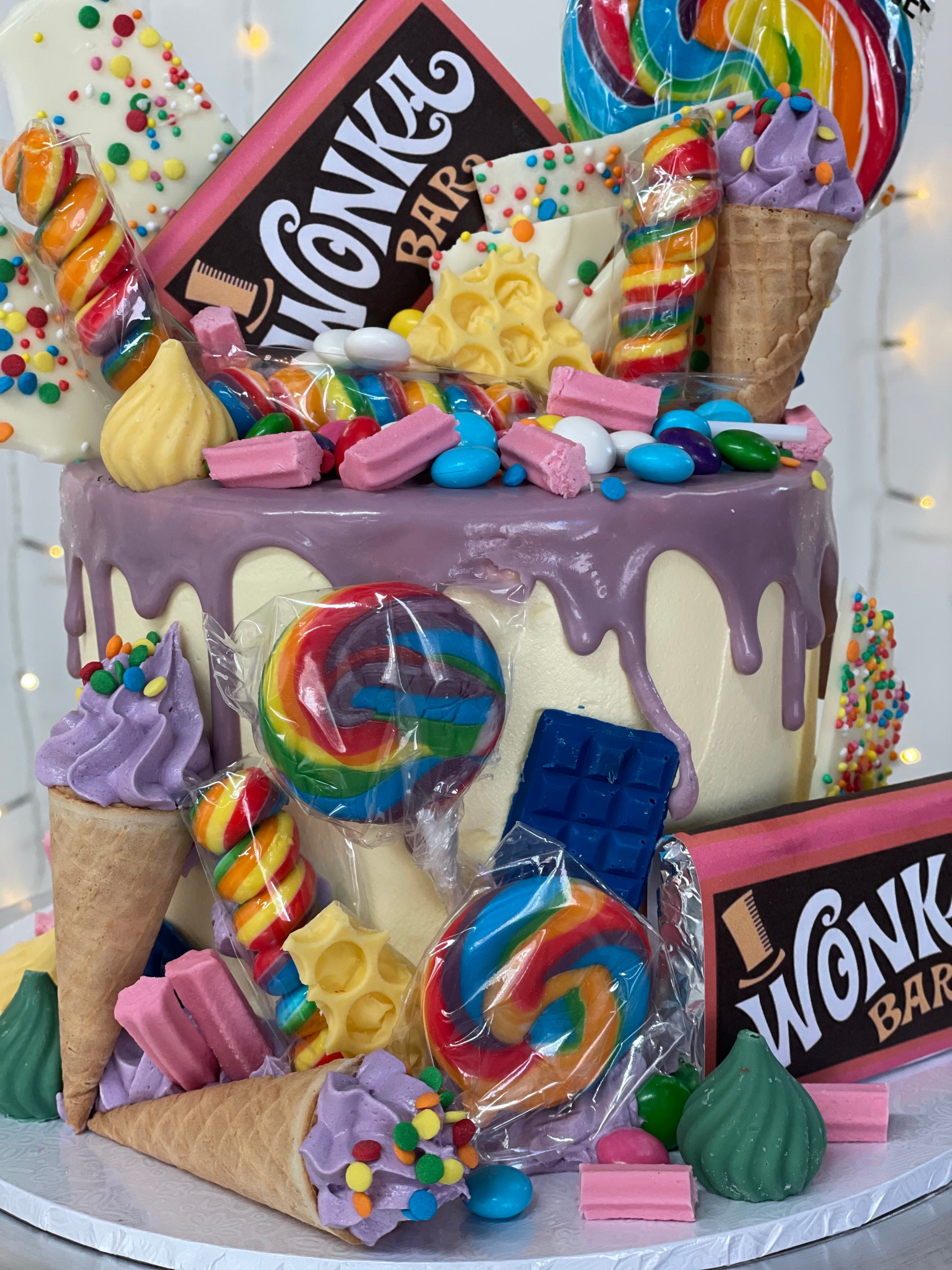 Filled Sponge cake with a smooth buttercream icing finish. Decorated with a rich ganache drizzle, loads of colourful lollies and your very own Wonka bar. You choose your colours and we will do the rest.