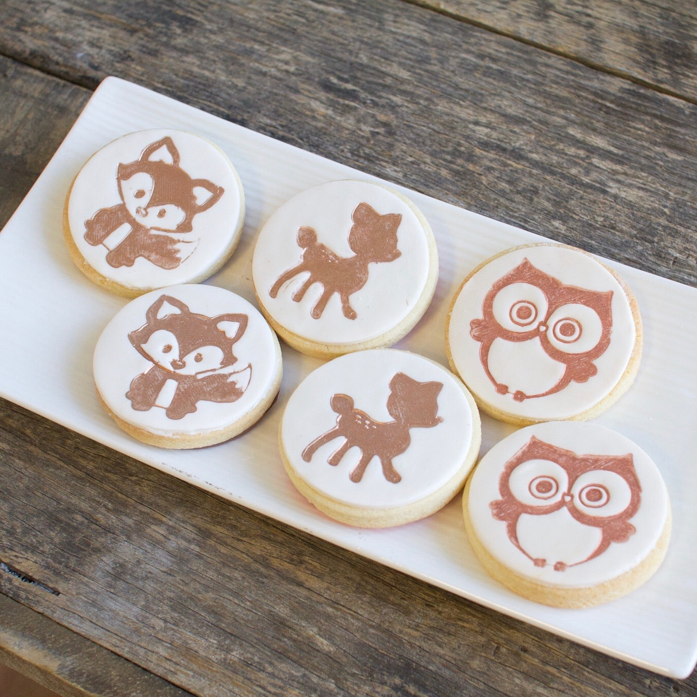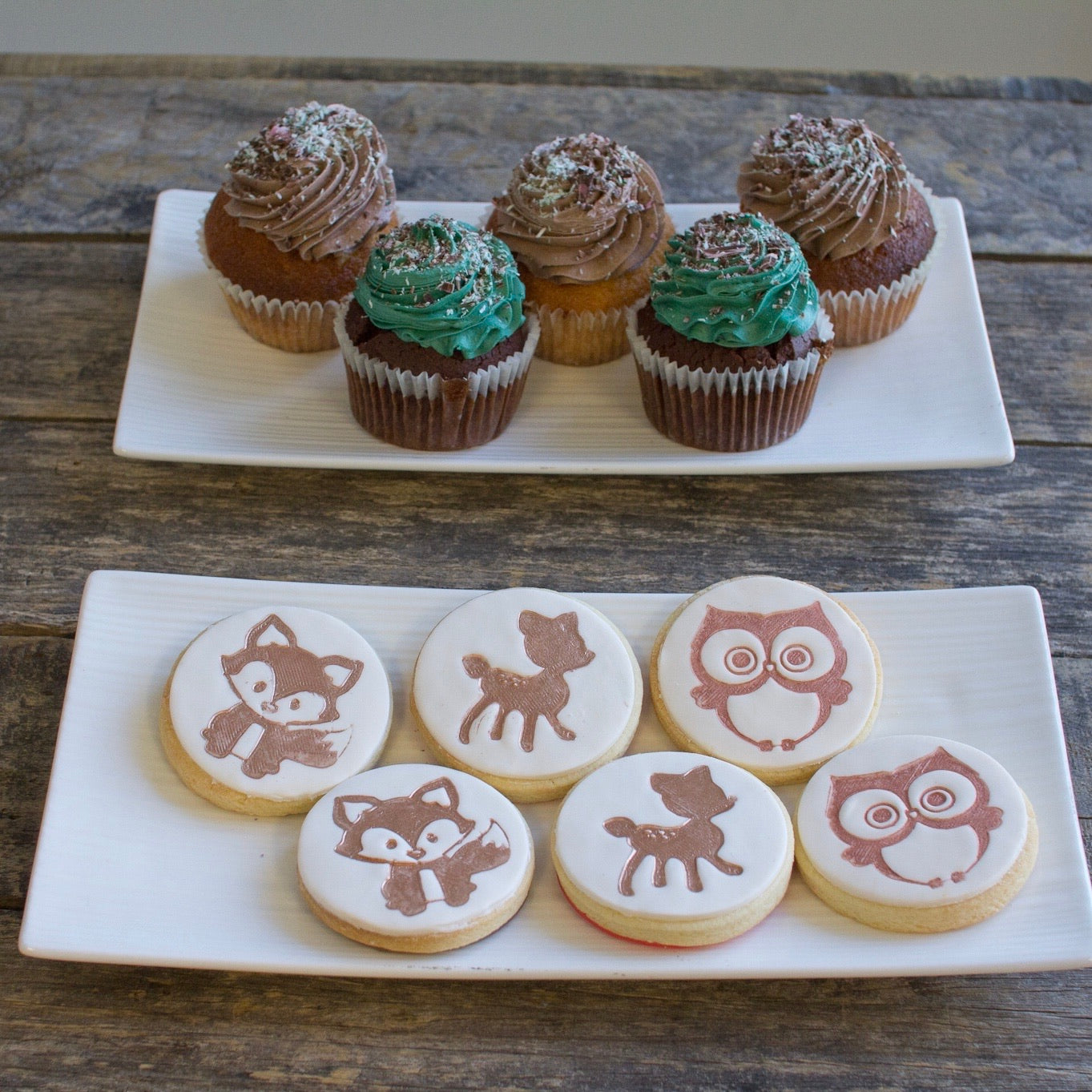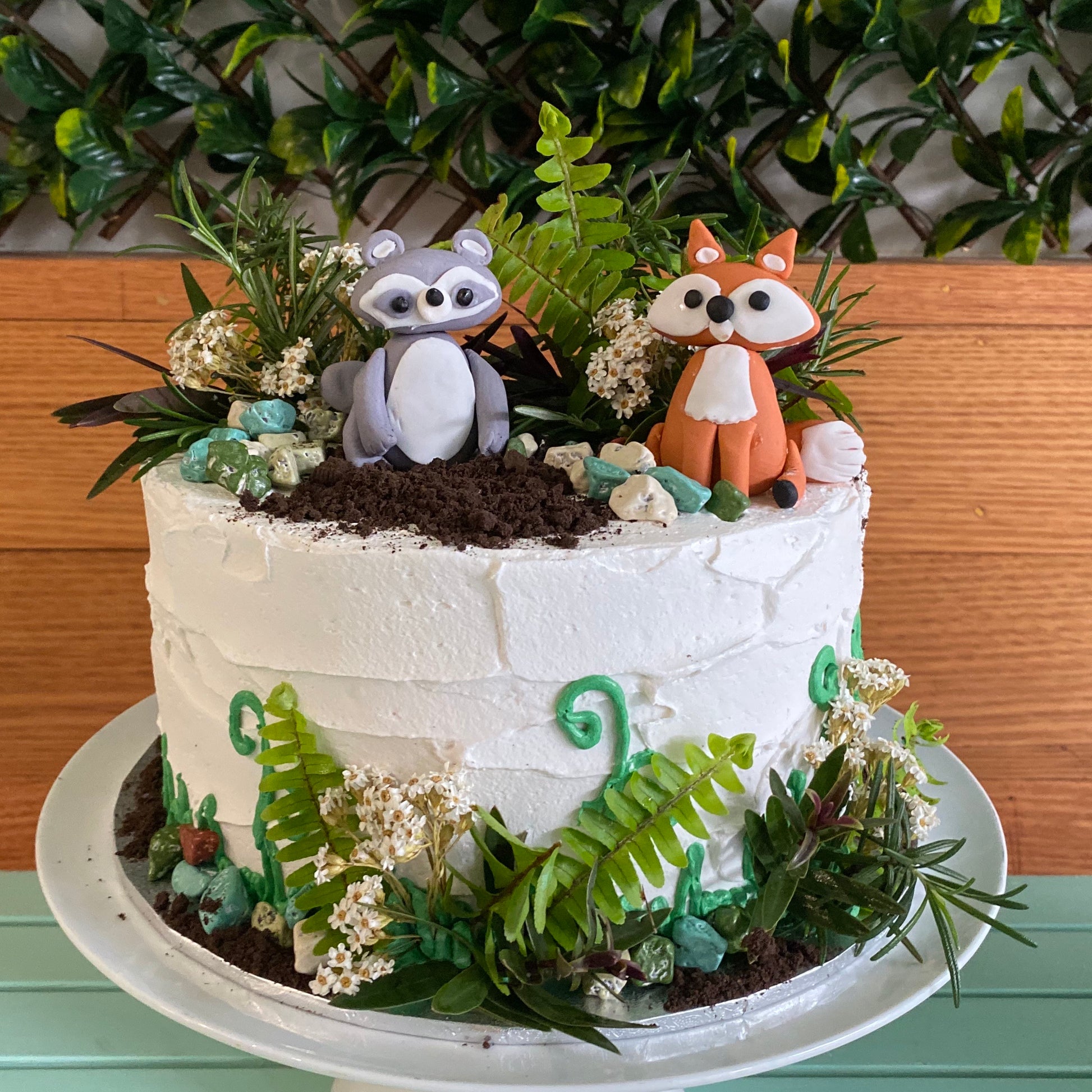 Filled sponge cake smooth buttercream icing, with hand made woodland critters and fresh ferns. Cookies with woodland animal prints and cupcakes to match your cake.